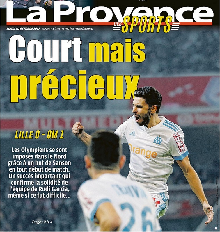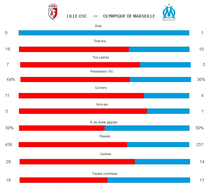 Grâce un but précoce de Morgan Sanson et aux très nombreuses parades de Steve Mandanda, l'OM s'impose sur la pelouse de Lille. Une semaine après son meilleur match de la saison face à PSG à l'Orange Vélodrome, l'OM était en déplacement à Lille. Rudi Garcia a fait confiance à l'équipe qui a réalisé le match nul face aux Parisiens à deux exceptions près. Deux exceptions contraintes et forcées puisque Payet est blessé et Amavi purge un match de suspension. Poste pour poste, Sanson et Evra les remplacent. L'entame de match était marseillaise avec de la possession de balle et du pressing. Sur une percée sur la droite, Thauvin obtenait un coup franc qu'il tirait lui-même après une petite discussion avec Sanson. Les deux hommes s'étaient mis d'accord sur une combinaison qui faisaient mouche. Le natif d'Orléans trouvait en retrait Sanson dont la frappe trompait Maignan. Après seulement six minutes de jeu, l'OM menait au score mais ne parvenait pas à creuser l'écart. Les Olympiens perdaient même peu à peu la maîtrise du match et sans un Mandanda des grands soirs, les Dogues auraient pu rejoindre les vestiaires en ayant marqué au moins un but... Le portier marseillais a en effet sorti 6 parades décisives face à El Ghazi, Amadou et Pépé. Hormis un corner tenté directement par Thauvin et boxé des poings par Maignan, le but de Sanson est la seule occasion olympienne de la première période. Sentant les Marseillais fébriles, les joueurs de Marcelo Bielsa ont attaqué tambour battant la seconde mi-temps. Mais les Olympiens, conscients de leurs difficultés à garder le ballon ont resserré les lignes. Germain a pris la place de Mitroglou en pointe de l'attaque. Les occasions étaient plus rares alors que les duels se sont faits plus nombreux et plus disputés, notamment au milieu de terrain, là où se faisait la plus grande partie du jeu. Germain manquait le cadre de peu sur l'un de ses premiers ballons alors Mendes voyait son centre contré par Rami vers Mandanda qui bloquait le ballon. Rudi Garcia décidait alors de lancer dans le grand bain de la Ligue 1, le jeune Kamara à la place d'Evra qui laissait le brassard de capitaine à Gustavo. Ce dernier tentait dans les dernières minutes une frappe lointaine, détournée en corner par Maignan. Le Brésilien sortait même sur sa ligne la dernière occasion lilloise dans une fin de match sous tension. Très solidaires, les Marseillais se sont arrachés sur tous les ballons pour conserver l'avantage au tableau d'affichage. Ils ramènent ainsi trois points précieux de Lille, stoppent la série de deux matches nuls (3-3 à Strasbourg et 2-2 contre Paris) et pointent désormais à la quatrième place à une longueur des Lyonnais et quatre des Parisiens.
