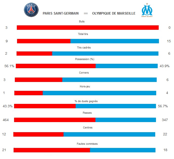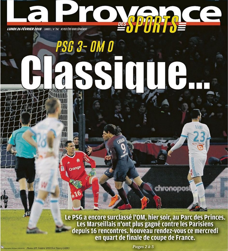 La logique est respectée L'OM n'a pas réussi à marquer au Parc où le Paris SG, malmené en fin de match par de courageux Olympiens, s'est imposé 3-0. Rendez-vous mercredi en Coupe de France. Les Olympiens, concentrés, appliqués, attentifs, débutaient ce " Clasico " avec les ingrédients qu'il fallait face à une équipe parisienne bâtie pour la Ligue des Champions. Dans la continuité du match aller, Rudi Garcia demandait à ses joueurs d'être solidaires, combatifs et rigoureux. D'être à la hauteur de l'événement. Et ils l'étaient. Un bloc assez haut, de la présence dans les duels, rien ne semblait enrayer le collectif olympien jusqu'à ce que Jordan Amavi, malheureux dans son interception, offre à Mbappé l'occasion inouïe d'ouvrir le score (1-0, 10e). Les Parisiens n'en demandaient pas tant. A ce moment-là du match, ce but n'était pas vraiment justifié. Il allait pourtant donner de l'air frais aux Parisiens. L'emprise sur ce match prenait peu à peu la couleur du club de la capitale. Les Olympiens, déterminés, ne parvenaient plus à s'approcher du but d'Areola. D'autant que Neymar, pourtant bien pris par le duo Thauvin-Sakai, parvenait partiellement à perforer la défense olympienne. Comme sur cette action de la 27e minute, quand son centre fort, était détourné dans son propre but bien malgré lui, par Rolando. Mené 2-0 à la demi-heure de jeu, étrangement l'OM ne donnait pas l'impression d'être malmené. Si ce n'est qu'il faut juste se souvenir que cette équipe parisienne ne joue pas dans la même catégorie, tant collectivement qu'individuellement. Après le repos, le scénario du match ne changeait pas d'une ligne. Avec d'un côté une équipe olympienne entreprenante, organisée face une formation parisienne compacte et vêtue de sa tenue européenne. Cavani, servi par Neymar sorti sur civière et qui laissait son équipe à 10 durant le dernier quart d'heure, aggravait le score d'un tir puissant (3-0) assez vite d'ailleurs dans cette deuxième période (55e) symbolisant le réalisme d'un collectif qui se prépare à jouer son avenir en Ligue des Champions dans une semaine face au Real Madrid. Il faut simplement l'admettre, ce soir, la marche était sans doute trop haute même si, n'est-ce pas Gustavo et ses copains qui se procuraient finalement le plus de tirs (13) dimanche soir au Parc ? Zambo et Payet n'ont-ils pas survolé la rencontre dans leur registre ? L'OM profitait du dernier quart d'heure et la sortie de Neymar sur civière qui décidemment ne finira pas un match face à l'OM en 17/18 (avant mercredi), pour pousser et se procurer plusieurs occasions nettes face à dix Parisiens. Notamment par Clinton Njie (73e et 80e) et Bouna Sarr (90e). Un temps fort qui aurait mérité d'être récompensé. Malgré le score, il y a des motifs de satisfaction et des enseignements à tirer en vue du match de mercredi en Coupe de France et surtout pour la fin de la saison.