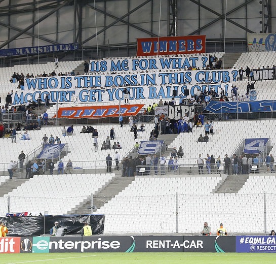 Les deux visages du Vélodrome D'abord frondeurs et vindicatifs, les supporters ont rapidement soutenu leur équipe Cet OM-Konyaspor sentait la poudre... Au propre comme au figuré. Quatre jours après la débâcle face à Rennes (1-3) laquelle faisait suite à l'humiliation subie à Monaco (1-6), un Vélodrome frondeur avait promis l'enfer à Jacques-Henri Eyraud, Rudi Garcia et aux joueurs, à coups de communiqués cinglants et d'appels à la grève. L'avant-match n'a pas confirmé ces craintes d'apocalypse. Tout au long de celui-ci, l'indifférence générale a régné, dans un silence de cathédrale où l'on entendait le mistral siffler et où l'on pouvait presque compter les présents. Puis le virage Sud, où s'étaient massés les abonnés après la fermeture du Nord pour cause d'affluence trop faible, a pris des allures de meeting de la CGT avec une kyrielle de banderoles pour souligner le mécontentement galopant et tirer la sonnette d'alarme. "Vide comme les promesses de Jacques-Henri, la tactique de Rudi", "Pas besoin de SuperEyraud on veut des guerriers", "Evra-le-bol", pouvait-on notamment lire, ici ou là. Les dirigeants s'attendaient à ce qu'un message soit directement adressé à Frank McCourt. Ils n'ont pas été déçus avec un texte dans la langue natale du Bostonien, peut-être incrédule en apprenant la nouvelle : "118 M for what ? Who is the boss in this club ? McCourt, get your balls out !" En venant en France, le propriétaire de l'OM savait qu'on lui demanderait de sortir le carnet de chèques. Mais il ne s'attendait sans doute pas qu'on lui intime d'exhiber ses bijoux de famille, encore moins pour prendre une décision. Le Vel' voulait montrer les muscles Après dix minutes de grève de tribune, les supporters ont gagné leurs places et la tribune Chevalier-Roze s'est embrasée tel un soir de 14 juillet, entre pétards et fumigènes craqués à tout-va. L'espace d'un instant, on a même cru que le match allait être arrêté, la fumée commençant à se diffuser sur la pelouse. Le gardien turc, Serkan Kirintili, s'est même rapproché du corps arbitral pour lui signifier qu'il avait du mal à suivre les actions. Tatillonne en la matière, toujours prompte à infliger des amendes salées, l'UEFA ne devrait pas laisser passer ces écarts de conduite qui ont provoqué l'arrivée de stadiers et CRS au pied de la tribune. Cette agitation, saupoudrée de revendications micros en main de différents capos et des traditionnels "L'OM, c'est nous !", a duré une dizaine de minutes. Le temps de déployer une énième banderole "Ta tisane froide nous a écoeurés, voilà de quoi la réchauffer" et d'entendre les choeurs prendre la relève. La suite ? Changement radical de comportement. S'ils ont sifflé à la pause qui a vu Olympiens et Turcs regagner les vestiaires sur un score nul et vierge, les 8 649 supporters n'ont cessé d'encourager la bande à Dimitri Payet. La clameur a jailli lorsqu'Adil Rami est enfin parvenu à pousser le ballon au fond des filets de Konyaspor, juste après la pause (48). Avant de continuer à chanter sans manifester la moindre réaction lors des trois changements opérés par Garcia. Hier soir, le Vélodrome a affiché deux visages diamétralement opposés comme s'il voulait montrer les muscles et envoyer un nouveau message à la direction. Le calumet de la paix est loin d'être fumé. Auteur : Fabrice Lamperti |