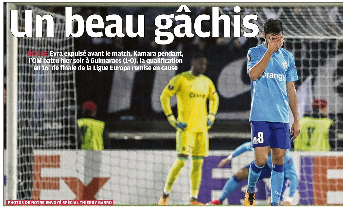 OM : un beau gâchis Evra expulsé avant le match, Kamara pendant, l'OM battu hier soir à Guimaraes (1-0), la qualification en 16e de finale de la Ligue Europa remise en cause Quel gâchis ! L'OM avait l'occasion de se rapprocher de la qualification en éliminant Guimaraes, de gagner enfin au Portugal et de poursuivre sur une bonne série. Mais voilà, l'équipe olympienne a encore oublié de gagner, comme à Salzbourg et a fini par se faire punir par un adversaire inférieur. Sale soirée, avec une remise en cause de la qualification, Konyaspor n'ayant pas cédé non plus, et deux cartons rouges. Le second, dans le jeu, pour Bouba Kamara fait partie des aléas du foot mais le premier, de Patrice Evra, avant le coup d'envoi à la suite d'incidents inédits, est une tache pour le club qui risque de payer cher ce nouveau voyage infructueux au Portugal. Les occasions, il faut les transformer L'OM avait pourtant largement les moyens de gagner ce match. Meilleure circulation de balle, individualités supérieures, occasions... Mais voilà, les occasions, il faut les transformer. Surtout face à un adversaire porté par l'orgueil et l'énergie du désespoir, qui ne voulait pas concéder un nouveau revers et qui avait déjà accroché le Red Bull Salzbourg lors de la première journée dans son antre. Mais pour transformer les occasions, il aurait fallu plus de mordant dans le dernier geste, celui dont a surtout manqué Clinton Njie. Certes, les regrets auraient pu être partagés avec des occasions nettes de part et d'autre, l'OM ayant le mérite d'entrer assez vite dans le match, en dépit d'une poussée initiale des Portugais, alors que l'on pouvait craindre que les incidents de l'échauffement n'aient détourné les joueurs de leur objectif. Il est vrai que sur le terrain, ça a vite été électrique, les joueurs de Guimaraes, comme à l'aller, laissant volontiers traîner la semelle, surtout sur Lopez et Sanson, le jeune Kamara ne se laissant pas impressionner et mettant lui aussi du coeur à l'ouvrage en matière de contacts musclés. Trop en définitive, puisqu'il a fini par prendre un carton jaune puis un rouge. 4-4-2 puis 4-2-3-1, rien n'y fait L'OM en a toutefois profité pour se créer des occasions. Les regrets sont là. Dans ces frappes de Clinton Njie, l'une dans les bras de Silva (29), l'autre beaucoup trop molle (42), sur une remise intelligente de la tête de Valère Germain, au terme d'une belle action collective Sarr-Lopez-Sanson. Le pompon venant à l'heure de jeu, avec une tentative encore trop molle de grand pont sur le gardien, vers lequel Luiz Gustavo l'avait habilement lancé. On reprochera moins au Brésilien de n'avoir pas cadré son tir à terre et on ne comprend pas trop comment Morgan Sanson a pu rater le cadre, de la tête sur un centre d'Amavi, juste avant la pause. Ceci compensant cela, Rafael Martins venait lui aussi de manquer deux occasions en or, la première fois en étant contré par Rami, sur un centre de Konan, et la deuxième en croisant trop sa reprise au premier poteau. Pour essayer de déstabiliser l'équipe portugaise, Rudi Garcia avait alterné entre le 4-4-2 du coup d'envoi, avec Sanson à gauche et Njie aux côtés de Germain, et un 4-2-3-1 classique, avec le Camerounais à gauche et Sanson en neuf et demi, mais c'est la sortie de Luiz Gustavo qui a fini par déséquilibrer l'équipe, même si, en sa présence, Rafael Martins avait tiré sur la transversale et Raphinha sur Mandanda. Comme à Salzbourg, l'OM a fini par céder sur un centre de Heldon, repris de la tête par Hurtado. Le gâchis complet... Auteur : Mario Albano |