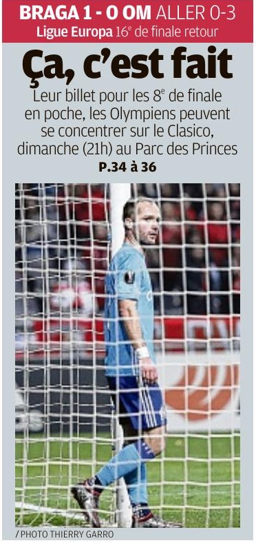 Les Olympiens ont souffert en première période à Braga. Heureusement, la défaite n'a pas de conséquence sur la suite de la compétition pour la maison bleue et blanche Le match : l'OM a (un peu) tremblé Largement dominés en première période, les Olympiens ont concédé de nombreuses occasions franches. Mais heureusement pour l'OM, la maladresse des attaquants portugais ne leur a pas permis de faire véritablement douter la formation de Rudi Garcia. C'est finalement Ricardo Horta qui a ouvert le score après plus d'une demi-heure de jeu. À la conclusion d'un superbe mouvement collectif, le milieu de terrain de Braga a placé une reprise de volée à bout portant qui n'a laissé aucune chance à Yohann Pelé (1-0, 32e). Dès le retour des vestiaires, Rudi Garcia a modifié ses plans. Exit Clinton Njie - trop discret en première période - et place à l'entrée en jeu de Frank Anguissa. Le Camerounais a alors apporté sa puissance physique en seconde période et l'OM a repris le jeu à son compte. Mais l'inefficacité de l'attaque olympienne a maintenu un semblant de suspense jusqu'aux dernières minutes de la partie. Le joueur : Luiz Gustavo (6,3/10) Sans son maître à jouer brésilien, l'OM n'affiche pas du tout le même visage. Même s'il n'a pas été décisif, son emprise sur le jeu olympien est indéniable. Il a été présent sur plusieurs moments chauds dans la surface de réparation olympienne. Indispensable ! La question : quel adversaire pour l'OM en 8es de finale de la Ligue Europa ? Arsenal, le Milan AC, l'Atlético de Madrid, le Borussia Dortmund, la Lazio Rome... ou encore l'autre club français encore en lice en Ligue Europa, l'Olympique Lyonnais. L'OM peut tirer l'une de ces grosses cylindrées demain en milieu de journée (13h) lors du tirage au sort des 8es de finale de la Ligue Europa à Nyon. Du lourd donc ou du un peu moins lourd également... Le suspense reste entier jusqu'à demain 13h. La décla : "On peut penser à dimanche" (Rami) L'esprit déjà tourné vers le Clasico de dimanche face au PSG, le défenseur olympien Adil Rami s'est exprimé au micro de Bein Sports après le coup de sifflet final : "On avait en tête de jouer haut, de presser, de marquer pour gagner ce match-là. Psychologiquement c'est embêtant, c'est une épine dans le pied car on voulait continuer sur notre lancée, gagner tous nos matches. Maintenant, l'essentiel est fait, on est qualifiés, on peut penser petit à petit à dimanche." Le chiffre : 1 Comme la première défaite de l'OM en 2018 toutes compétitions confondues. Les Olympiens vont enchaîner avec un double Clasico (dimanche en Ligue 1 et mercredi en quarts de finale de la coupe de France). Auteur : Pierre-Antoine Trossero |