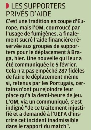 Un OM beaucoup moins convaincant a conservé son avantage à Braga Voilà, c'est fait, l'OM est en huitièmes de finale de la Ligue Europa. Certes, après une nouvelle défaite en territoire portugais où le club marseillais n'a jamais gagné, mais l'avance prise à l'aller s'est révélée suffisante comme on pouvait l'imaginer. On va pouvoir rêver à Moscou, Milan, Dortmund ou Bilbao pour espérer des affluences un peu moins rachitiques au Vélodrome. On ne peut pas dire que l'OM aura poinçonné son ticket dans la facilité, mais au moins il l'a fait, sans véritablement trembler et en laissant l'espoir s'évanouir peu à peu dans le camp adverse après quelques illusions. En premier lieu, ce n'était pas du tout la même équipe de Braga. Mais cela, on s'en doutait avant le match, tant la meilleure équipe portugaise après les trois grands (Benfica, Sporting et Porto), avait été indigne de son niveau la semaine dernière au Vélodrome. Or, l'OM n'étant pas non plus aussi mordant que le jeudi précédent, la première période tourna assez vite à l'avantage de Braga en termes d'occupation du terrain et de possession de balle. L'OM manquait trop de conviction et d'esprit de décision dans ses actions offensives pour mener à leur terme des échanges techniques souvent intéressants, notamment avec Lopez, mais gâchés à plusieurs reprises par des hors-jeu de Njie, par des tergiversations, des conduites de balle trop longues de Ocampos et pas assez de frappes. Deux petits ponts, de Lopez et de Njie en moins de cinq minutes de jeu, mais pas un essai au but avant la 24e minute et une reprise de la tête croisée de Njie sur un centre de Sarr. Symbolique d'un jeu trop stérile devenant gestion plan-plan au fil des minutes. Et aussi Secoué en première période à Braga, l'OM assure l'essentiel : la qualification en 8es de finale de la Ligue Europa Un seul but de Horta Si Braga était resté maladroit à l'image de Hassan simulant une faute dans la surface et récoltant un avertissement, alors qu'un bon centre l'avait trouvé seul et bien placé, cette retenue olympienne n'aurait pas prêté à conséquence, comme sur ce tir d'Eduardo Wilson partant trop haut après une perte de balle de Sakai. Mais à trop jouer avec le feu, on finit par se brûler... Moralement, la série de coups de pied arrêtés de la demi-heure de jeu, avec les montées de Raul Silva surveillé par Rolando et les dégagements de la tête de Luiz Gustavo finit par convaincre Braga que la mission n'était pas impossible. Le but de Ricardo Horta est donc survenu comme une chose inéluctable au bout d'une belle action collective, d'un centre, d'une remise et d'une volée d'un milieu portugais laissé trop seul dans la surface. La preuve d'un nécessaire réajustement et d'un ajout de tonus dans le jeu olympien est venue de l'apport d'Anguissa qui, en remettant la machine dans le sens de la marche, permit à Sanson d'avoir plus d'influence créatrice et procura de belles occasions à l'OM. Là encore, il faut distinguer la maladresse d'Ocampos, trop gauche balle au pied, des réflexes de Matheus, sauvant par deux fois son camp, d'abord sur une double reprise à bout portant de Germain, ensuite sur une tête plongeante d'un étonnant Sakai, les deux servis par un Sanson très précis. De fait, malgré la volonté portugaise, le jeu s'équilibra et s'il n'y avait eu un dégagement au pied imprécis de Pelé pour procurer à Wilson une occasion contrée par Luiz Gustavo, rien de cadré ne vint menacer le gardien olympien, Braga s'éteignant peu à peu tandis que les chants des supporters marseillais nous envoyaient déjà à Paris... Auteur : Mario Albano |