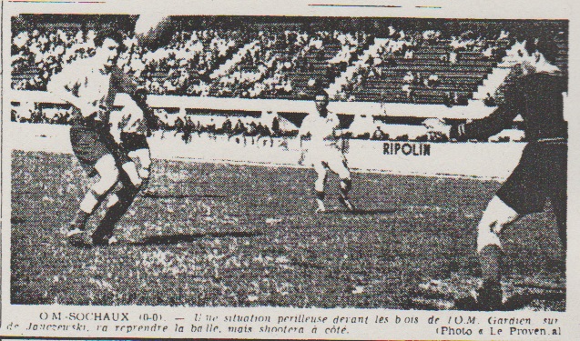 Un soleil radieux à présider ce match O.M.-Sochaux qui n'a été suivit que par 10.000 spectateurs. M. Garreau donna le coup d'envoi à l'heure précise et dès la 6e minute, le team doubiste fut handicapé, Courtois souffrant d'une talonnade. A la 9e se situa la première action dangereuse sur une faute de Salem. Buret s'échappa de l'aile droite, shoota dans sa foulée. Poncet plongea et renvoya en corner des deux mains. A la 19e minute, Sboralski fit une tête qui passa à coté ; à la 21e minute sur un tir de Nekache un deuxième corner fut concéder par Fragassi ; à la 23e minute, Flamion botta très haut. Reynier (29e minute), Courtois (34e minute) et Bruay (36e minute) réagirent mais leurs essais aboutirent tous sur la poitrine de Poncet. A la 16e minute, Marseille faillit ouvrir le score. Sboralski dans sa foulée expédia un bolide qui s'écrasa sur la barre, Fragassi était battu. Deux minutes après la reprise, Gandien manqua une occasion encore plus sensationnelle ; sur une passe de Janczewski, à cinq mètres de la cage, alors qu'il était dans une position idéale, il rata l'encadrement des filets ! A ce moment, une douce somnolence s'empara des deux onze, mais en particulier des locaux qui parurent heureux de se contenter du draw. Quant aux Sochaliens entrevoyant la possibilité merveilleuse d'arracher un point, ils replièrent leur ligne médiane, et c'est ainsi que nous baillâmes en assistant à un lent combat à distance. Durant ce half, on nota une redoutable percée de Flamion à la 50e minute, qui fut démolie part le poing de Fragassi ; deux corners pour l'O.M., un tir à coté de Sbo et quatre shots "nuageux" de Gardien (50 et 83e minute), Bruat (68e minute) et Reygnier (81e minute)