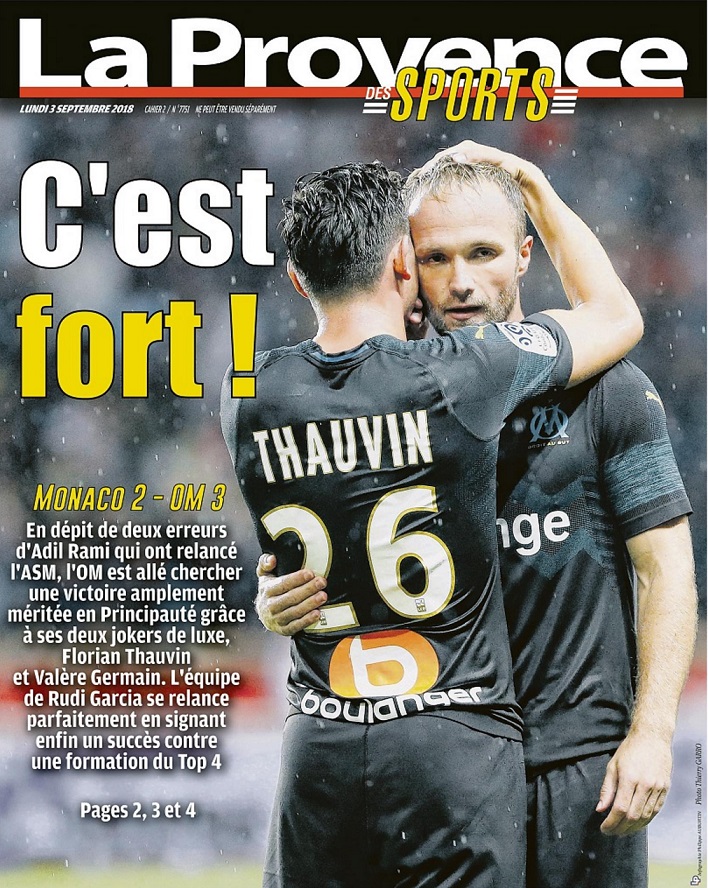 Au bout du suspens l'OM s'impose dans ce premier choc de la saison face à Monaco, 3 à 2. Une première période séduisante et la fin d'une série. Les Olympiens ont affiché un visage plus qu'intéressant dans le premier acte. Beaucoup de duels gagnés, un jeu épuré et beaucoup plus plaisant à voir. Un bon mix proposé par les hommes de Rudi Garcia face à une équipe monégasque acculée. L'OM a beaucoup plus tenté que Monaco et a été récompensé dans le temps additionnel par Kostas Mitroglou (45+2'). L'avant-centre titularisé pour la première fois depuis le début de la saison, catapulte de la tête un centre de Payet auteur de sa 11e passe décisive en Ligue 1 en 2018. Par la suite, les Olympiens s'imposent malgré le retour de l'ASM dans le second acte et brisent la série sans victoire à Monaco, depuis 2010. Kevin Strootman titulaire pour sa première. Rudi Garcia a fait confiance directement à sa nouvelle recrue Kevin Strootman. L'international néerlandais a débuté la rencontre dans le onze olympien. Du haut de ses 28 ans, le milieu de terrain positionné aux côtés d'un Morgan Sanson énorme, a joué simple et bien. Solide dans ses récupérations (6) sa partition a été très juste et rassurante pour la suite. Ses coéquipiers peuvent compter sur lui et c'est une bonne nouvelle pour l'OM. Kostas Mitroglou et Florian Thauvin buteurs. Auteur d'une première période plus qu'honorable à la pointe de l'attaque, Kostas nous a gratifié d'une ouverture du score et d'une belle prestation. Entre son petit pont et ses déviations de qualités, le Grec s'est offert son premier but de la saison en L1. De son côté, Florian Thauvin a inscrit son 17 buts en Ligue 1 en 2018. Pour information seuls Lionel Messi (23) et Cristiano Ronaldo (22) font mieux dans les 5 grands championnats européens sur cette période. Entré en jeu en seconde période, l'international français a sonné la révolte des siens (74e et 90e) avec un but et une passe décisive. Falcao sourit à l'OM, Germain à Monaco. Il y a des équipes qui portent chances à des joueurs. C'est le cas de l'OM pour Radamel Falcao. Le Colombien décisif sur les deux buts de son équipe y est allé de sa réalisation (53e). Une habitude pour l'ancien colchonero face aux Olympiens puisqu'il a inscrit son 5e but contre Marseille ce soir. Il ne fait pas mieux face à une autre formation en France. Et puis il y a Valère Germain. L'attaquant de l'OM retrouvait ses anciens coéquipiers et de quelle manière. Trois minutes après son apparition sur la pelouse, il délivre les supporteurs olympiens d'une tête (90e), après un corner botté par Thauvin. Germain permet à l'OM d'empocher trois points importants au bout du suspens et répond magnifiquement à Falcao. Les supporters Olympiens toujours là. Comme d'habitude l'OM a pu compter sur la ferveur sans failles de son public. Le court déplacement à Monaco a permis aux supporters de venir en nombre soutenir le club. Dans leur parcage, les drapeaux et tambours étaient présents pour encourager les Olympiens à ne pas lâcher dans les moments difficiles de la rencontre. Le "Aux armes" à la 77e minute de jeu après l'égalisation de Thauvin aura résonné comme un seul homme dans les travées de Louis-II. Ils ont également explosé de joie sur la délivrance de Germain en fin de rencontre. |