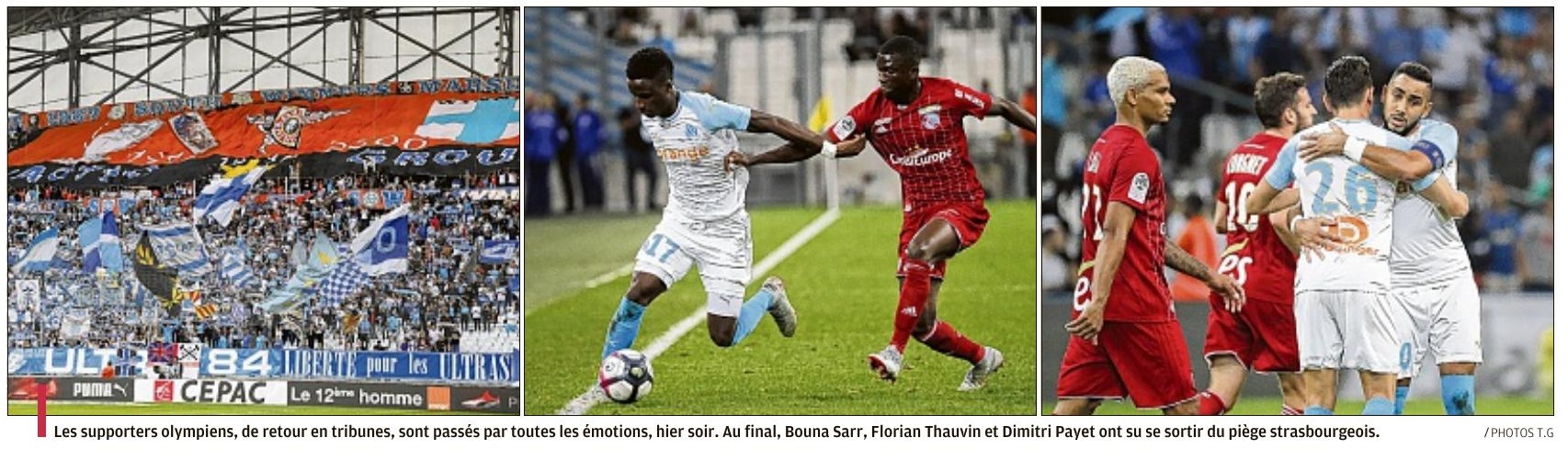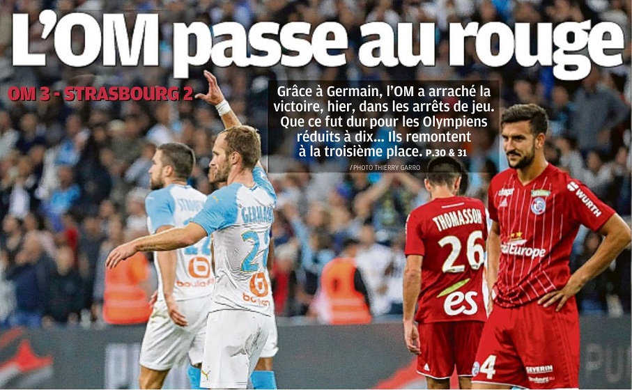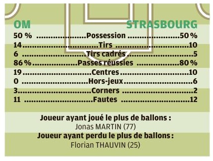 Au terme d'un match riche en émotions, l'OM est venu à bout du Racing Club Strasbourg 3-2. Les hommes de Rudi Garcia s'emparent, grâce à ce succès, de la troisième place du classement. Au mental ! Tout est allé à l'encontre des Olympiens. Il y a eu d'abord une ouverture du score sur le seul tir strasbourgeois de la première mi-temps. Mais l'OM a réagi sur un penalty de Dimitri Payet (41e), puis grâce à une merveille de frappe dans le petit filet (44e) de Morgan Sanson. Même après l'expulsion de Jordan Amavi (52e), l'OM est resté groupé et s'est même procuré les meilleures occasions en fin de partie. L'égalisation de Da Costa a paru sévère mais grâce à un superbe rush sur le côté gauche de Hiroki Sakai, bien lancé par Strootman, Valère Germain a donné la victoire à l'OM dans un Orange Vélodrome tout heureux. Boubacar Kamara a rayonné Son calme ne laisse jamais transparaître qu'il n'a que 18 ans. Ses interventions justes, sa science du placement et son excellente relance ont été précieuses à l'OM tout au long de la rencontre. Il a remporté tous ses duels dans la partie et récupéré 7 ballons. Il a déjà été associé à Luiz Gustavo. Ses deux-là s'entendent à merveille. Et son ainé peut -sans doute- être fier de son cadet. Payet dans tous les bons coups Mené 0-1 après l'ouverture du score de Kenny Lala, l'OM est revenu dans le match, et son capitaine, Dimitri Payet, a été l'un des moteurs du renversement olympien. C'est sa belle ouverture sur le côté droit, qui a trouvé Florian Thauvin. Ce dernier a ensuite été accroché avant que l'arbitre ne désigne le point de penalty. Un penalty transformé par Dimitri Payet. C'est ensuite sa passe mal renvoyée qui a terminé dans la course de Morgan Sanson. Ce dernier a redonné l'avantage à l'OM. L'OM remonte sur le podium A la faveur de cette victoire au forceps, l'OM a repris sa marche en avant. Ce succès permet à l'équipe de Rudi Garcia de reprendre la troisième place au classement à la faveur de la défaite lilloise à Bordeaux. L'OM est toujours à hauteur de Lyon, deuxième, avec le même nombre de points. Seule la différence de but sépare les deux équipes. Un public au diapason 47.000 personnes ont garni l'Orange Vélodrome. L'horaire, 19h, n'était pas en leurs faveurs. Mais la dramaturgie a été au rendez-vous ce mercredi. Pour sûr, les présents ont eu leur lot d'émotions. Il fallait entendre la clameur descendue des tribunes au moment du troisième but de Valère Germain. Le public a ensuite donné de la voix dans une fin de match crispante, mais au dénouement espéré. |
