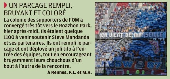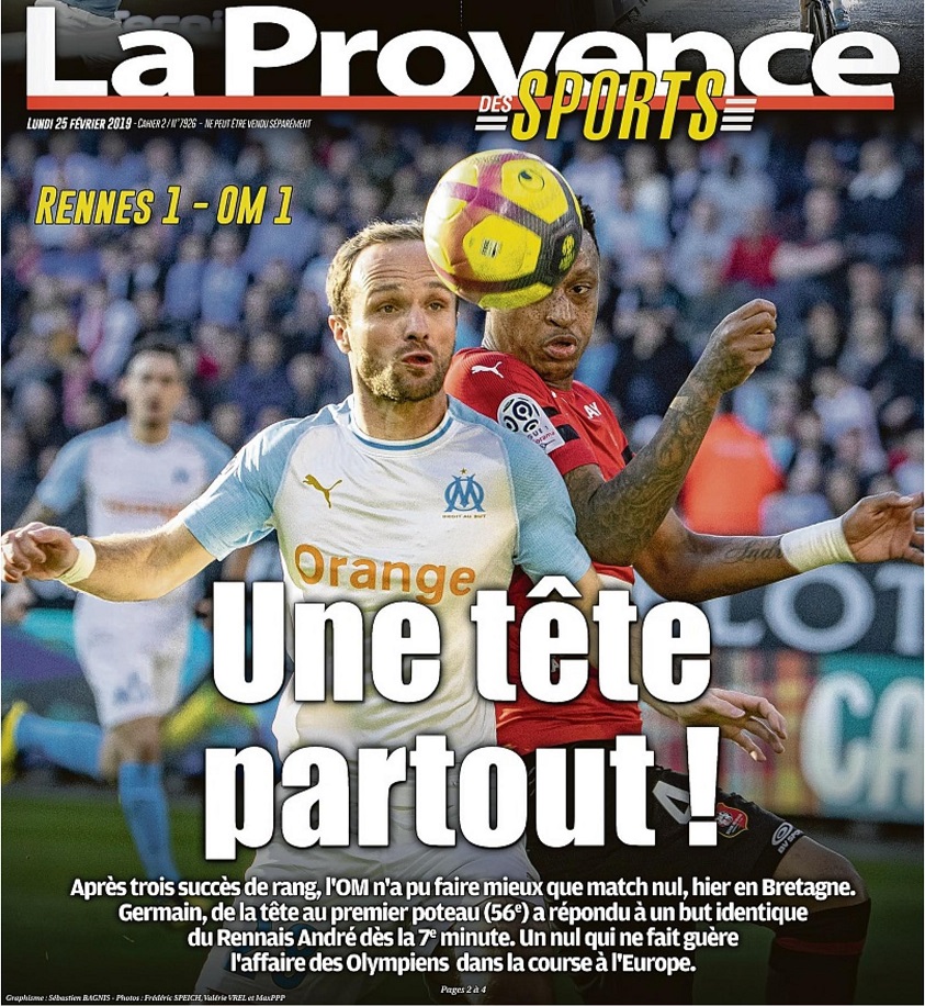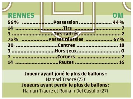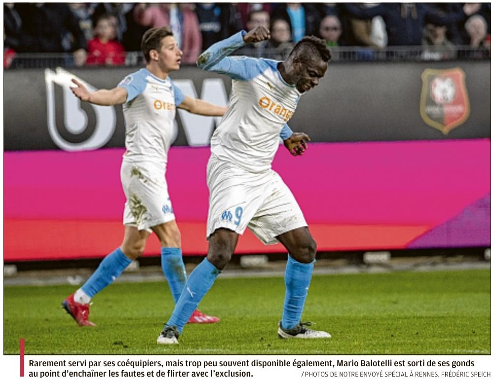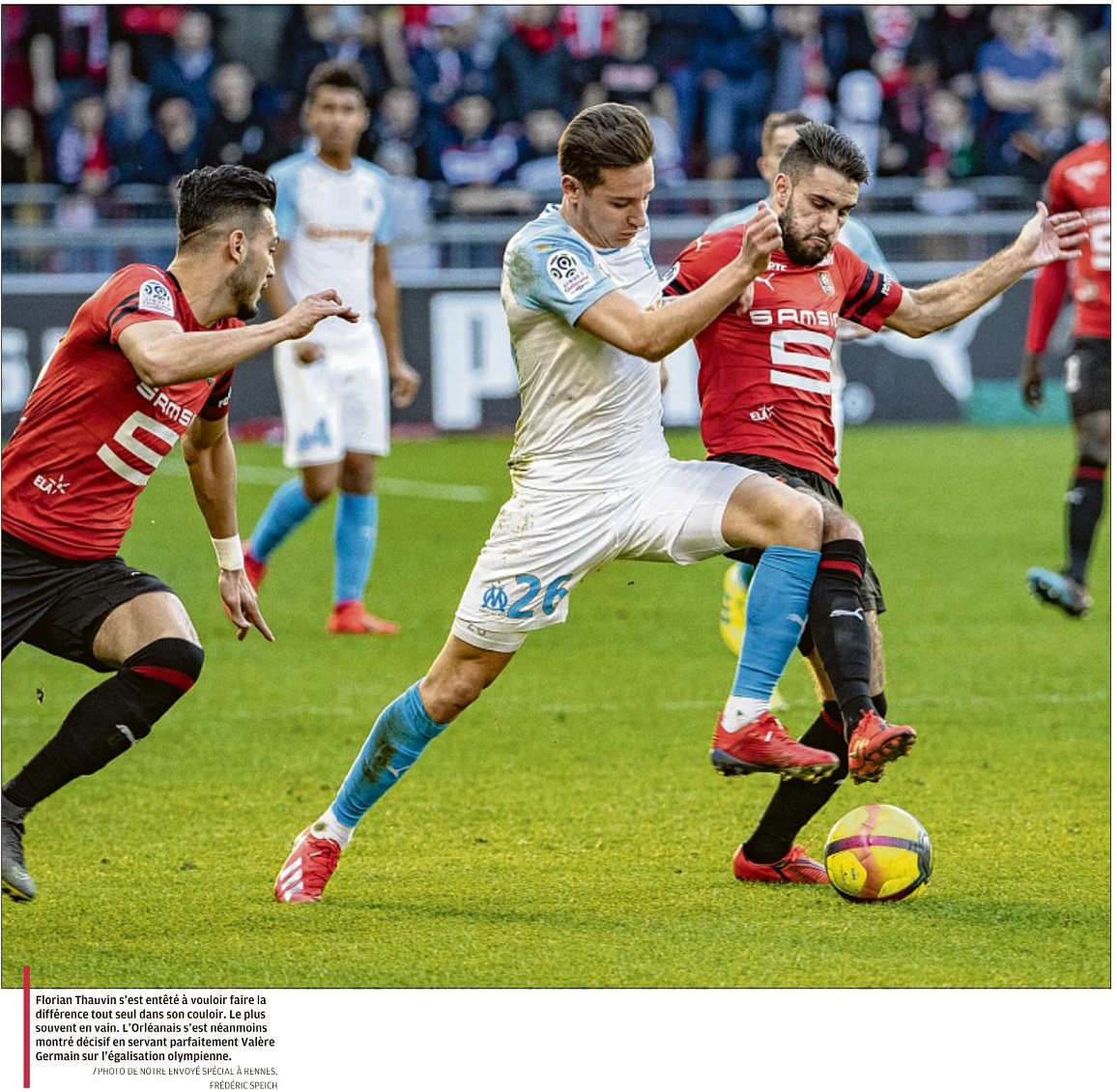 Rennais et Olympiens se quittent dos à dos dans cette 26e journée de championnat. André (7e) avait ouvert le score pour Rennes, avant l'égalisation de Germain (56e). L'OM cueilli à froid Pleine de bonne volonté l'équipe de Rudi Garcia s'est fait surprendre rapidement, sur une pelouse abîmée du Roazhon Park. Del Castillo sur le premier corner du match trouve André. L'ancien ajaccien claque le ballon d'une tête puissante, légèrement contrée par Balotelli. Mandanda dévie également la tentative rennaise mais la balle termine sa course au fond du filet (7e). Un début d'après-midi sans réussite pour les Olympiens, qui empocheront tout de même un point du match nul. Valère donne espoir Après un premier acte pauvre en occasions pour l'OM, Valère Germain trouve la faille sur coup de pied arrêté. Cette fois-ci c'est au tour des Olympiens de marquer sur leur premier corner du match. Lopez le négocie avec Thauvin. L'international français dépose son ballon premier poteau où Germain fait la différence. Au duel avec Da Silva, le numéro 26 bleu et blanc, trompe Koubek d'une tête. Valère sort de ce duel avec une grosse bosse sur le front, mais avec une égalisation décisive pour la suite du championnat. Muet depuis septembre dernier, l'ancien monégasque avec son 4e but de la saison, en profite pour retrouver les joies du buteur. Des retours décisifs Si l'OM n'a pas réussi à empocher les fameux trois points en terres rennaises, les Olympiens ont su ne pas les perdre totalement. Boubacar Kamara et Steve Mandanda ont été présents plusieurs fois dans les temps fort adverses. Dès la 10e minute de jeu, le défenseur espoir français sort en tant que dernier rempart, une frappe cadrée de Del Castillo, présent pour faire le break. Costaud dans de nombreux duels face à Niang notamment (1e, 88e), Kamara a été décisif plusieurs fois. Puis, Steve Mandanda, capitaine à nouveau dans les rangs marseillais, a su sortir la parade qu'il fallait (76e), sur la frappe croisée de Niang en pleine course dans la surface. Rudi Garcia renouvelle Le coach olympien a décidé de renouveler ses choix. Après le dernier succès face à Amiens en championnat, Rudi Garcia compose le même onze majeur. Mario Balotelli et Germain se retrouvent à nouveau à la pointe de l'attaque de l'OM, dans un 4-4-2. La doublette centrale Kamara-Caleta Car, s'installe aussi petit à petit comme un incontournable du schéma tactique. Faire le plein à la maison L'OM a l'occasion de réagir de manière positive dès la semaine prochaine. L'ASSE juste devant les Olympiens au classement, se déplace à l'Orange Vélodrome. Une rencontre à bien négocier, avant de recevoir l'OGC Nice, à domicile une nouvelle fois dans la foulée.