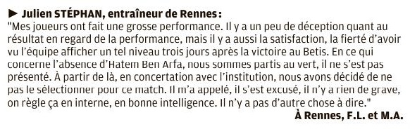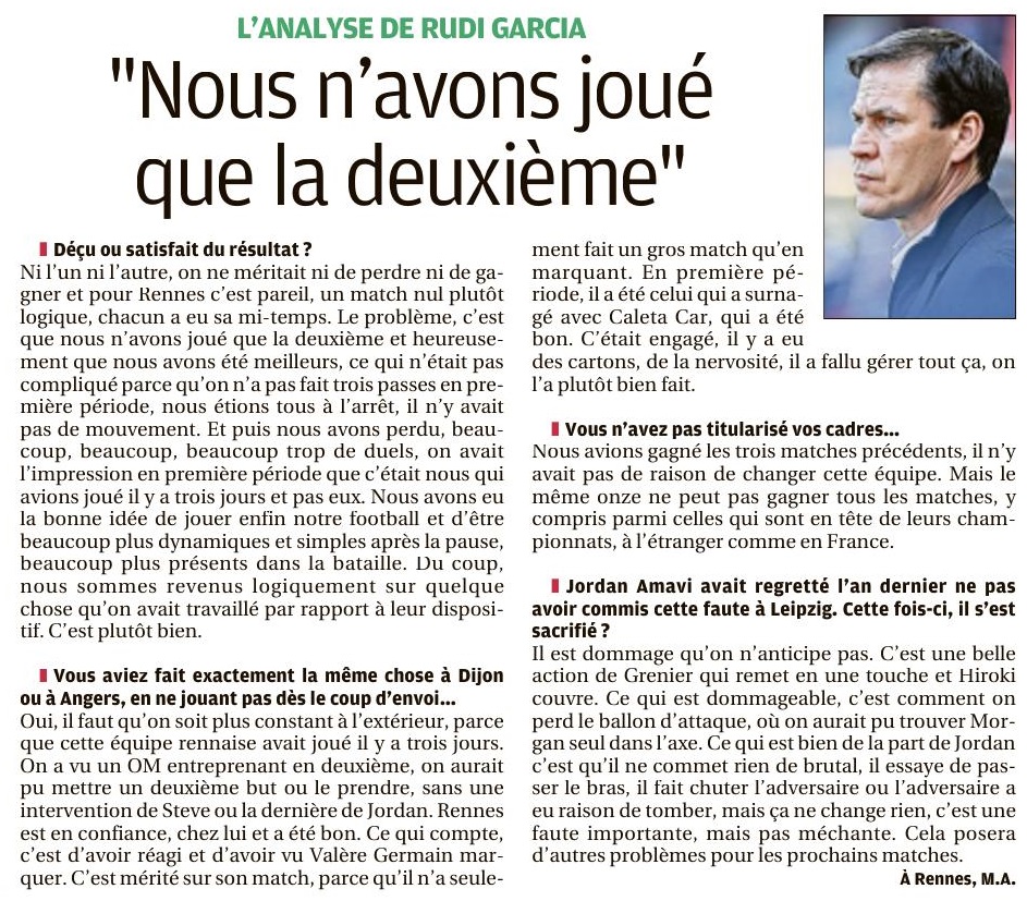 L'OM a totalement raté sa première période, mais a su réagir pour égaliser face à des Rennais qui avaient la Ligue Europa dans les jambes Mais qui avait les jambes lourdes et la tête à l'Europe ? Qui devait prendre l'adversaire à la gorge et l'épuiser, trois jours après un exploit en Ligue Europa et un voyage fatigant ? Qui a dormi en début de match et perdu ses duels ? Toutes ces questions ont des réponses à l'inverse de la logique, à l'inverse de ce que l'on attendait et ce n'est vraiment pas à l'honneur de l'OM, mais à celui du Stade rennais, qui s'est montré digne de son exploit, pour communier avec son public et ne pas lâcher prise dans la course à la (re)-qualification européenne. "72 heures après le match de Séville, être capables de faire un match d'une telle intensité, d'appréhender le début de match de cette manière-là, je trouve que c'est extrêmement positif, souligne d'ailleurs Julien Stéphan. Nous ne voulions surtout pas subir leur pressing en début de match, imposer notre tempo, ce que les joueurs ont très bien fait, en allant les chercher, en étant agressifs, haut sur le terrain. " À quoi Rudi Garcia répond en acquiesçant : "Nous devions presser haut et nous avons joué relativement bas en première période, c'est nous qui nous sommes fait presser, nous étions lents dans les enchaînements, mais quand il n'y a pas de solution pour le porteur, c'est compliqué." Réveil après la pause L'OM peut vraiment avoir honte de sa première période, disputée sans rythme, sans entrain, avec une forme de condescendance et en se faisant bouffer au milieu. Le but rennais, certes, est une sorte d'accident. Le premier qu'encaisse l'OM sur corner en Ligue 1 cette saison (avec celui pris en coupe à Andrézieux). "Nous sommes malheureux sur le but parce que c'est Mario qui la dévie, je ne sais pas où allait le ballon, Steve nous le dira", regrette l'entraîneur olympien, qui ajoute toutefois : "Ce qui est sûr c'est qu'on a perdu le duel, même si le corner est bien frappé, on devait faire mieux sur cette situation-là." On peut ajouter que ce corner est arrivé, comme souvent le danger au cours de la première période, à la faveur d'une montée d'un Traoré supersonique, en soutien d'un Sarr lui aussi très remuant. D'ailleurs, peu après le but d'André, sur ce corner repris au premier poteau, un nouvel enchaînement débordement-centre en retrait allait valoir à Del Castillo l'occasion d'une frappe repoussée par Kamara. Et ensuite, Steve Mandanda devait s'envoler sur un coup franc "juninhesque" de Grenier. Oui, bien sûr, comme le lièvre de la fable, l'OM a fini par se réveiller après la pause, Balotelli déclenchant deux frappes avant que Sanson n'obtienne un corner sur lequel la combinaison Lopez-Thauvin (qui n'a pas servi à grand-chose par ailleurs) a permis à Valère Germain de marquer son premier but depuis septembre. Si le Marseillais avait pu doubler la mise, sur un ballon mal renvoyé par un Koubek hésitant, peut-être les Rennais auraient-ils accusé le coup. Mais le contraire s'est produit. Sans un nouvel arrêt de Mandanda et un geste d'Amavi arrêtant Hunou lancé vers le but olympien, le petit point du nul aurait même échappé à l'OM. "Amavi s'est sacrifié, faute et intelligent, ces deux mots-là ne vont pas ensemble, ça me choque quand ils sont associés, mais il s'est sacrifié", a commenté l'entraîneur rennais. Amavi ne sera donc pas là ni contre Saint-Étienne, ni face à Nice, matches qu'il faudra de nouveau gagner pour reprendre la marche en avant et effacer cette sale impression qu'un nouveau coup de mou vient laisser dans un ciel qui semblait enfin sans nuage. Auteur : Mario Albano |