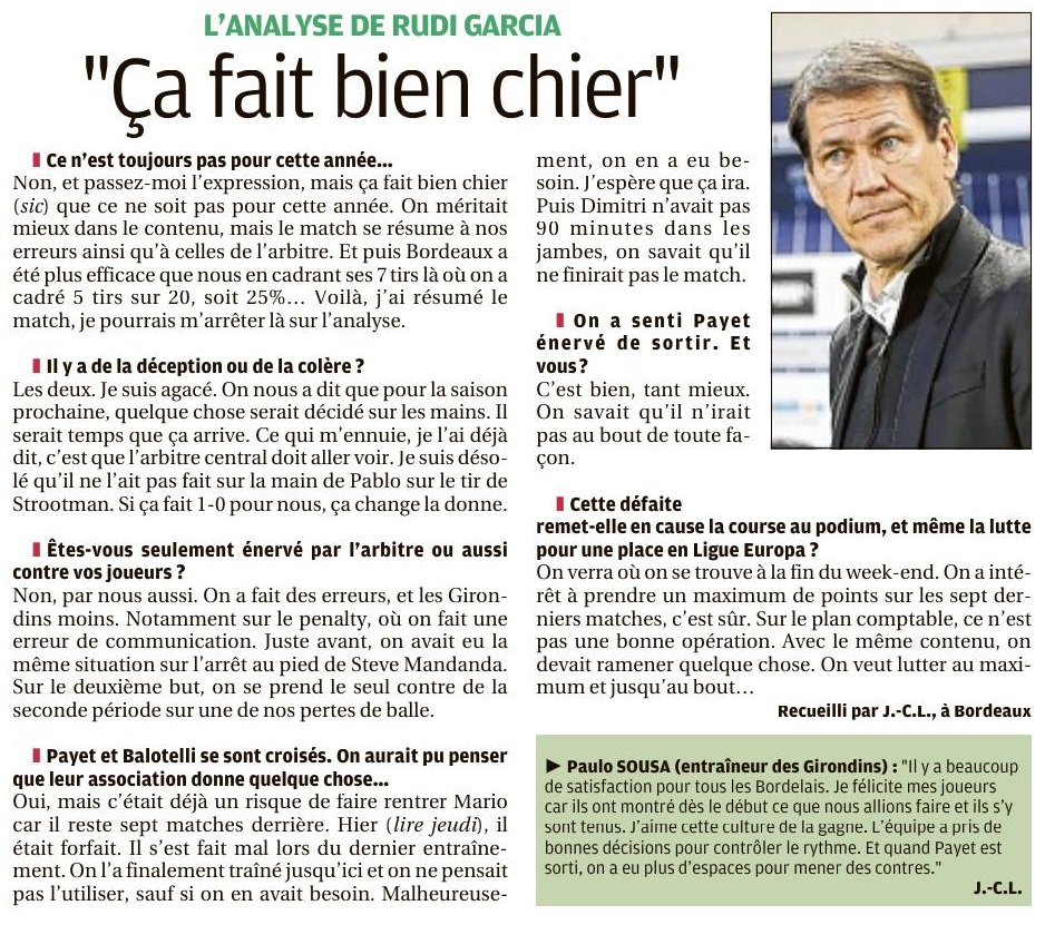 La série noire de l'OM à Bordeaux continue. Les Olympiens se sont inclinés 2 buts à 0 face à des Girondins réduits à dix en fin de partie. Retour au 4-2-3-1 pour l'OM Depuis l'arrivée de Balotelli, Rudi Garcia avait pris l'habitude de faire évoluer ses hommes en 4-4-2 mais avec l'incertitude concernant le buteur italien qui a débuté la partie sur le banc, l'entraîneur olympien est revenu au 4-2-3-1. Dimitri Payet a retrouvé une place de titulaire, pour la première fois en L1 depuis la 21e journée (Caen 0-1 OM) et le brassard. Pour compenser l'absence d'Ocampos, Radonjic était en charge du flanc gauche. Le Serbe n'avait plus démarré un match de championnat depuis la 23e journée (Reims 2-1 OM). Strootman, titulaire pour la première fois depuis la 24e journée (Dijon 1-2 OM), a pris la place de Sanson à côté de Lopez devant la défense. Derrière, Mandanda et Sakai, aligné à droite suite à l'exclusion de Sarr la semaine dernière, ont retrouvé leur poste après leur suspension contre Angers (2-2). Troisième penalty de rang Après les penalties concédés et transformés par Mangani aux 36e et 76e minutes face à Angers à l'Orange Vélodrome lors de la 30e journée de Ligue 1 Conforama, l'Olympique de Marseille a de nouveau encaissé un penalty face à Bordeaux. Suite à une main de Radonjic dans la surface de réparation, Kamano a ouvert le score à la 27e minute. Les trois derniers buts encaissés par les Olympiens l'ont été sur penalty... L'OM a concédé 9 penalties en L1 cette saison, c'est le record dans les 5 grands championnats européens. Une place en danger Cinquième avant la rencontre, l'OM, premier à jouer dans cette 31e journée de L1 n'a évidemment pas gagné de place après la défaite à Bordeaux. Mais les Marseillais devront regarder dans le rétroviseur et suivre les résultats de Reims et de Montpellier, les deux équipes qui pourraient doubler l'OM en cas de succès. Dimanche après-midi, les Champenois reçoivent Lille et les Héraultais se rendent à Nice. |