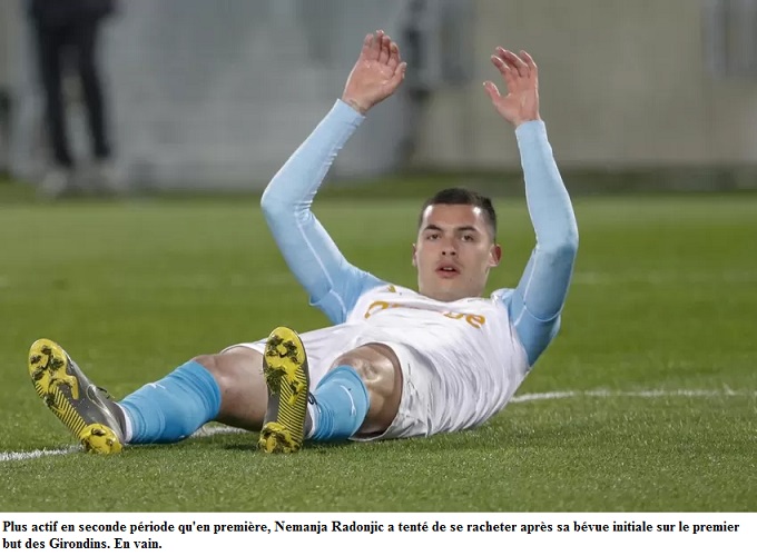 Aligné en l'absence d'Ocampos, le Serbe a provoqué un penalty avant de se réveiller trop tard De retour dans le onze de départ olympien, une première depuis le 16 février dernier et le déplacement à Reims (2-1), Nemanja Radonjic peut oublier sa soirée cauchemardesque. Titularisé par Rudi Garcia en l'absence de Lucas Ocampos, finalement forfait à cause de douleurs à une cheville, le Serbe de 23 ans s'est retrouvé, bien malgré lui, à l'origine de l'ouverture du score bordelaise. D'abord abandonné par Jordan Amavi, parti se faire enrhumer par François Kamano sur le côté droit, puis trompé par Boubacar Kamara, qui a retiré sa tête au dernier moment sur un centre du numéro 11 girondin, "Rado" a vu le ballon lui rebondir sur le bras et l'arbitre désigner le point de penalty. Moue dubitative, l'ancien feu follet de l'Étoile rouge de Belgrade n'a pu qu'observer Kamano prendre à contre-pied Steve Mandanda (27). Juste avant cela, il avait été au coeur d'une mésentente avec Amavi, mais sans conséquence (23). Bref, son entrée en matière a été délicate, donc. Et l'a clairement décontenancé. Dans la foulée, il a même voulu remonter le terrain tout seul dans un raid chevalin, mais il a finalement gâché une occasion en expédiant son centre en sortie de but (29). C'était pourtant le premier à pointer le bout de son nez sur la pelouse du Matmut Atlantique, plus d'une heure avant le coup d'envoi. Accompagné par son compère croate Duje Caleta Car, le Serbe est venu humer l'air bordelais et tâter la pelouse. Un réflexe plutôt inhabituel chez l'international serbe, qui laissait supposer sa titularisation. Positionné sur le flanc gauche de l'attaque dans le schéma en 4-2-3-1, il avait la consigne (comme Garcia le fait avec Ocampos depuis quelque temps) de se replacer comme latéral gauche pour contrôler les montées de Youssouf Sabaly. Un rôle particulier qu'il a du mal à tenir tout en laissant transparaître un manque de motivation. Caleta Car a essayé de le trouver à deux reprises par des ouvertures. En vain. On se demandait alors si l'entraîneur de l'OM, qui avait déclaré la veille du match que Radonjic était "plus en concurrence avec Njie" pour expliquer sa disparition des écrans radars, n'allait pas lancer le Camerounais après la pause. Ce ne fut pas le cas. Et le Serbe a pu montrer un autre visage, plus flamboyant à défaut d'être efficace. En même temps, vu son inactivité offensive en première période, ce n'était pas si difficile. En dix minutes, il s'est ainsi retrouvé trois fois en position de tir. Sans jamais trouver le cadre, que ce soit sur une tête (49) après un bon renversement de jeu, un retourné acrobatique (52) ou une demi-volée puissante à l'entrée de la surface (57). Mais tout de même. Il a aussi obtenu deux corners coup sur coup et on sentait chez lui l'envie de se racheter après sa bévue initiale qui a mis Bordeaux sur les bons rails. Il n'y sera pas arrivé, même en restant sur le pré jusqu'au bout et en ayant Mario Balotelli, entré en jeu à la 68e, à ses côtés. Il pourra toujours se consoler en se disant qu'il a été plus dangereux que Florian Thauvin et Dimitri Payet réunis... Reste que, en étant aussi intermittent, le joueur passé par la Primavera de l'AS Roma et arrivé à Marseille cet été contre un chèque de 12M Auteur : Jean-Claude Leblois |