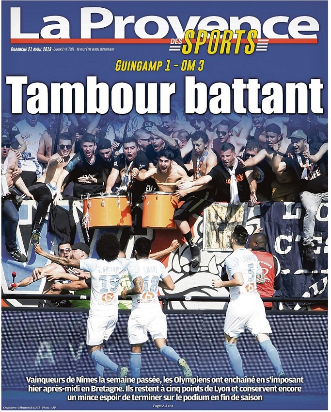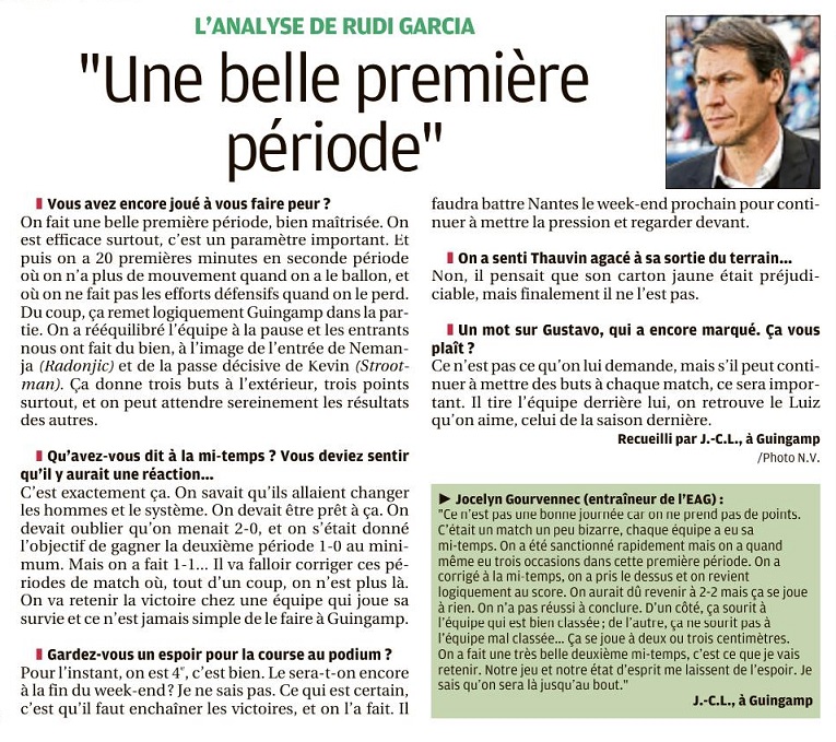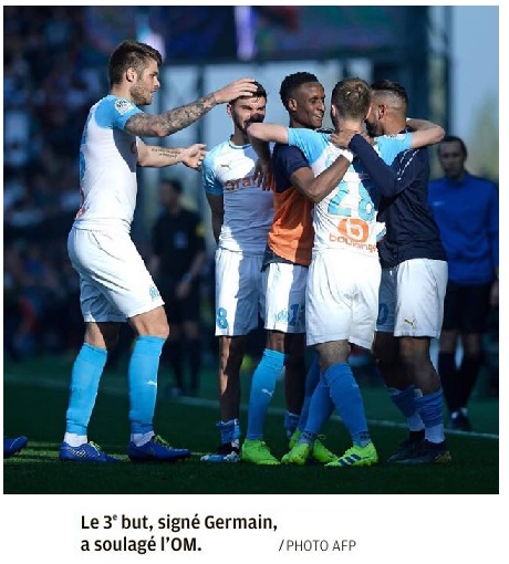 Vainqueurs à Guingamp (1-3) ce samedi en étant intermittents, les Olympiens ont récupéré provisoirement la quatrième place du classement. De quoi garder un mince espoir pour le podium Dans le monde du football, il n'y a pas de sentiments, juste des centimètres. La victoire de l'OM hier après-midi à Guingamp (1-3), qui prolonge les espoirs olympiens pour la troisième place, a encore illustré cette maxime. Entre la frappe de Marcus Thuram (62), qui aurait pu permettre à l'En Avant de revenir à 2-2, et la superbe reprise en demi-volée de Valère Germain dans le temps additionnel (90+1), qui a scellé le succès de l'OM (1-3), ça s'est finalement joué à un cheveu. La tentative du Guingampais s'est d'abord écrasée sur la transversale avant de rebondir quasiment dans le but, mais sans franchir la ligne en intégralité, là où le missile du Marseillais, lui aussi après avoir heurté la barre, est rentré au fond des filets. "Ça se joue à que dalle, deux ou trois centimètres, c'est vraiment très frustrant. On a pris le dessus sur Marseille et rien que pour ça, on aurait mérité de revenir au score", soufflait Jocelyn Gourvennec, le coach dépité d'une équipe qui lutte pour sa survie en L1. Rudi Garcia, lui, préférait savourer les trois buts à l'extérieur et les trois points pris. L'entraîneur de l'OM n'a pas oublié, non plus, que son équipe avait connu un passage à vide bluffant. Car si les partenaires de Steve Mandanda ont assuré l'essentiel en s'imposant dans les Côtes-d'Armor, récupérant provisoirement la quatrième place à Saint-Étienne, opposé à Reims aujourd'hui, ils ont aussi longtemps tremblé. Comme face à Angers (2-2 après avoir mené 2-0) ou Nîmes (2-1), ils ont arrêté de jouer après la pause. Ils venaient de maîtriser l'EAG et de marquer deux buts, le premier par l'intermédiaire de Luiz Gustavo (4), pas loin d'être à 100 % comme diraient certains, et le deuxième grâce à l'inévitable Lucas Ocampos (40), dont c'était le retour dans le onze, sur un service de Florian Thauvin, encore très inégal. C'était donc suffisant pour eux. Or, les Bretons sont revenus des vestiaires avec d'autres intentions et l'OM a rapidement plié sur un centre de Mehdi Merghem pour Yeni Ngbakoto (56). L'impression que l'OM a fait le travail Remis en selle par cet OM à mi-temps (loin d'être thérapeutique), qui s'est seulement signalé en deuxième période sur un coup franc direct de Gustavo (80) et donc sur le but libérateur de Germain, le club breton n'en aura pas profité. Cela fait évidemment les affaires du plus fada des clubs français et les supporters n'ont pas boudé leur plaisir. Mais dans le monde du football, il n'y a pas de sentiment, que des centimètres : les fidèles marseillais l'ont rappellé au président olympien quand le coup de sifflet final a retenti avec un sonore "Eyraud on t'enc...", preuve du désamour entre la direction et les groupes. Juste avant, le kop guingampais avait lâché un timide "Desplat démission". Ce matin, il reste l'impression que l'OM a fait le travail, même à moitié. C'est sans doute le plus important, même si cela ne lui donne aucun gage pour l'avenir. Ce succès lui permet simplement de garder espoir pour une hypothétique qualification en Ligue des champions et de maintenir la distance avec ses poursuivants niçois (battus par Caen) et montpelliérains (vainqueurs à Strasbourg). Et de donner un peu plus de saveur, encore, au choc qui se profile entre l'OM et Lyon au stade Vélodrome, en clôture de la 36e journée de L1. L'OM n'en est pas encore là. Mais en attendant, il souffle sur les braises. Par Jean-Claude Leblois |