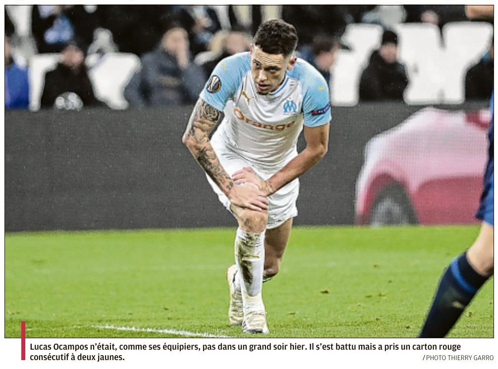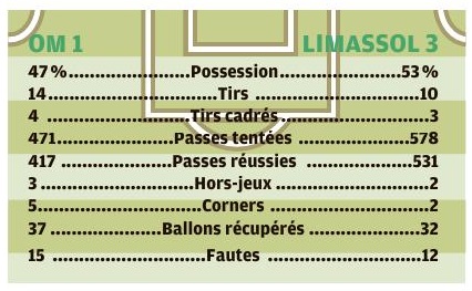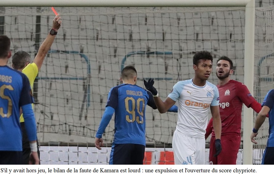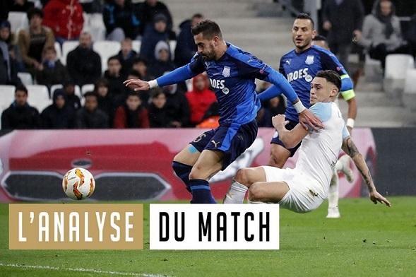Réduite à 10 après seulement 6 minutes de jeu, l'équipe olympienne s'est inclinée 3 buts à 1 sur sa pelouse de l'Orange Vélodrome face à l'Apollon Limassol pour sa dernière sortie européenne de la saison 2018-19. 5 changements dans le 11 Avec le report de Saint-Etienne, cela faisait huit jours que les Olympiens n'avaient pas joué. Et avec le report de OM - Bordeaux, qui devait avoir lieu dimanche 16, Rudi Garcia a peut-être moins fait tourner que prévu son effectif car la prochaine sortie des Marseillais est programmée mercredi 19 décembre, contre Strasbourg en Coupe de la Ligue. Quoi qu'il en soit, le coach marseillais a fait cinq changements par rapport à l'équipe qui avait débuté à Nantes. Escales, Sakai, Caleta-Car, Lopez et Payet étaient titulaires face aux Chypriotes à la " place " de Mandanda, Sarr, Rolando, Sanson et Germain. Le jeu Après seulement 7 minutes de jeu, l'OM s'est retrouvé à 10 contre 11 après la faute de Kamara qui lui a valu un carton rouge. Maglica a transformé le penalty en trompant Escales. Mais l'avantage des Chypriotes n'a duré que 4 minutes puisque Thauvin a repris, de la tête, un centre de Lopez. Deux buts et un carton rouge après à peine plus de dix minutes de jeu, le ton était donné ! Après la sortie de Kamara, Luiz Gustavo a pris le couloir gauche de la défense. Lopez et Strootman se sont positionnés devant la défense. Malheureusement, en infériorité numérique, les Marseillais ont souffert notamment en contre. Malgré quelques jolis mouvements et quelques opportunités, les Olympiens ont encaissé un but à la demi-heure de jeu par Maglica, qui reprenait de la tête un centre de Stylianou. En début de seconde période, une tête de Rami puis une frappe lointaine de Strootman ont failli remettre l'OM sur de bons rails mais les Chypriotes jouaient les coups à fond et trouvaient une fois de plus la faille sur une très belle reprise en demi-volée de Stylianou qui trouvait la lucarne d'Escales. Les changements opérés par Rudi Garcia (entrées de Sarr puis Radonjic et enfin Njie) ont apporté de la fraîcheur mais à 10 contre 11, avec la fatigue d'une équipe qui a beaucoup plus couru, la mission était trop difficile. Une faible affluence L'horaire du match, le froid, l'adversaire et l'absence d'enjeu... Tout était réuni pour avoir une faible affluence jeudi en fin d'après-midi à l'Orange Vélodrome. Cela a été le cas puisque 9274 spectateurs ont pris place dans l'enceinte marseillaise. Mais cela n'a pas empêché les supporters olympiens de faire du bruit. Le public des virages repositionné en Jean Bouin a donné de la voix en chantant et encourageant son équipe préférée durant 90 minutes dans le froid.