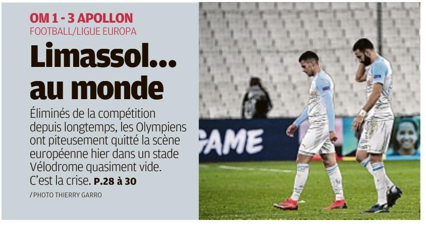 Humiliés par Limassol dans un Vélodrome déserté, les Olympiens ont achevé leur parcours en Ligue Europa par une prestation indigne de leur statut Il fallait les entendre s'égosiller, les journalistes chypriotes. Eux au moins vivaient le match à fond, malgré leur amertume. Déçus par l'ambiance et l'affluence extrêmement faible enregistrée hier au Vélodrome (9200 spectateurs), interloqués par l'absence de Kostas Mitroglou, leur héros grec (!), ils ont néanmoins eu de quoi commenter avec panache la prestation d'un Apollon Limassol aussi appliqué qu'impliqué. Tout le contraire de l'OM, en somme. L'équipe de Rudi Garcia a encore été désespérante. Une honte. L'expulsion de Boubacar Kamara, coupable d'une stupide faute en pleine surface en tout début de partie, l'a, certes, handicapée (lire en page suivante). Elle n'explique cependant en rien le simulacre de jeu collectif proposé par Dimitri Payet et ses acolytes. Pire, à l'inverse du sketch de Francfort (4-0), où il avait fait confiance à plusieurs éléments en manque de temps de jeu, l'ancien technicien de la Roma a cette fois aligné une formation quasiment type. Et ce n'était finalement pas un cadeau pour Florian Escales, seul novice du onze de départ. Eyraud insulté par les supporters La défaite fait partie du sport, évidemment. Sauf qu'elle ne peut être acceptée dans de telles conditions. Force est de constater qu'en ce moment, les discours ne passent pas auprès des fantômes errant sur la pelouse. Ni celui de leur coach, ni ceux de leur président et de leur directeur sportif n'ont de l'effet. Jacques-Henri Eyraud et Andoni Zubizarreta voulaient remotiver les troupes en prenant la parole le week-end dernier, c'est raté... Les guerriers adulés du printemps sont devenus les divas insupportables de l'automne. Il va bien falloir que quelque chose change, sous peine de vivre de terribles désillusions dans les prochains mois. L'entraîneur ? "RG" a été prolongé jusqu'en 2021 il y a deux mois. Son excellent boulot réalisé la saison passée plaide encore en sa faveur. Et même si son crédit s'épuise à la vitesse grand V, on voit mal ses dirigeants le limoger et tout remettre en cause dès maintenant. Les joueurs ? Ils sont évidemment les principaux fautifs. En Allemagne, lors de la 5e journée, ils s'étaient comportés en sous-doués. Face aux Chypriotes, Kevin Strootman et ses partenaires ont ressemblé à de mauvais clowns. Le hic, c'est que le comique de répétition a du mal à passer à Marseille et qu'ils ne font désormais plus rire personne. Les supporters leur ont d'ailleurs bien fait savoir en fin de rencontre en entonnant les célèbres "Même si vous ne méritez pas, nous, on est là !" et "Mouille le maillot ou c..." Eyraud et Garcia en ont également pris pour leur grade via des chants insultants et des appels à la démission. L'espace de quelques minutes, on se serait même cru revenu trois ans en arrière, à l'époque de Labrune et Michel. Une drôle de fin d'année, donc. Heureusement, finalement, que la réception de Bordeaux, initialement programmée dimanche, a été reportée (lire par ailleurs). L'ambiance aurait en effet pu être délétère dans les virages. Reste à savoir comment sera accueilli l'OM face à Strasbourg en 8e de finale de coupe de la Ligue mercredi. Et ce, même si les Ultras ont appelé au boycott afin de protester contre la politique tarifaire discriminatoire décidée par le club contre leurs membres (les places leur sont vendues 15 La soirée d'hier devait marquer un nouveau départ. C'était son seul intérêt. Elle restera dans les mémoires comme celle de la fracture. Les starlettes ridicules ont fait basculer l'OM dans une crise plus profonde que prévu. Il va falloir être costaud pour s'en sortir... Auteur : Fabrice Lamperti |