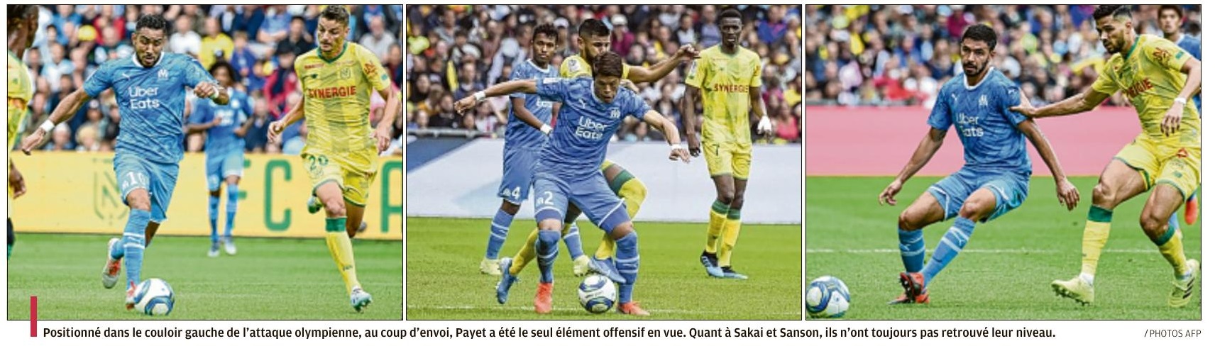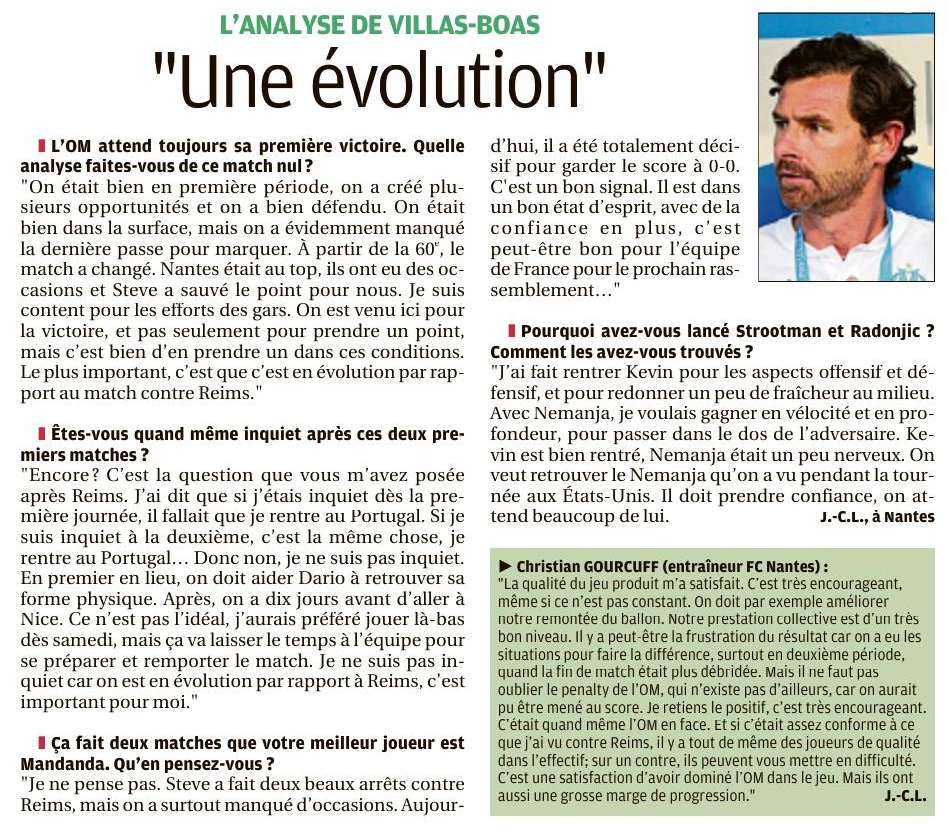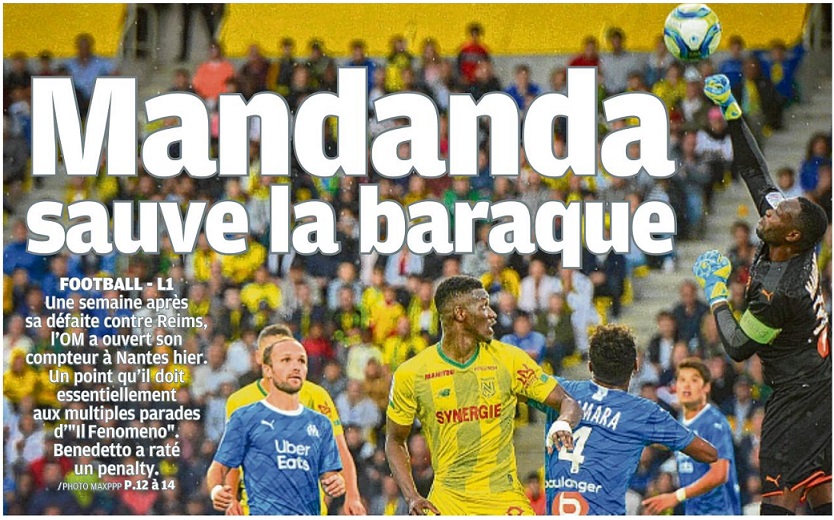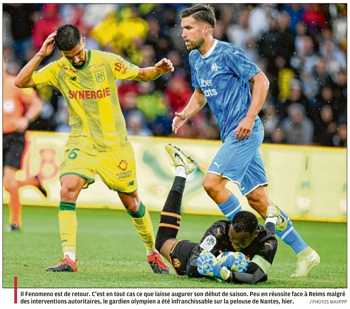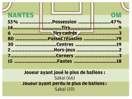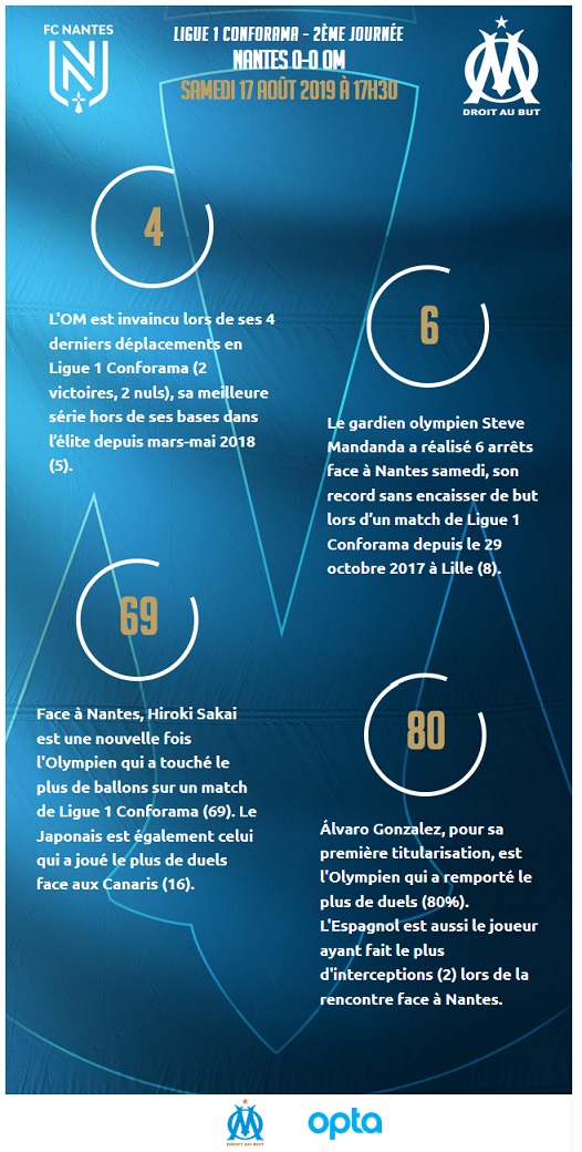 Les Olympiens ont ramené un point de leur déplacement à Nantes (0-0) dans le cadre de la deuxième journée de Ligue 1 Conforama. Un onze remanié Attaché à son système en 4-3-3 avec un milieu défensif et deux relayeurs, André Villas Boas a fait des choix après la défaite contre Reims. Titulaires pour la première fois en match officiel, les recrues estivales Alvaro González et Benedetto ont respectivement remplacé Caleta-Car et Germain. Autre choix de l'entraîneur, Lopez a été aligné dans l'axe pour compléter le milieu avec Gustavo et Sanson. Quatrième changement par rapport à la première journée, Sarr a occupé le rôle d'ailier droit, en lieu et place de Radonjic, un poste qu'il a retrouvé durant les matchs de préparation. L'instant VAR 30e minute de jeu, Benoit Bastien recourt au VAR pour juger une action litigieuse entre Kamara et Touré. Dorénavant installé dans le paysage de la Ligue 1 Conforama, l'utilisation de cet outil a débouché sur un penalty suite à une main du milieu nantais. Tireur attitré, Payet a donné l'occasion à Benedetto de débloquer la situation et son compteur personnel. Une occasion manquée par le numéro neuf argentin à la demi-heure. L'instant Mandanda Dans une rencontre où les frissons se sont comptés sur les doigts d'une main, Mandanda a répondu présent durant le moment fort des Canaris. Auteur d'un gros match, Il Fenomeno a joué un rôle prépondérant dans le nul obtenu à la Beaujoire. Notamment grâce à une série d'arrêts à un quart de la fin. En feu, il a enchaîné une parade sur une tentative de Bamba qui prenait le chemin du petit filet. Puis, un double arrêt face à Girotto et Touré avant de capter un centre dangereux de Rongier. Avec cette 76e minute intense, il a totalisé dix arrêts contre deux pour Lafont. Kamara de nouveau averti Pris de vitesse par l'avant-centre Coulibaly, Kamara a écopé d'un avertissement dans les arrêts de jeu de la première période (48e). Après Sanson (42e), le défenseur central est le deuxième olympien averti. Déjà sanctionné lors de la première journée, il est sous le coup d'une suspension en cas de troisième avertissement. Nice puis Saint-Étienne L'OM a obtenu son premier point de la saison à Nantes. La 3e journée se déroulera le mercredi 28 août. Elle proposera un nouveau déplacement, à Nice, pour un derby méditerranéen. Les Olympiens retrouveront l'Orange Vélodrome, trois jours après, pour un choc annoncé face aux Verts de Saint-Étienne. Après le duel contre Christian Gourcuff, André Villas-Boas affrontera de nouveau un entraîneur qui vient de prendre les commandes de son équipe, en la personne de Ghislain Printant. |