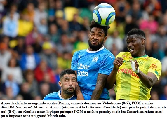 Battu en ouverture par Reims (0-2), le week-end dernier, l'OM a encore été inquiétant hier à Nantes Après la défaite inaugurale contre Reims, samedi dernier au Vélodrome (0-2), l'OM a enfin décolléà Nantes où Alvaro et Amavi (ci-dessus à la lutte avec Coulibaly) ont pris le point du match nul (0-0), un résultat assez logique puisque l'OM a ratéun penalty mais les Canaris auraient aussi pu s'imposer sans un grand Mandanda. Après la défaite inaugurale contre Reims, samedi dernier au Vélodrome (0-2), l'OM a enfin décolléà Nantes où Alvaro et Amavi (ci-dessus à la lutte avec Coulibaly) ont pris le point du match nul (0-0), un résultat assez logique puisque l'OM a ratéun penalty mais les Canaris auraient aussi pu s'imposer sans un grand Mandanda. Photo BEP L'OM a marqué son premier point de la saison, hier, en accrochant le FC Nantes (0-0). Et sans un grand Steve Mandanda, auteur de belles parades, le club marseillais aurait certainement enregistré une deuxième défaite de rang. Voilà pour les (minces) motifs de satisfaction après deux journées de championnat. C'est peu, bien trop peu, pour une formation qui prétend au podium. Giflé par Reims (0-2) en ouverture et tenu en échec par les Canaris pour le premier déplacement de la saison, l'OM entame donc la cuvée 2019-20 avec une sacrée gueule de bois. Celui qui doit avoir le plus mal au crâne, ce matin, est sans aucun doute Dario Benedetto. Pour sa première titularisation avec le maillot marseillais sur les épaules, l'attaquant argentin, encore très discret, a manqué une occasion en or, sur un penalty très généreux et après une passe pas vraiment décisive de Dimitri Payet (lire en page suivante), de donner l'avantage à l'OM. La tentative de "Pipa", largement au-dessus du cadre d'Alban Lafont (30), a même dû finir sa course à Rennes. C'était la seule occasion nette du match côté olympien (et la deuxième de la saison après la barre de Strootman la semaine dernière), même si la décision arbitrale ne l'était pas du tout. Car si la première période était plus ou moins équilibrée, presque plaisante avec des situations chaudes de part et d'autre, la deuxième mi-temps est restée à sens unique pour les Nantais, avec une maîtrise certaine mais un niveau global assez pathétique. De manière assez stupéfiante, cela n'a d'ailleurs pas empêché Kalifa Coulibaly, Valentin Rongier ou Mehdi Abeid de faire tourner en bourrique Boubacar Kamara et consorts. "C'est une satisfaction d'avoir dominé l'OM dans le jeu", se réjouissait à juste titre Christian Gourcuff, le coach breton, pour sa première à la Beaujoire. Pas de quoi faire trembler André Villas-Boas en revanche. Avec son visage d'ange, le Portugais balayait les inquiétudes d'un revers de main après le coup de sifflet final ("On est en évolution", voir ci-dessous), tout comme les interrogations sur l'état physique de ses ouailles. "C'est ridicule", a lâché "AVB" alors qu'un confrère lui faisait remarquer que ses joueurs avaient fini les rencontres contre Reims et Nantes émoussés. Les Olympiens ont dix jours pour préparer le déplacement à Nice Fidèle à son 4-3-3, le nouvel entraîneur de l'OM avait pourtant apporté des modifications par rapport à sa composition d'équipe en changeant quatre joueurs au coup d'envoi : Benedetto, donc, Alvaro, à son avantage, ainsi que Maxime Lopez et Bouna Sarr. Mais hormis Payet, auteur du premier tir cadré (26), personne n'a semblé en mesure de pouvoir faire les différences, d'être capable d'allumer la lumière pour éclairer le jeu face à une formation nantaise courageuse, mais limitée. Ce ne sont pas les changements superfétatoires opérés en cours de jeu, avec les entrées de Kevin Strootman, Nemanja Radonjic (encore inutile) et Valère Germain, qui ont modifié la donne. Au contraire, cela semblait donner des ailes aux Canaris. Aujourd'hui, avec un tout petit point en deux rencontres face à des sans-grades, les Olympiens ont intérêt à sortir très vite de leur torpeur. Ils ont dix jours pour préparer au mieux le déplacement à Nice, mercredi 28 août, et envisager, pourquoi pas, de s'imposer. Sait-on jamais... Par Jean-Claude Leblois (envoyé spécial à Nantes) |