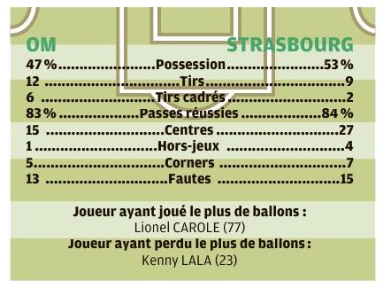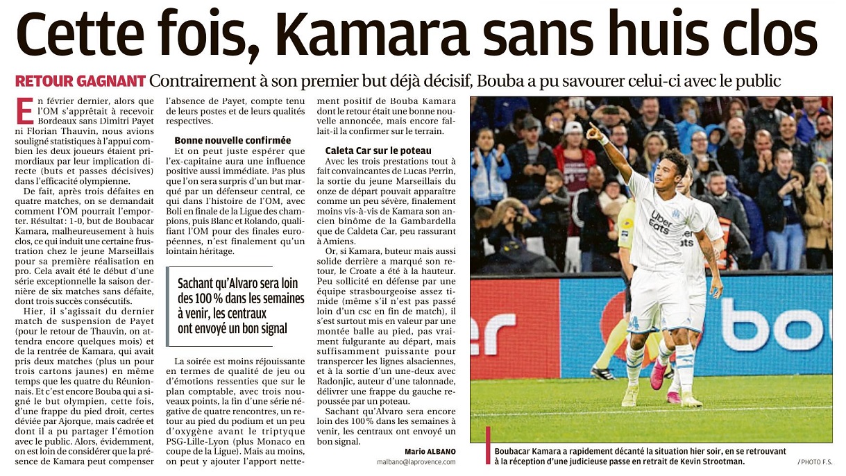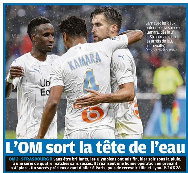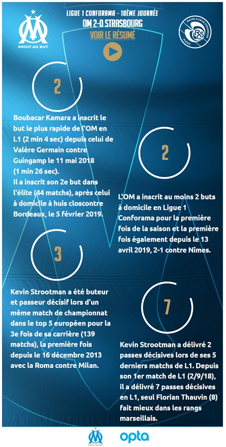 OM - Strasbourg (2-0) : l'OM renoue avec la victoire Les Olympiens se sont imposés face à Strasbourg (2-0) grâce à des buts de Kamara, de retour après trois matches de suspension, et un penalty de Strootman. L'OM réalise la bonne opération. Strootman et Kamara de retour Pour affronter Strasbourg dans le cadre de la 10e journée de Ligue 1 Conforama, André Villas-Boas enregistrait deux retours. Kevin Strootman et Boubakar, suspendus lors des précédentes rencontres, retrouvaient leur place dans le onze de départ olympien. En revanche, Morgan Sanson purgeait un match de suspension. Le coup d'envoi fictif de la rencontre a été donné par un ancien Olympien : Zarko Olarevic qui a porté les couleurs de l'OM durant la saison 1983/84. Il a également été à la tête de l'équipe durant une saison (1985/86). Kamara démarre fort Trois petites minutes ont suffi à l'OM pour ouvrir le score. Sur sa percée, Radonjic obtenait un coup franc excentré côté gauche. Benedetto s'en chargeait mais voyait sa frappe déviée. Le cuir revenait dans les pieds de Strootman, présent au second poteau, qui remisait pour Kamara. Le minot olympien marquait et inscrivait là son premier but de la saison. Il ne pouvait rêver mieux pour son retour à la compétition après avoir été suspendu trois matches. Le match L'OM s'est imposé 2-0 face à Strasbourg et il a réalisé une partie très sérieuse. Avec un brin de réussite, le score de la rencontre aurait pu être plus sévère. Les Olympiens ont frappé la barre à deux reprises. D'abord en première mi-temps, Caleta-Car voyait sa frappe déviée par Sels sur son poteau droit. En seconde période, c'est la reprise de volée de Radonjic qui venait s'écraser sur la transversale du portier strasbourgeois. De son côté, Steve Mandanda a vécu une rencontre plutôt tranquille et a réalisé les arrêts qu'il fallait notamment sur une frappe lointaine (53e) captée en deux temps. En toute fin de rencontre, Benedetto obtenait un penalty qu'il laissait à Strootman. Le Néerlandais prenait Sels à contre-pied et scellait le sort de la rencontre. Seul bémol de la soirée, le carton jaune de Dario Benedetto qui sera prochainement suspendu. L'OM renoue avec la victoire Voilà une bonne manière de préparer le déplacement du côté de Paris qui aura lieu dimanche 27 octobre à 21 heures en clôture de la 11e journée de Ligue 1 Conforama. Les Olympiens ne s'étaient plus imposés en championnat depuis le succès à Monaco (2-4). Depuis, il avaient enchaîné trois nuls et une défaite. Face au PSG, André Villas-Boas enregistrera les retours de Dimitri Payet, Morgan Sanson et Alvaro Gonzalez. L'OM réalise la bonne opération En s'imposant face à Strasbourg, l'OM réalise la bonne opération du week-end sur le plan comptable et au niveau du classement. Les joueurs de Villas-Boas occupent désormais la 4e place et comptabilisent 16 points. Ils reviennent à hauteur d'Angers et ne sont qu'à une petite longueur du podium. |