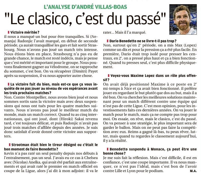 L'OM a renoué avec la victoire en battant Strasbourg (2-0) hier au Vélodrome. De quoi se rassurer avant d'aller à Paris, puis de recevoir Lille et Lyon À voir évoluer l'ancien attaquant de l'Étoile Rouge de Belgrade (23 ans) sous le maillot olympien, on se dit que sa devise est similaire à celle du bougre légendaire interprété par Michel Blanc : "Oublie que tu n'as aucune chance. Vas-y, fonce. On ne sait jamais, sur un malentendu, ça peut passer !" Et comme tout est possible à l'OM, ça a failli marcher hier soir, lorsqu'à la 20e minute, le mystérieux ailier gauche a effectué une remise fabuleuse sous forme de talonnade pour... Duje Caleta Car, monté aux avant-postes. Une combinaison made in Balkans, séquence complètement irrationnelle, ponctuée par un missile de "DCC", du gauche, renvoyé par le poteau. Les Olympiens menaient alors 1-0 et pressaient, parfois un peu n'importe comment, pour doubler la mise après une ouverture du score signée "Bouba" Kamara dès la 3e minute. Le minot de la Soude, bien servi par Kevin Strootman après un coup franc de Dario Benedetto, avait trouvé la faille au meilleur moment. De quoi mettre son équipe sur les bons rails... Sauf qu'il a fallu attendre la toute fin de match pour voir l'OM mettre enfin un second but, sur un penalty transformé par le Néerlandais. Auparavant, Radonjic, encore lui, avait trouvé la barre d'une reprise du plat du pied bien sentie à la suite d'un centre de Valère Germain (55). Beaucoup de déchets, encore Pas de passe décisive ni de but pour le Serbe, donc. Ce qui ne change pas vraiment. Pour le reste, il a la plupart du temps sprinté ballon au pied avant de le perdre ou de faire un mauvais choix. Il ne fut pas le seul Olympien dans ce cas-là, ceci dit. Ce matin, "Pipa" Benedetto doit encore se demander comment Bouna Sarr ne l'a pas vu juste avant la pause. L'Argentin était complètement démarqué, mais le latéral droit avait la tête baissée. Un résumé de la soirée, en somme. L'OM a gagné. Et se devait de le faire. Face à une formation strasbourgeoise au niveau très décevant, la troupe d'André Villas-Boas n'a pas totalement maîtrisé son sujet. Mais elle a su tirer son épingle du jeu face à une défense à trois éléments centraux, ce qui n'est pas jamais évident.Les partenaires de Steve Mandanda ont surtout rempli leur mission en renouant avec le succès après quatre rencontres sans victoire (Montpellier, Dijon, Rennes et Amiens). Il le fallait absolument pour demeurer collé au haut de tableau. À un point du podium, les Marseillais restent en effet en embuscade. Le plus dur est néanmoins à venir. Avec seize unités au compteur, l'escouade d'AVB en compte trois de moins que celle de Rudi Garcia au même stade l'an dernier. Mais les positions sont davantage resserrées, et au quart de la saison, tous les espoirs restent permis. Il faut cependant être sacrément optimiste pour imaginer que l'OM occupera encore sa place actuelle (4e) à l'issue des trois prochaines rencontres de Ligue 1. En se rendant à Paris dimanche (21h), puis en recevant Lille puis Lyon, Sakai et ses acolytes vont se coltiner les trois représentants de la France en Ligue des champions. Ça peut être un avantage si ces derniers sont fatigués. Mais il s'agit surtout d'un sacré défi. On saura, au terme de ce triptyque, si les Olympiens sont capables de jouer les premiers rôles, comme l'espèrent Jacques-Henri Eyraud et Andoni Zubizarreta. S'ils ne haussent pas leur niveau de jeu, ce sera très compliqué. Mais ne voyons pas tout en noir... On ne sait jamais, sur un malentendu, ça peut passer ! Par Alexandre Jacquin |