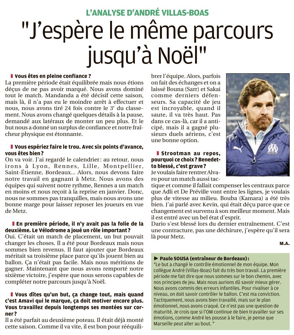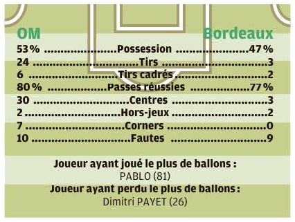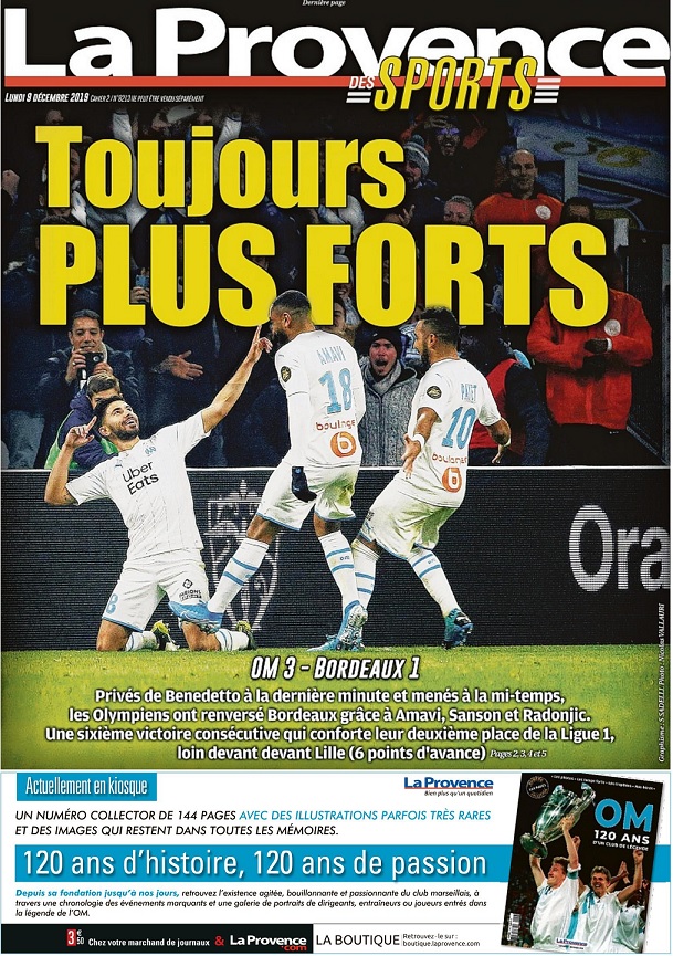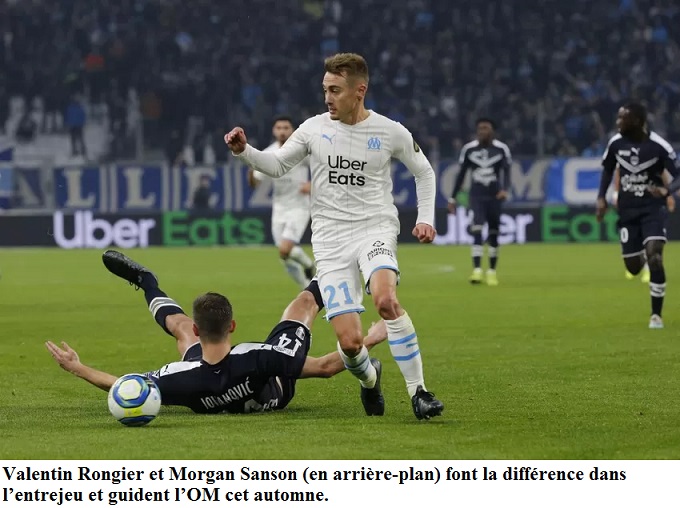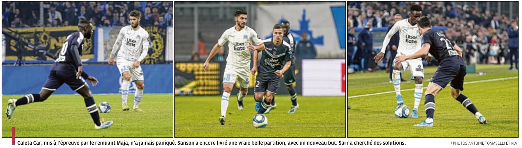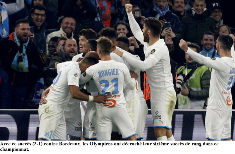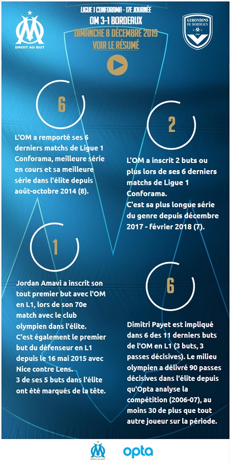 Menés à la pause, les Olympiens ont renversé Bordeaux en s'imposant 3-1 grâce à des buts signés Amavi, Sanson et Radonjic. La série continue. Le onze de départ olympien Deux changements étaient à noter dans la composition olympienne pour affronter Bordeaux. Alvaro Gonzalez effectuait son retour en charnière centrale aux côtés de Duje Caleta-Car. Touché à l'entraînement et victime d'une contracture musculaire, Dario Benedetto n'était pas en mesure de tenir sa place face aux Girondins : il a donc été suppléé par Valère Germain à la pointe de l'attaque. Le numéro 28 était entouré de Bouna Sarr et Dimitri Payet. Jordan Amavi et Hiroki Sakai tenaient leur poste habituel et le milieu de terrain olympien était composé de Morgan Sanson, Boubacar Kamara et Valentin Rongier. Le capitaine Steve Mandanda gardait la cage olympienne. Le coup d'envoi fictif de la rencontre a été donné par Djamel Belmadi, actuel sélectionneur de l'Algérie, vainqueur de la CAN 2019 et ancien Olympien. La première période Alors que l'OM dominait largement la partie en passant la moitié de son temps dans le camp bordelais, il s'est fait surprendre à la demi-heure de jeu. Adli ouvrait le score pour les Girondins d'une frappe tendue venue heurter le poteau gauche de Mandanda et finissant dans les filets. Pourtant jusque-là peu inquiétés, les Olympiens avaient été dangereux notamment sur des frappes lointaines de Rongier (21e) contrées à deux reprises. Les hommes de Villas-Boas n'ont eu de cesse de pousser jusqu'à la fin de la première période sans être récompensés. Une frappe de Payet venait conclure un joli mouvement collectif mais Costil restait vigilant. Pressing payant Les Olympiens sont entrés dans leur deuxième période avec une énergie incroyable étouffant les Bordelais et les poussant à la faute. L'OM obtenait un corner. Ce dernier, frappé par Payet à la perfection, était déposé sur le crâne d'Amavi, imparable pour Costil. Le pressing constant des Olympiens ne permettait pas aux Bordelais de s'en sortir et sur un ballon mal renvoyé par Pablo, Morgan Sanson récupérait le cuir et s'en allait décocher une frappe puissante qui venait se loger dans les filets de Costil. En pleine confiance, les Olympiens continuaient d'attaquer et n'hésitaient pas à tenter des coups subtils, à l'image de Payet qui voyait Costil avancé, et qui essayait un lob lointain malheureusement non cadré. Dans le temps additionnel, Radonjic, sur un service cinq étoiles de Rongier, venait inscrire le troisième but marseillais. Quel match encore une fois ! La performance d'Amavi Face à Bordeaux, Jordan Amavi a inscrit son tout premier but avec l'OM en Ligue 1 Conforama. Un joli coup de tête venu délivrer les 52079 spectateurs présents à l'Orange Vélodrome. Depuis son arrivée à l'OM, le latéral gauche olympien avait marqué un seul petit but, c'était en coupe de France face à Valenciennes lors de la saison 2017-18. L'OM, solide dauphin Ce dimanche soir, l'OM a signé son sixième succès de rang ! Cette incroyable série de victoires leur permet de consolider leur deuxième place en championnat. Les hommes de Villas-Boas comptent désormais 34 points et 6 points d'avance sur leur poursuivant. Il ne reste plus que deux petits matches en 2019 pour les Olympiens : un déplacement à Metz puis la réception de Nîmes.