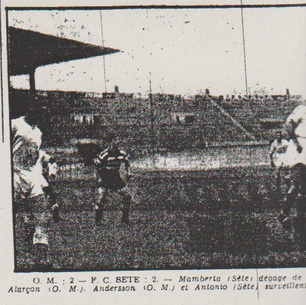 Le match O.M. - Sète qui s'est joué hier après-midi au Stade Vélodrome, a été contrarié par une pluie diluvienne, qui n'a cessé de tomber sur la pelouse. Devant la fureur de l'ondée céleste, ont pu craindre même, un instant, que M. Dufossé soit obligé de renvoyer la rencontre. Et c'est finalement en présence de 4.000 spectateurs, que cette partie de style "aquatique" a débuté. Le jeu évidemment, dès les premières minutes, n'eut pas une grande tenue, les joueurs ne cessant de glisser. À la 10e minute, David effectua un excellent tir qui fut bien bloqué par Pons ! trois minutes plus tard, Andersson échappa à Broccolichi et envoya un bolide qui pouvait se transformer en but, mais la barre sauva le gardien sétois. À la 18e minute, David tenta encore sa chance. Pons bloqua mal la sphère, mais aucun olympien ne suivit l'action. Enfin, à la 22e minute, Nekkache ayant servi de façon remarquable Andersson, ce dernier fonça avec décision dans le "trou" et expédia un tir à ras de terre ; Pons plongea sans résultat, la balle heurta le poteau droit puis pénétra à l'intérieur des bois. Neuf minutes plus tard Fontaine s'échappa, nul défenseur olympien ne lui barrant la route, il centra avec aisance vers le centre du terrain ; Johansson et Singier se précipitèrent ensemble ; le Sétois fut plus prompt dans son intervention et, à bout portant, logea la sphère dans les filets olympiens. Deux minutes plus tard, Salem ne commit une grave faute. Il hésita à dégager une balle qui lui revenait, il voulut la passer à Morand. Singier, très opportuniste, surgit en trombe et scora un second but. À la 40e minute, l'arbitre accorda un penalty mérité à l'O.M. Andersson, en possession de la balle, avait été fauché de façon manifestèrent par Renko. Après quelques palabres, Andersson fut chargé de "l'exécution". Il tira avec vigueur dans le coin droit. Les deux équipes étaient à égalité. Alain DELCROIX |