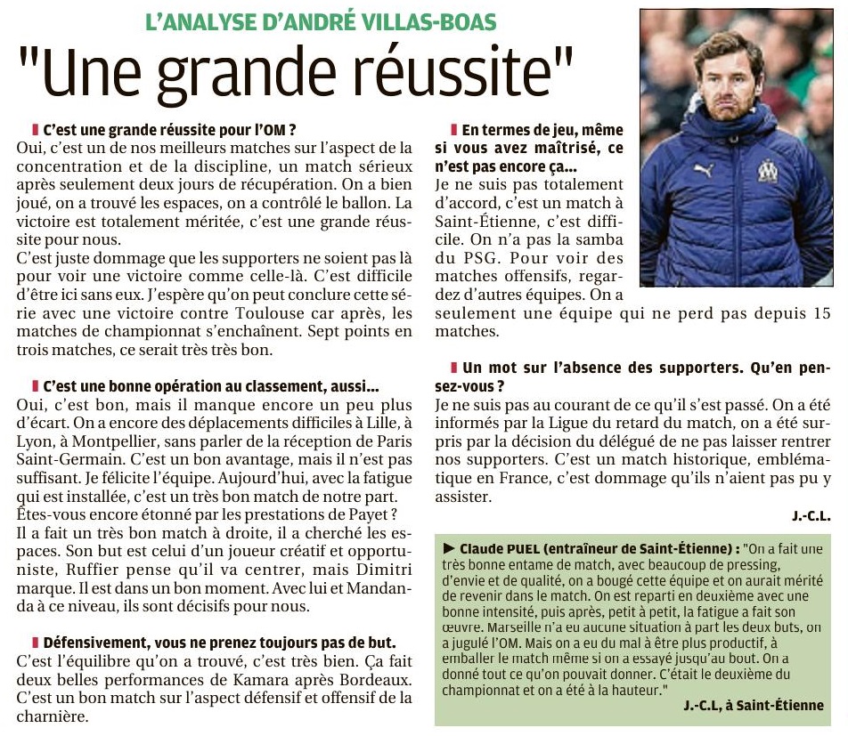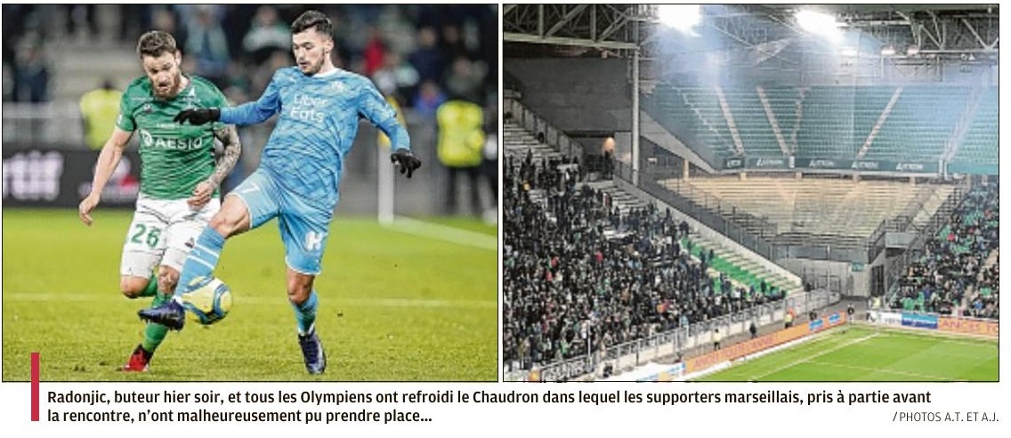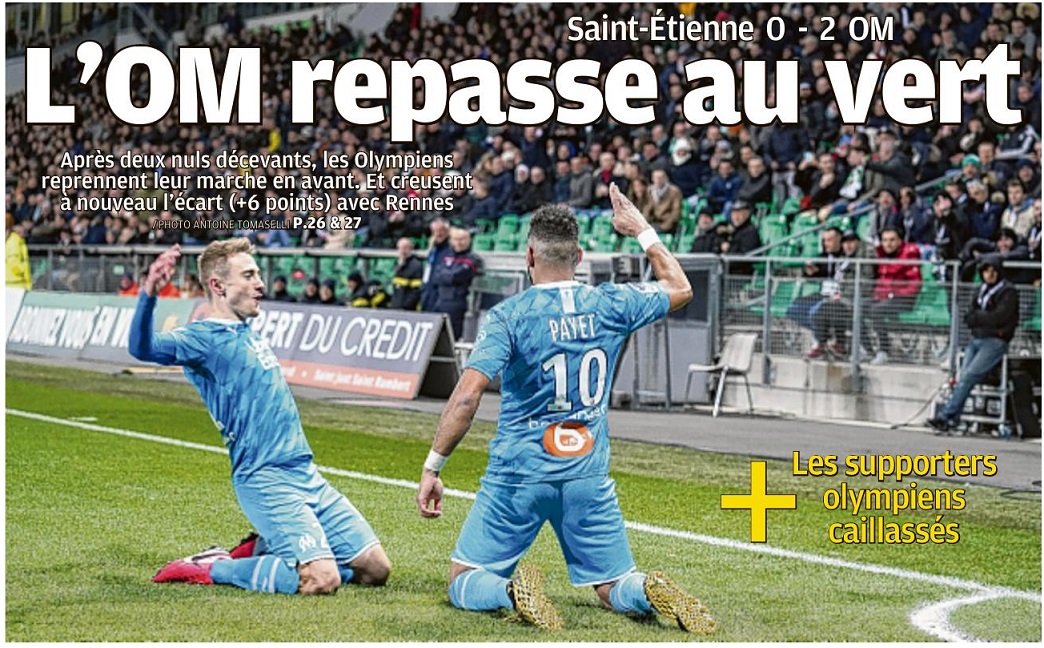 Le club olympien, sans ses supporters, privés de match au dernier moment, a renoué avec la victoire à Saint-Étienne (0-2) et creuse l'écart au classement avec Rennes Et si vous en profitiez pour prendre un bon bol d'air pur ?" L'OM a appliqué à la lettre la publicité du département de la Loire, hier à Saint-Étienne, pour s'imposer aux dépens de l'ASSE (0-2) et humer à nouveau l'odeur de la victoire. Ce qui ne lui était plus arrivé en championnat depuis le déplacement à Rennes (0-1), le 10 janvier. Vainqueurs grâce à des buts de Dimitri Payet (7) et Nemanja Radonjic (86), les Olympiens respirent un peu mieux au classement après les nuls piteux contre Angers et à Bordeaux (0-0 à chaque fois). Une très bonne opération pour André Villas-Boas et sa bande, qui creusent donc l'écart avec leurs poursuivants directs, laissant le Stade Rennais, battu à Lille (1-0) mardi, à six points. Ce n'était pourtant pas gagné d'avance tant l'air du Forez était vicié. L'avant-match a ainsi été fortement perturbé à l'extérieur du stade Geoffroy-Guichard par des affrontements entre des supporters des Verts et les forces de l'ordre, qui n'ont pas lésiné sur les gaz lacrymogènes. Suffisamment en tout cas pour que plusieurs nuages de gaz ne viennent interrompre l'échauffement des deux formations et ne décalent le coup d'envoi de la rencontre d'un quart d'heure, à 21h15. Initialement autorisés à garnir le parcage visiteurs de l'enceinte stéphanoise en étant encadrés par les autorités, les 400 fidèles marseillais, pris pour cibles par des fans adverses, puis réprimés sans ménagement par les forces de l'ordre, ont même été invités à regagner Marseille sans passer par la case tribune. L'OM s'en est ému en cours de match par un communiqué. Il ne fallait de toute façon pas arriver en retard pour ce match de clôture de la 23e journée de Ligue 1. Comme souvent, l'éclair olympien est venu des pieds de Payet, lequel s'est amusé à donner le tournis à Yann M'Vila avant de profiter du faux pas de Stéphane Ruffier, qui avait anticipé un centre en retrait du Réunionnais, pour ouvrir le score, du pied gauche, après 7 minutes de jeu. Un but rapide et plein d'opportunisme qui a placé les Olympiens dans un certain confort. Appliqués dans la circulation et les sorties de balle, ils ont patiemment attendu les Stéphanois, histoire de ne pas se découvrir bêtement et se faire égaliser. Encore patraque en attaque, à l'image de Dario Benedetto, l'escouade marseillaise a pu s'appuyer sur sa solidité défensive (zéro but encaissé en L1 en 2020), avec un Steve Mandanda encore une fois vigilant sur les rares frappes foréziennes (Diony, Debuchy ou Bouanga) et une charnière Alvaro-Caleta Car toujours aussi solide, face à une formation stéphanoise laminée le week-end dernier par Metz (3-1) et engluée dans les limbes du classement. Titularisé à la place d'Hiroki Sakai - Bouna Sarr ayant reculé au poste de latéral droit -, Nemanja Radonjic s'est quant à lui chargé de parachever le succès de l'OM en fin de partie, d'un tir croisé du gauche sur un service de Morgan Sanson, son sixième but de la saison et le premier en tant que titulaire. Les motifs de satisfaction sont donc nombreux pour "AVB", même si Jordan Amavi, averti pour une faute en retard, sera suspendu pour la réception de Nantes (22 février). Mardi, l'entraîneur portugais avait annoncé un objectif de six points pour le déplacement à Saint-Étienne et la réception de Toulouse, samedi après-midi au Vélodrome. Ses joueurs ont déjà fait la moitié du travail. Ce matin, même si les supporters marseillais ont été abondamment enfumés, l'OM respire. Par Fabrice Lamperti |