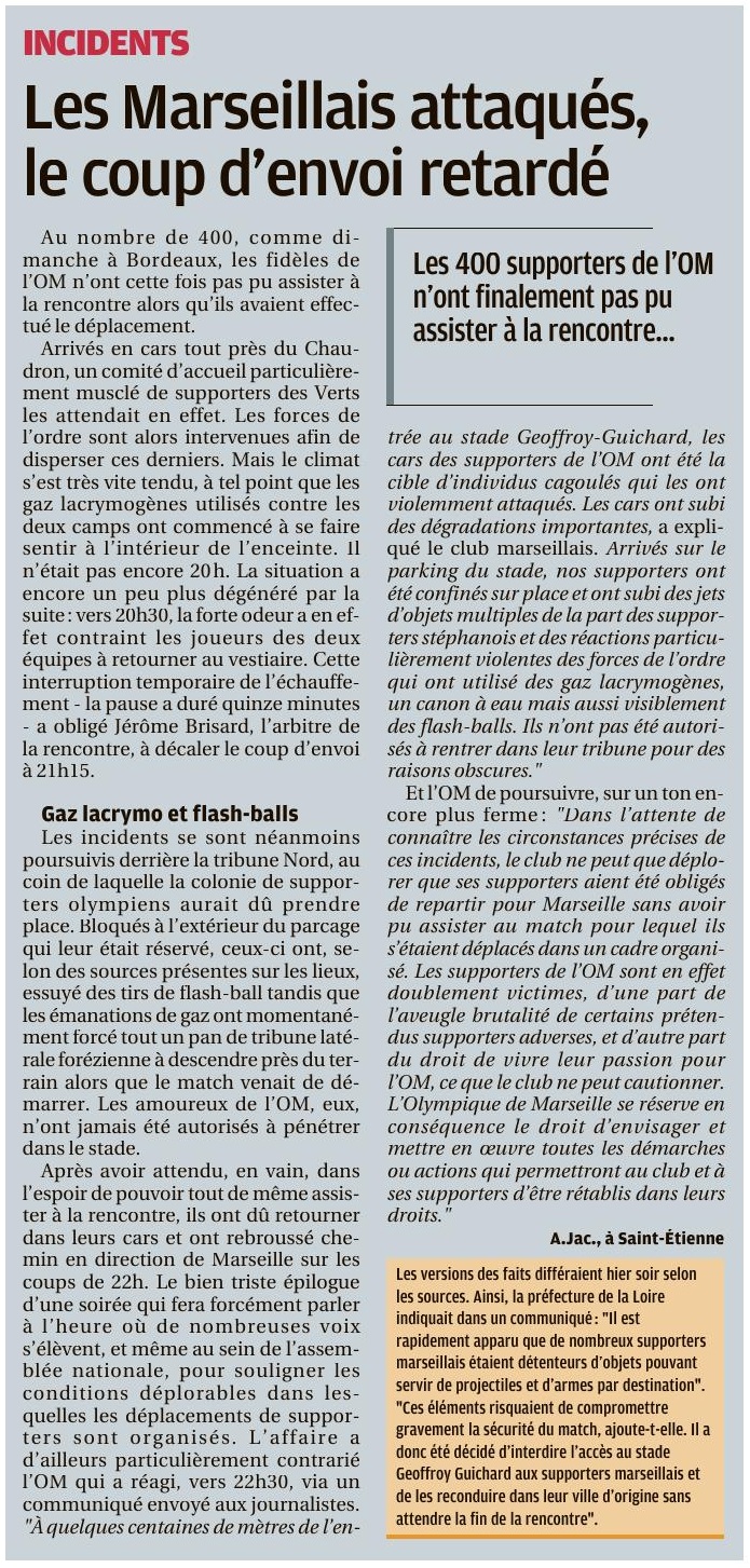 Communiqué officiel de l'OM Communiqué officiel de l'Olympique de Marseille après la rencontre AS Saint-Etienne - OM en clôture de la 23e journée de Ligue 1 Conforama. À quelques centaines de mètres de l'entrée au stade Geoffroy-Guichard, les cars des supporters de l'OM ont été la cible d'individus cagoulés qui les ont violemment attaqués. Les cars ont subi des dégradations importantes. Arrivés sur le parking du stade, nos supporters ont été confinés sur place et ont subi des jets d'objets multiples de la part des supporters stéphanois et des réactions particulièrement violentes des forces de l'ordre qui ont utilisé des gaz lacrymogènes, un canon à eau mais aussi visiblement des flash-balls. Ils n'ont pas été autorisés à rentrer dans leur tribune pour des raisons obscures. Dans l'attente de connaître les circonstances précises de ces incidents, l'OM ne peut que déplorer que ses supporters aient été obligés de repartir pour Marseille sans avoir pu assister au match pour lequel ils s'étaient déplacés dans un cadre organisé. Les supporters de l'OM sont en effet ce soir doublement victimes, d'une part de l'aveugle brutalité de certains prétendus supporters adverses, et d'autre part du droit de vivre leur passion pour l'OM, ce que le Club ne peut cautionner. L'Olympique de Marseille se réserve en conséquence le droit d'envisager et mettre en oeuvre toutes les démarches ou actions qui permettront au Club et à ses supporters d'être rétablis dans leurs droits. Allez l'OM ! |