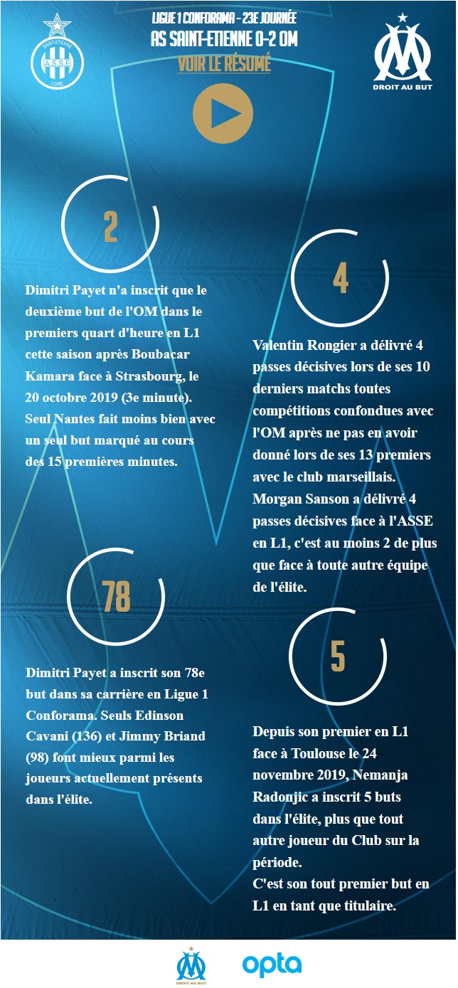Grâce à des buts de Payet et Radonjic en tout début et en toute fin de rencontre, l'OM s'est imposé sur la pelouse de l'AS Saint-Etienne. Un match auquel les supporters marseillais n'ont pas pu assister. Un seul changement dans le onze Trois jours après le match nul à Bordeaux (0-0), dimanche soir, l'OM est de nouveau sur le pont avec un déplacement dans le Forez pour y affronter Saint-Etienne en clôture de la 23e journée de Ligue 1 Conforama. André Villas-Boas a fait confiance aux titulaires face aux Girondins à une exception près. Sarr est redescendu sur le flanc droit de la défense à la place de Sakai alors que le poste d'ailier droit était confié à Radonjic. Sans les supporters marseillais Des affrontements à l'extérieur du stade stéphanois lors de l'arrivée des supporters olympiens, des bus caillassés, l'intervention des forces de l'ordre, un match décalé de quinze minutes en raison des gaz lacrymogènes utilisés pour disperser la foule... Le déplacement des supporters de l'OM a été mouvementé. Et finalement, les 400 fans du club marseillais qui avaient fait le voyage dans le Forez n'ont pas assisté à la rencontre. Lors de la première période, ils étaient sur le parking de l'enceinte stéphanoise, où des incidents ont à nouveau eu lieu, avant de finalement rentrer à Marseille, avant la mi-temps. Payet ouvre la marque Après seulement 7 minutes de jeu, Payet se retrouvait sur son côté gauche. Il fixait alors M'Vila et après deux crochets le long de la ligne, il frappait de l'extérieur du gauche et trompait Ruffier qui avait anticipé le centre et ouvert une toute petite fenêtre au premier poteau. Sur son premier tir, et le seul de la première période, l'OM débloquait la situation et entamait de la meilleure des manières la rencontre. Le numéro 10 olympien mettait également fin à 193 minutes de jeu sans but de l'OM en Ligue 1 Conforama. La dernière réalisation marseillaise dans l'élite remontant à la 84e minute du match à Rennes (20e journée). Radonjic creuse l'écart Alors que l'OM tremblait entre la petite alerte de Mandanda et les offensives vertes, Radonjic a permis aux siens de se mettre à l'abri en fin de partie. Sur un ballon récupéré par Germain, entré de jeu peu de temps avant, Sanson décalait Radonjic sur la droite d'une astucieuse talonnade. Le Serbe trompait Ruffier d'un tir dans le petit filet opposé. Quelques minutes plus tard, Radonjic laissait sa place à Strootman pour la fin de la rencontre. La bonne opération En s'imposant à Saint-Etienne, l'OM prolonge sa série d'invincibilité a réalisé un bon coup au classement. En effet, après la défaite de Rennes face à Lille, mardi soir, les hommes d'André Villas-Boas comptent désormais 6 points d'avance sur le troisième, le Stade Rennais, et l'écart face au quatrième, Lille reste identique, à savoir 9 longueurs. Dès samedi à 17h30, les joueurs de l'OM seront sur le terrain de l'Orange Vélodrome pour la réception de Toulouse à l'occasion de la 24e journée de Ligue 1 Conforama. |