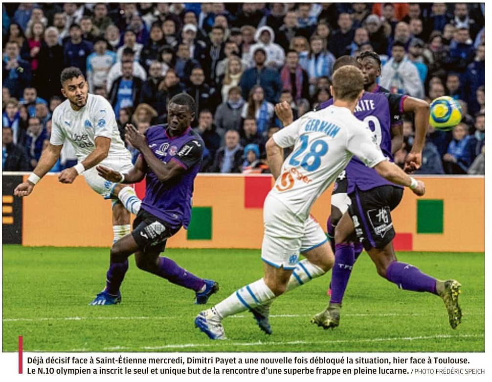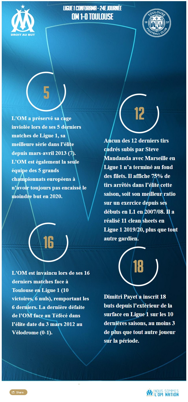 Signé Dimitri Payet ! Un nouveau bijou de Dimitri Payet, le deuxième de la semaine, a permis à l'OM de s'imposer face à la lanterne rouge du championnat, Toulouse. Le onze de départ Pour affronter Toulouse, lanterne rouge du championnat, André Villas-Boas effectue deux changements majeurs dans son onze de départ. Annoncé forfait en conférence de presse, Dario Benedetto est suppléé par Valère Germain à la pointe de l'attaque olympienne. L'autre modification concerne Valentin Rongier. Seul Marseillais à avoir disputé l'intégralité des matches en Janvier-Février, le milieu de terrain est laissé sur le banc par son coach afin de souffler un peu. C'est Maxime Lopez qui le remplace. Steve Mandanda, incertain, est bel et bien titulaire et porte évidemment le brassard. Le onze de départ olympien : Mandanda (cap) - Sarr, Gonzalez, Caleta-Car, Sakai - Lopez, Kamara, Sanson - Radonjic, Germain, Payet. La première mi-temps Dès la première minute, l'OM était tout proche de se faire surprendre par un ancien olympien. Lancé en profondeur, Leya Iseka éliminait Mandanda et poussait le ballon sur le poteau. Le cuir revenait sur Alvaro Gonzalez qui dégageait en corner. Le TFC se procurait une nouvelle occasion dangereuse par l'intermédiaire de Boisgard mais l'homme du moment, en grande forme , Steve Mandanda repoussait du pied. Après dix minutes compliquées, l'OM a remis petit à petit le pied sur le ballon s'approchant du but toulousain. D'ailleurs, le gardien du TFC Kalinic, peu inquiété jusque-là, ressentait une douleur et cédait sa place à Reynet. En toute fin de période, l'OM manquait de peu d'ouvrir le score. Servi par Payet, Radonjic frappait mais le gardien toulousain s'imposait. La deuxième mi-temps Le tableau d'affichage n'est pas resté vierge très longtemps dans cette deuxième période. Six petites minutes et un bijou signé Dimitri Payet permettait aux Olympiens de prendre l'avantage. Le décalage de Bouna Sarr était parfait pour le numéro 10 olympien qui décochait une frappe pleine lucarne et imparable pour Baptiste Reynet. Le reste du temps, l'OM a maîtrisé sa rencontre. Bien sûr, il aurait pu aggraver le score lorsque Khaoui, entré en jeu quelques minutes plus tôt, butait sur Reynet ou lorsque Payet, parti seul au but ne trouvait pas le cadre. Les Toulousains se sont aussi montrés actifs dans la surface marseillais, mais la défense était beaucoup trop solide pour être inquiétée. L'OM enchaîne un treizième match consécutif sans défaite en championnat ! Impressionnant ! La série continue Une nouvelle fois, l'OM n'a pas encaissé de but. Parmi, les cinq grands championnats européens, il s'agit de la seule équipe à avoir une telle statistique en 2020. Et si les Olympiens parviennent à garder leur cage inviolée, ils le doivent à une équipe solide défensivement mais surtout à leur gardien et capitaine, Steve Mandanda, impérial dans ses cages. Face à Toulouse, le portier à réalisé des parades de grande classe à l'image de celle réussie devant la reprise de volée de Leya Iseka. Rassurant dans ses sorties aériennes et dans ses relances, Steve Mandanda a encore prouvé qu'il est un gardien exceptionnel. Rendez-vous à Lyon Le marathon continue pour les Olympiens qui disputent ce mercredi 12 février leur quart de finale de coupe de France. Un gros match attend Villas-Boas et ses joueurs qui se rendront au Groupama Stadium pour affronter Lyon. En championnat, les Olympiens confortent leur place de dauphin et comptabilisent 49 points, soit 9 de plus que leur prochain adversaire en championnat, Lille.