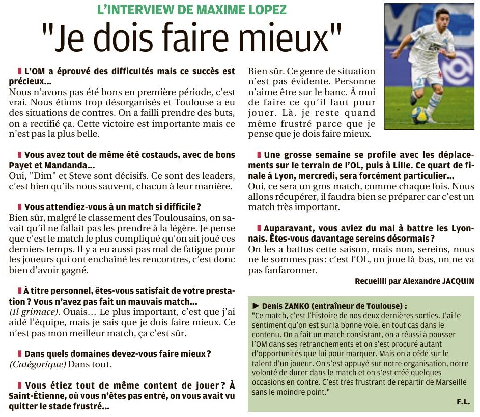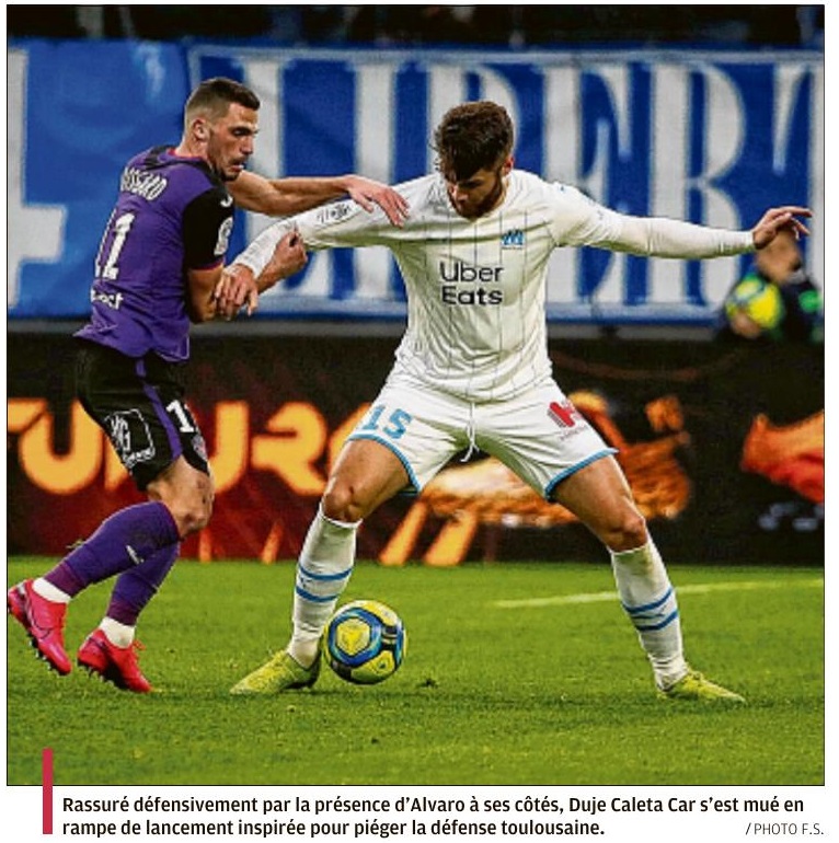 Le Croate, à l'origine du but de l'OM, progresse sans cesse et sa suspension pèsera lourd à Lyon André Villas-Boas le soulignait vendredi : Duje Caleta Car est dans une forme éblouissante. Et il est évident que l'apport d'un défenseur expérimenté et madré comme Alvaro Gonzalez à ses côtés lui a permis de s'affirmer, l'Espagnol jouant auprès du Croate le rôle qu'aurait dû tenir Adil Rami la saison dernière. Une saison très mal entamée à Nîmes, mais bien mieux finie, avec la constitution d'une charnière jeune avec Kamara, qui avait redonné vie à la défense olympienne à partir de février. Ça n'était pas suffisant pour tenir toute une saison et le recrutement d'Alvaro a été une excellente initiative, les qualités d'un joueur se lisant aussi à travers son art de bonifier les autres. Pourtant, dans un match où l'OM était appelé à dominer un adversaire très regroupé, on n'attendait pas la charnière centrale olympienne pour faire la différence. Défensivement certes, mais pas offensivement. D'ailleurs, la feuille de match ne dira rien d'autre que but de Dimitri Payet, passe décisive de Bouna Sarr. Cependant, dans un schéma de siège où l'OM devait à la fois se préserver des contres (nombreux et très dangereux en première période) et trouver la solution pour percer ou contourner la double muraille toulousaine, il était important d'avoir des joueurs capables de venir de derrière ou de frapper en dehors de la surface. Venir de loin, c'est toujours l'apanage des latéraux, mais malheureusement, les centres de Bouna Sarr trouvent toujours le vide ; il est plus efficace quand il perce comme face à Strasbourg ou joue court, comme sur le but de Payet, meilleur exemple de l'utilité de frapper de loin. Depuis quand l'OM n'avait-il pas marqué depuis l'extérieur de la surface en championnat ? Depuis le 4 octobre, par Benedetto à Amiens. Et auparavant par Payet à Monaco, début septembre. Alors qu'en Coupe de France, Payet, encore et toujours, a marqué ainsi contre Trélissac et Granville, Radonjic face à Granville aussi et Kamara contre Strasbourg. Mais si Alvaro Gonzalez a délivré pour sa part une frappe enroulée du pied gauche, absolument superbe à la 48e minute, qui a frôlé la lucarne, l'apport des défenseurs centraux était aussi important dans la construction et c'est là que l'on a pu constater à quel point Duje Caleta Car n'était plus ce joueur accablé, tête basse de ses premiers mois marseillais, mais un homme plus sûr de lui. Ouverture de l'extérieur Déjà, en octobre, face à Strasbourg, on avait pu admirer sa qualité de frappe, quand, après un appui sur Radonjic, il avait trouvé la transversale. Mais hier, sans avoir une telle occasion, il a su oser sortir balle au pied, éviter les passes trop faciles à cinq mètres pour prendre de véritables initiatives. Ouvertures en profondeur, transversales, il a étalé une belle technique, jusqu'à ce ballon envoyé de l'extérieur du pied droit, dans la course d'Amavi, dans le dos de la défense toulousaine, enfin prise à revers. À l'arrivée, le ballon repoussé a terminé dans les pieds de Dimitri Payet qui a accompli l'essentiel. Mais à la pensée que Caleta Car sera suspendu mercredi à Lyon, même si l'an passé il a été expulsé deux fois face à l'OL, on se dit déjà qu'il va beaucoup manquer... Par Mario Albano |