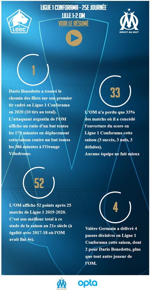 Mené au score face à Lille, l'OM a su redoubler d'efforts pour inverser la tendance et s'imposer grâce à Benedetto et un but contre son camp de Reinildo. La composition face à Lille Pour affronter le LOSC, André Villas-Boas doit faire face à une absence de taille avec le forfait de son meilleur buteur, Dimitri Payet (8 buts). En revanche, le technicien portugais enregistre plusieurs retours : Benedetto est titulaire à la pointe de l'attaque olympienne. Tout comme Caleta-Car et Amavi qui, suspendus en coupe de France, retrouvent leur place dans la défense olympienne. Laissé sur le banc face à Lyon, Steve Mandanda retrouve son brassard de capitaine. Au milieu de terrain, Kamara, en sentinelle, est entouré à ses côtés de Rongier et Sanson. Enfin, la zone offensive olympienne est occupée par Sarr, Benedetto et Valère Germain. André Villas-Boas reconduit son 4-3-3. La première mi-temps C'est le genre de match qu'aucune équipe ne veut perdre au cours duquel il est difficile de trouver des espaces. Pour autant, dès la quatrième minute, Osimhen était trouvé et voyait sa frappe superbement détournée par Steve Mandanda. Rapidement sollicité, le capitaine olympien s'illustrait une nouvelle fois au quart d'heure de jeu devant la reprise de Rémy. L'OM tenait bon lors du temps fort lillois et se procurait une première situation initiée par Amavi. Le latéral gauche trouvait Sanson qui décalait Sarr. Ce dernier lui remettait le ballon, Sanson frappait mais ne trouvait pas le cadre. Dans une première mi-temps compliquée dominée par les Lillois, et entachée de trois cartons jaunes à l'encontre de Caleta-Car, Amavi et Benedetto, les deux équipes rejoignaient le vestiaire sur un score nul et vierge. La deuxième mi-temps La deuxième mi-temps ne pouvait pas plus mal commencer pour les hommes de Villas-Boas qui encaissaient tout de suite un but. Lancé par Bamba, Osimhen remportait son face à face avec Mandanda. Les Olympiens subissaient une deuxième alerte avec un autre but lillois, signé Rémy, mais refusé pour une position de hors-jeu. Menés au score, les Olympiens se livraient un peu plus. Fauché dans la surface de réparation, Bouna Sarr obtenait un penalty, manqué par Valentin Rongier. La suite de la rencontre tournait à l'avantage des Marseillais. Deux minutes décisives Il aura suffi de deux petites minutes aux Olympiens pour inverser la tendance dans cette rencontre. Les Marseillais ont poussé pour égaliser et ont été récompensés de leurs efforts. Sur un corner botté par Sanson, Germain venait couper de la tête au premier poteau. Son coup de tête était dévié par Reinildo dans ses propres buts. Sur l'attaque suivante, c'est Pipa Benedetto qui reprenait un excellent centre de Germain. L'attaquant argentin retrouvait le chemin des filets et sa joie se lisait sur son visage. L'OM signe un 14e match consécutif sans défaite en Ligue 1 Conforama. La bonne opération L'OM sort vainqueur de ce duel de haut de tableau et creuse un peu plus l'écart sur ses poursuivants. Désormais, les Olympiens ont onze points d'avance sur Rennes, douze sur leur adversaire du soir, Lille. C'est la bonne opération du week-end. Le prochain rendez-vous des Olympiens est un match à domicile, face au FC Nantes, samedi 22 février à 17h30. |