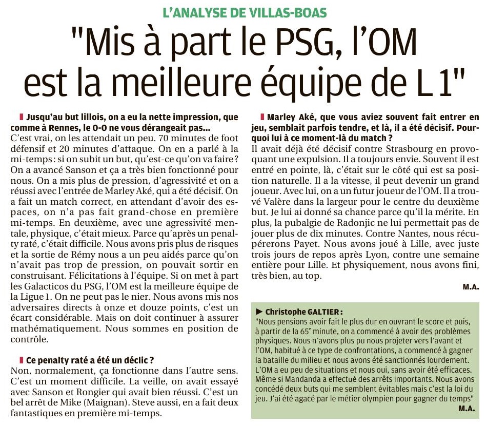 Malmené par Lille, l'OM a renversé le match en deux minutes (1-2) et, avec 12 points d'avance sur le 4e, voit la Ligue des champions d'un peu plus près encore Cet OM est tout simplement incroyable. Renversant même, pourrait-on ajouter tant il a su inverser le cours d'un match qui lui échappait après avoir pris en pleine face la tempête Victor (Osimhen), au début de la seconde période de ce choc en altitude (1-2), à Lille. Le plan échafaudé par André Villas-Boas, qui avait si bien fonctionné à Rennes (0-1) et à Bordeaux (0-0), venait de voler en éclats. Il avait tenu presque miraculeusement grâce à des parades d'exception signées Steve Mandanda face à ce même Osimhen (4), puis Loïc Rémy (15). Menés, voyant leurs adversaires d'un soir revenir virtuellement à six longueurs, les Olympiens ne pouvaient plus décemment abandonner le ballon et l'initiative du jeu aux Lillois, ni évoluer avec un double-rideau extrêmement bas, histoire d'éviter les courants d'air dans leur dos. Alors, ils ont enfin retrouvé de l'ambition, cessant ces gains de temps récurrents ou ces passes à répétition vers l'arrière. Ils se sont mis à accélérer et à jouer. À regarder cette équipe lilloise dans le blanc des yeux, oubliant la crainte de se faire poignarder par un contre dans le dos. Privé de son maître à jouer Dimitri Payet, resté à Marseille pour soigner une cuisse douloureuse et être présent pour les échéances à venir, "AVB" a également pesé de tout son poids par son coaching inspiré et audacieux. Deux minutes décisives Le fougueux Marley Aké, lancé à la place de Hiroki Sakai après le penalty foiré par Valentin Rongier (58), s'est mué en trublion depuis le côté gauche, détonateur de la rebellion marseillaise. Dans un joli clin d'oeil que seul le football sait enfanter, le duo Germain-Benedetto, au pain sec et à l'eau depuis des lustres, a retrouvé une inefficacité qui le fuyait à mesure qu'il collectionne les critiques (lire en page suivante). En deux minutes, l'OM a plié cette affiche au sommet et muselé des Dogues soudain sans mordant, comme sonnés par ce but sur corner de Germain (accordé néanmoins à Reinildo hier soir par la LFP, 67) et ce jaillissement au premier poteau accompli avec rage par l'Argentin (69). L'OM n'a jamais été véritablement inquiété par la suite, les quelque 1100 supporters marseillais ont chanté à gorges déployées, à mesure que le stade Pierre-Mauroy se vidait. Au coup de sifflet final, Mandanda, Caleta Car et tous les autres ont exulté, conscients qu'ils venaient de frapper un coup immense. Cette nouvelle victoire leur ouvre des perspectives des plus réjouissantes. Lille, toujours scotché au pied du podium, ne les reverra plus, si ce n'est de loin, avec ces douze points de retard. Rennes, 3e et défait à Reims (1-0) un peu plus tôt hier, regarde l'OM d'un peu plus près. Mais avec onze longueurs de moins, tout de même, un matelas qui autorise toutes les folies et toutes les projections. À treize étapes de l'arrivée finale, les hommes de Villas-Boas ont quasiment composté leur billet pour la prochaine Ligue des champions. Il faudrait qu'ils s'effondrent littéralement pour laisser échapper cette qualification qui se refuse au club depuis 2013. Difficile à imaginer avec un calendrier allégé, et une seule date par semaine. Ils ne font pas tout bien, se contentent parfois du minimum et cherchent trop à gérer. Mais, et ils l'ont encore démontré dans le Nord, ils possèdent un sacré caractère, une bonne dose de réussite et désormais une marge encore plus confortable. Ils sont plus que jamais sur la voie royale. Par Fabrice Lamperti, envoyé spécial à Villeneuve d'Ascq |