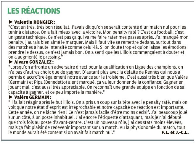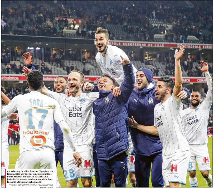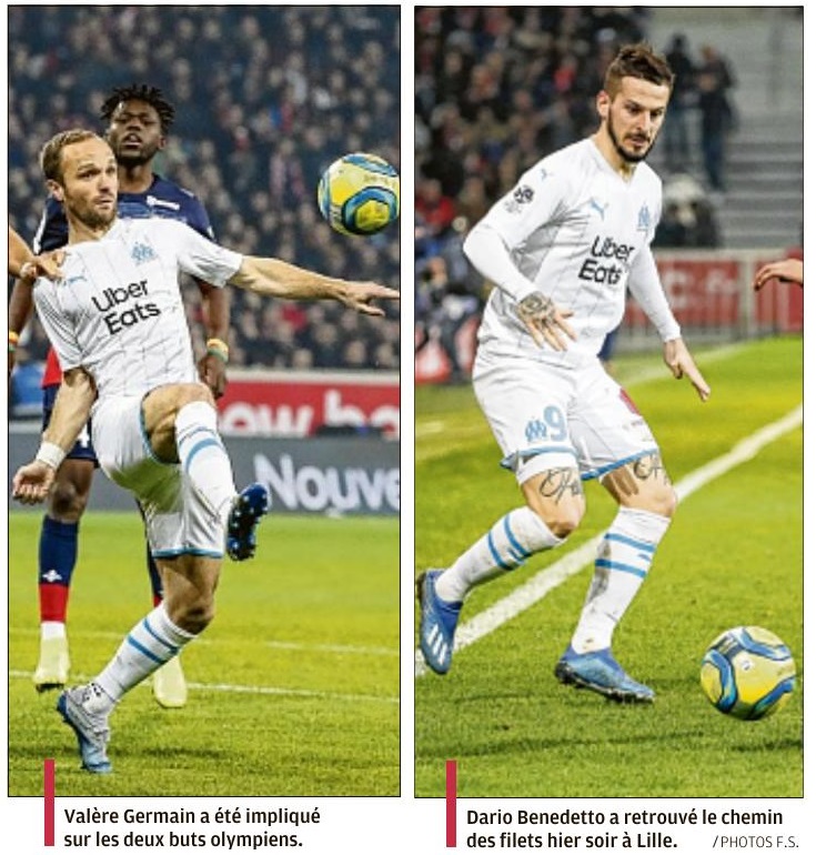 Valère Germain et Dario Benedetto ont permis à l'OM de renverser le Losc Un symbole qui vaut cher. Décriés en première partie de saison, muets sur la phase retour du championnat et cloués au pilori, fantomatiques pendant 45 minutes, Valère Germain et Dario Benedetto ont réussi à vaincre le signe indien en inscrivant chacun un but, hier, à Lille. Un petit événement dans l'effectif olympien : le Marseillais n'avait plus marqué depuis la 6e journée de Ligue 1, contre Montpellier (1-1) fin septembre, tandis que l'Argentin ne trouvait plus le chemin des filets depuis la victoire contre Nîmes, fin décembre (3-1), pour la 19e journée. Positionné sur l'aile gauche au coup d'envoi, puis exilé à droite après le remplacement d'Hiroki Sakai par Marley Aké, mais longtemps cantonné aux tâches défensives ou aux coups de pied de dégagement, Germain est donc sorti de sa boîte après l'heure de jeu, alors que l'OM était mené 1-0 et venait de louper un penalty (manqué par Valentin Rongier). D'un coup de tête croisée, dévié par Reinildo (à qui la LFP a attribué un CSC), à la réception d'un corner tiré par Morgan Sanson, il a catapulté le ballon dans la cage de Mike Maignan (67). Rien de tel pour exulter devant le kop marseillais, fêter son troisième but de la saison et oublier, le temps d'un instant, les critiques dont il fait l'objet. À peine deux minutes plus tard, c'est l'Argentin qui a retrouvé la lumière, après un bon travail du jeune Aké (qui avait d'ailleurs obtenu le corner sur l'égalisation olympienne) et un centre au cordeau de Valère Germain, en marquant à bout portant (69). Sa huitième réalisation en championnat. Un coup du sort suffisant pour éteindre les ardeurs du public du stade Pierre-Mauroy et réveiller les nombreux supporters de l'OM présents, pas seulement dans le parcage visiteurs. Aucun joueur du onze de départ n'avait marqué en L1 en 2020 Il y avait pourtant de quoi nourrir quelques inquiétudes avant le coup d'envoi au sujet de cette formation olympienne, toujours privée de Florian Thauvin et orpheline de son maître à jouer Dimitri Payet, préservé après une contracture à la cuisse gauche contre Lyon, mercredi dernier. Sans oublier Nemanja Radonjic, enquiquiné par un problème de pubalgie, même si le Serbe a remplacé "Pipa" (83) pour les dernières minutes de la partie. Preuve de la disette des attaquants et du néant offensif de ces dernières semaines, aucun joueur du onze de départ aligné par André Villas-Boas n'avait marqué en championnat en 2020. Et la première période n'a pas donné plus d'assurance au coach portugais, le seul tir (non cadré) ayant été l'oeuvre de Sanson (19) après une incursion de Jordan Amavi et un une-deux astucieux avec Bouna Sarr. Ce dernier, d'abord positionné en ailier droit, a ainsi été le joueur offensif le plus entreprenant. Au coup de sifflet final, Valère Germain serrait les poings avant de tomber dans les bras de ses coéquipiers, Dario Benedetto sortait du banc avec sa parka sur le dos, sourire aux lèvres. Avec le reste de l'effectif, ils pouvaient danser devant leurs supporters, et bien plus que ça, pour fêter cette victoire ô combien importante. Deux buts et une passe décisive pour deux joueurs qui étaient au fond du trou depuis plusieurs semaines, voire plusieurs mois : il faut encore se pincer pour y croire ! Par Jean-Claude Leblois, envoyé spécial à Villeneuve d'Ascq |
