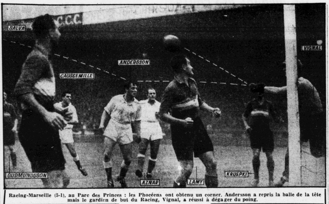 Au Racing, ou Salva déçu (Dard le battit souvent) et où Vignal ne peut guère être jugé, Lamy fit un match extraordinaire. Après lui, le jeune Ballot, Arangelovic, Gudmundsson et Foix (qui marqua 3 buts) furent les plus en évidence. Mahjoub qui termina blessé, manque de punch pour faire un avant-centre. À l'O.M., les jeunes, trop jeunes éléments, en fait tout leur devoir. Il est difficile de faire des reproches à Morand, mais qui eut fait mieux ? Il eut pu arrêter un but, peut-être deux en comptant celui de Scotti, mais il en para bien d'autres. Gransart eut aussi des fautes de jeunesse, mais il lutta avec un coeur admirable et le jeune espoir Foix n'eut pas souvent l'avantage. Rossi, par contre, fut moins bon et Caussemille, à l'extrême gauche, vraiment malheureux. Et pourtant, il semble avoir de l'étoffe mais il jouait en compagnie si relevée. Les sept titulaires firent tout leur devoir et luttèrent avec un courage et une technique digne d'un meilleur sort. Gabet, le prestigieux Gabet, ne fit jamais la loi devant un Salem remarquable en tout point, et Johansson ne lui fut nullement inférieure, Scotti, hors de reproche de ne pas se replier assez, mérita au moins la comparaison avec Arnaudeau. Ils eurent le mérite, malgré un labeur défensif écrasant, de soutenir l'attaque, voire d'y participer. |
