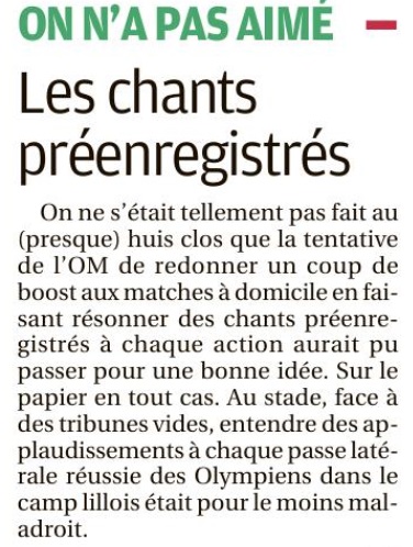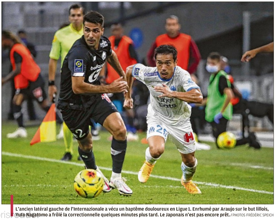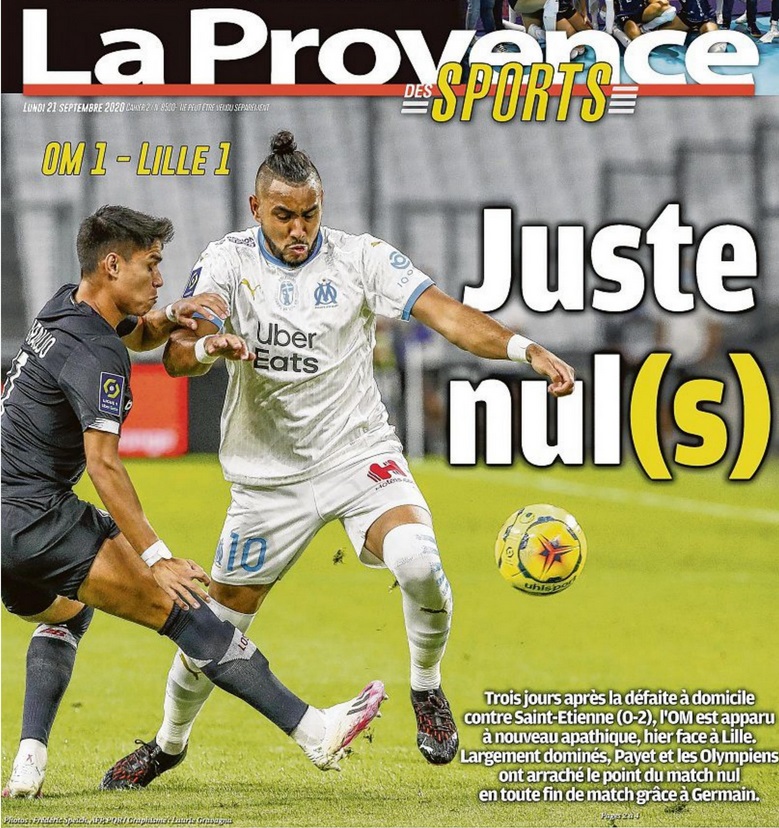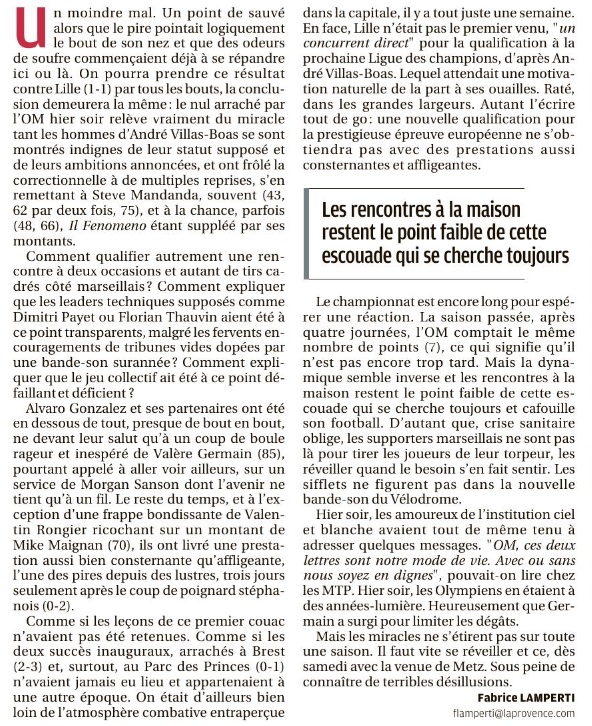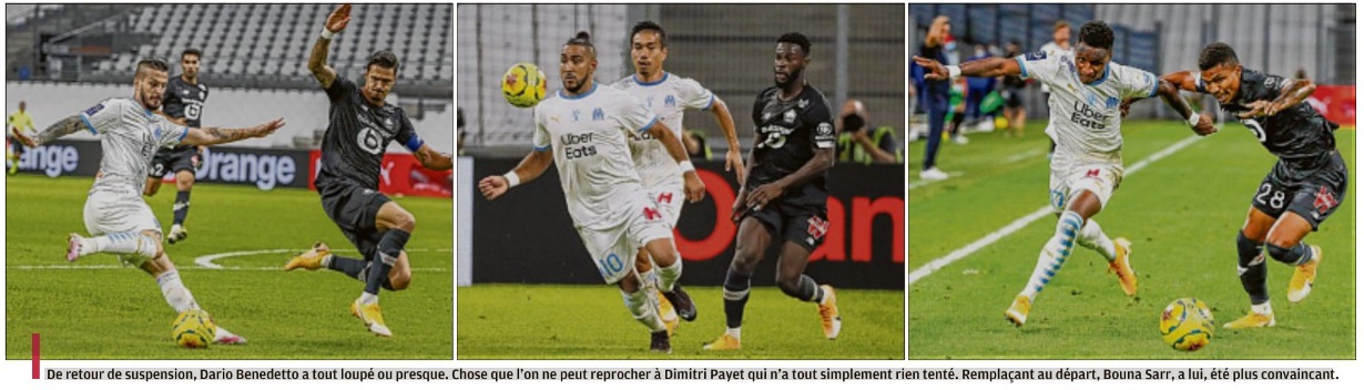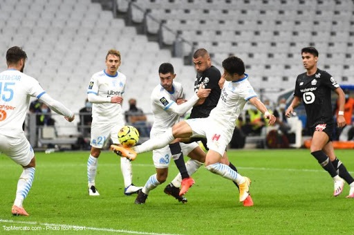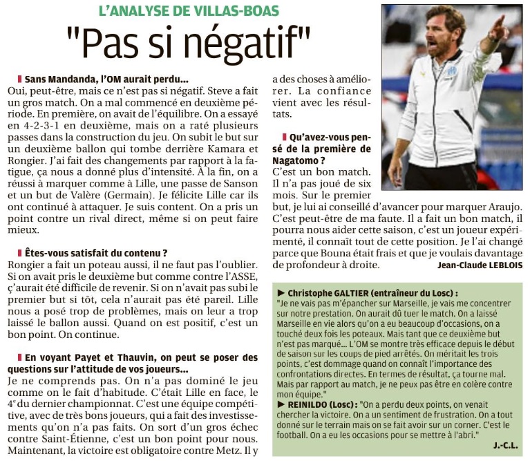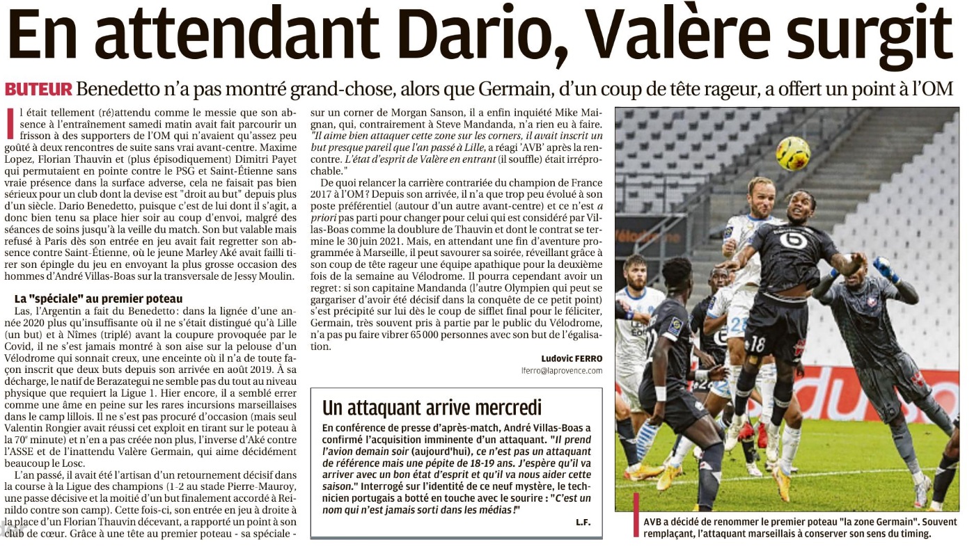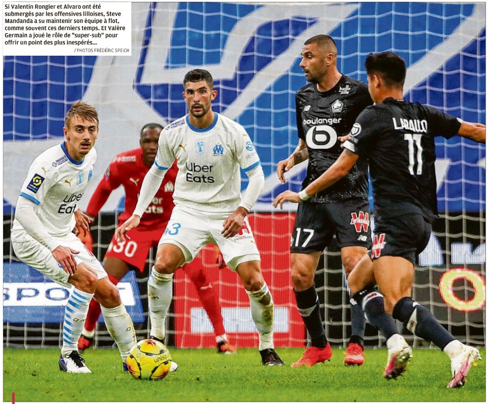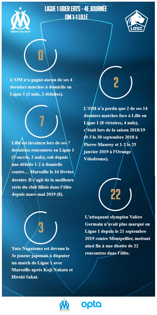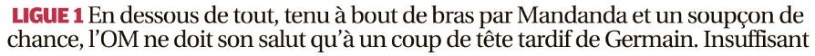 OM - LOSC (1-1) : Germain offre le nul à l'OM Un coup de tête de Germain a permis à l'OM de récolter le point du match nul face à Lille. Impérial, Steve Mandanda a maintenu son équipe dans la rencontre grâce à ses nombreux arrêts. Nagatomo titulaire Il n'était pas qualifié pour affronter Saint-Étienne jeudi dernier mais cette fois, tous les feux étaient au vert pour Yuto Nagatomo. Pour la première fois de la saison, le Japonais était aligné au poste de latéral gauche. En plus de la titularisation de Dario Benedetto à la pointe de l'attaque olympienne, il s'agit des deux changements effectués par André Villas-Boas par rapport à la dernière composition d'équipe. Pour sa première à l'Orange Vélodrome, Yuto Nagatomo a reçu un carton jaune (20e) et a cédé sa place à Bouna Sarr à l'heure de jeu. But refusé à Lille Alors que les Olympiens rentraient dans la rencontre en mettant beaucoup d'intensité, ils se faisaient surprendre dès la quatrième minute. Lancé en profondeur, Yilmaz trompait Mandanda, mais à la fin de l'action, l'arbitre levait son drapeau et signalait une position de hors jeu. Bien en place, les deux équipes se découvraient peu. Les Olympiens multipliaient les centres qui ne trouvaient pas preneur. De leur côté, les Lillois faisaient face à une défense marseillaise solide, à l'image d'un Boubacar Kamara agressif sur le porteur du ballon ou bien d'un Duje Caleta-Car, auteur de tacles efficaces. Les arrêts de Mandanda Impérial depuis le début de saison, Steve Mandanda s'est à nouveau illustré face à Lille. Le capitaine marseillais a repoussé la plus grosse occasion de la première mi-temps : une frappe à mi-hauteur du défenseur lillois Celik. S'il a encaissé un but en deuxième période, le portier olympien a aussi maintenu son équipe dans le match en détournant une frappe puissante d'Araujo en corner. Et comme le dit si bien le proverbe, jamais deux sans trois... le voilà une nouvelle fois, qui était, décisif sur la tête de Benjamin André. L'OM rapidement surpris Deux petites minutes ont suffi aux Lillois pour débloquer la situation en deuxième période. Lancé par Bamba sur son côté droit, Araujo éliminait Yagatomo et trouvait le chemin du but. Inattentifs sur l'engagement, les Marseillais perdaient le ballon et évitaient de peu le deuxième but sauvés par le poteau. Maignan, lui aussi, pouvait remercier son poteau qui repoussait la tentative lointaine de Rongier. Le coup de tête de Germain Entré en jeu en deuxième période, Valère Germain a égalisé pour l'OM en toute fin de rencontre. D'un coup de tête, il reprenait le corner de Morgan Sanson. Ce but permet à l'OM de récolter un point face à une équipe lilloise difficile à manoeuvrer. Les Olympiens enchaîneront un troisième match consécutif à domicile avec la réception du FC Metz samedi 26 septembre à 21 heures.