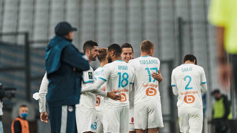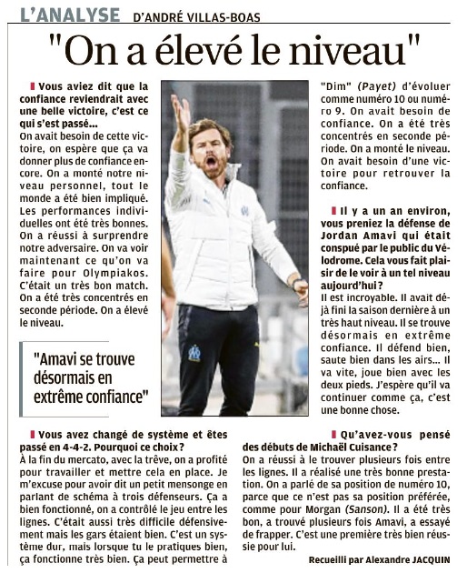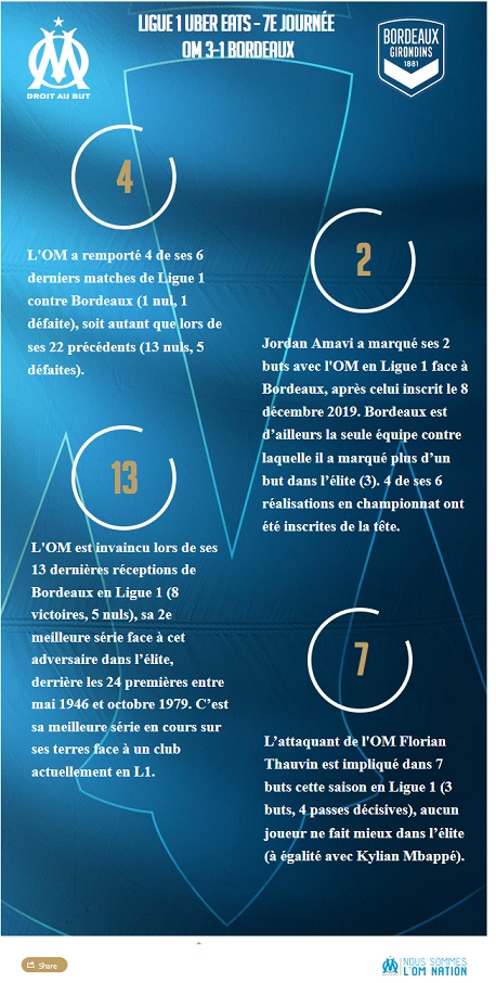 OM - Bordeaux (3-1) : cadeau d'anniversaire Face à Bordeaux, les Olympiens ont remporté leur première victoire à domicile (3-1). L'occasion pour eux de célébrer l'anniversaire de leur coach de la plus belles des manières. La première de Cuisance Michael Cuisance. Arrivé dans les dernières heures du mercato, Michaël Cuisance a disputé face à Bordeaux, ses premières minutes avec son nouveau club. Titulaire au poste de numéro 10, l'Espoir olympien remplaçait Dimitri Payet, suspendu après avoir écopé un carton rouge face à Lyon. Les Marseillais arboraient un nouveau système de jeu, un 4-4-2 losange, avec une attaque emmenée par Florian Thauvin et Dario Benedetto. Soir de première également pour Luis Henrique, qui remplaçait Dario Benedetto en fin de rencontre. Spéciale Flotov Florian Thauvin. L'OM n'a mis que cinq petites minutes pour concrétiser sa bonne entame de match. Un but signé Florian Thauvin, auteur de sa spéciale. À l'origine du but, une subtile louche de Cuisance pour Sakai. Le Japonais libérait le ballon pour Thauvin, qui du pied gauche, enroulait magnifiquement le cuir qui se logeait dans la lucarne de Costil. Il inscrivait là son troisième but depuis le début de la saison. Une première mi-temps animée Rapidement en tête au tableau d'affichage, les Olympiens se montraient dangereux. Les montées d'Amavi sur son côté gauche donnaient du fil à retordre aux Bordelais, notamment à Sabaly qui provoquait un penalty. Florian Thauvin, déjà buteur, frappait côté droit mais voyait son tir stoppé par Benoît Costil. Les Girondins profitaient d'un contre pour s'approcher du but de Mandanda, et, Ben Arfa pensait égaliser mais, signalé hors-jeu, voyait son but refusé. Bien en place et aidé par les bonnes sortie de Steve Mandanda, l'OM menait 1-0 à la pause. Amavi, forte tête Il a provoqué le penalty en première mi-temps, il a marqué le deuxième but d'un joli coup de tête, puis il a vu sa frappe déviée par Pablo dans la cage bordelaise : pas de doute, Jordan Amavi a réalisé un grand match. Son deuxième but, grâce à une passe décisive de Thauvin, a permis à l'OM de se mettre à l'abri. Largement dominés, les Bordelais essayaient tant bien que mal d'inquiéter les Marseillais mais étaient écoeurés par un Steve Mandanda impérial notamment lorsqu'il repoussait la tentative de Basic. Ils y parvenaient finalement, en fin de rencontre, par l'intermédiaire de Maja, qui réduisait la marque sur un contre. Cette victoire, les Olympiens l'attendaient, en effet, ils ne s'étaient pas encore imposés à domicile cette saison. Maintenant, l'OM a rendez-vous avec la Ligue des Champions mercredi 21 octobre, avec le premier match de sa phase de groupe face à l'Olympiakos. Joyeux anniversaire coach ! Quoi de mieux qu'une victoire pour célébrer son anniversaire ? Le coach olympien fêtait ses 43 ans ce samedi 17 octobre. D'ailleurs, après sa superbe réalisation, Florian Thauvin se dirigeait vers son entraîneur afin de lui dédier son but. Au passage, André Villas-Boas fêtait aussi son 400e match officiel en tant qu'entraîneur ! Joyeux anniversaire coach ! |