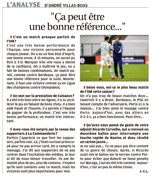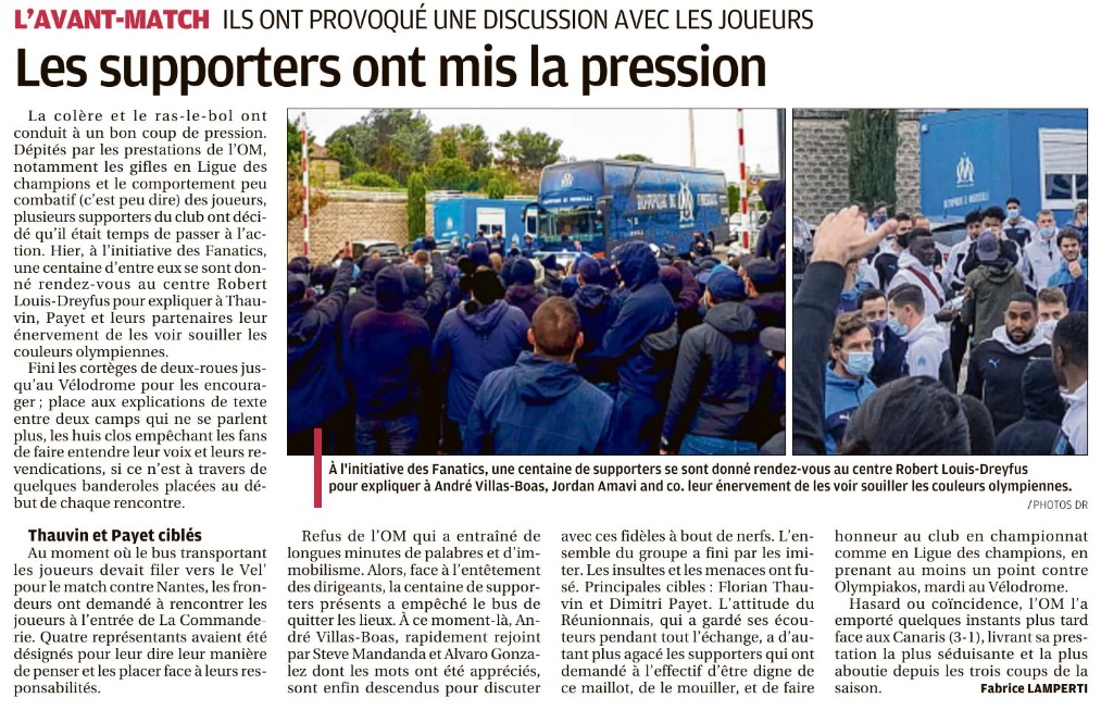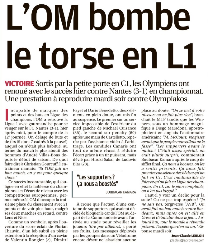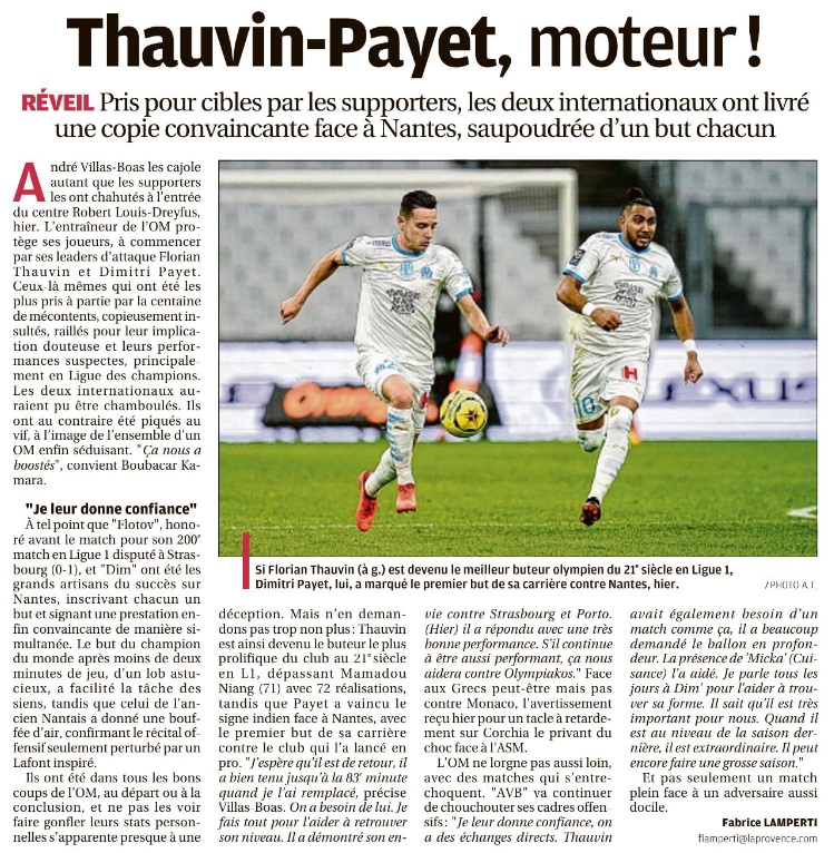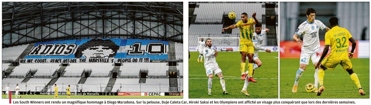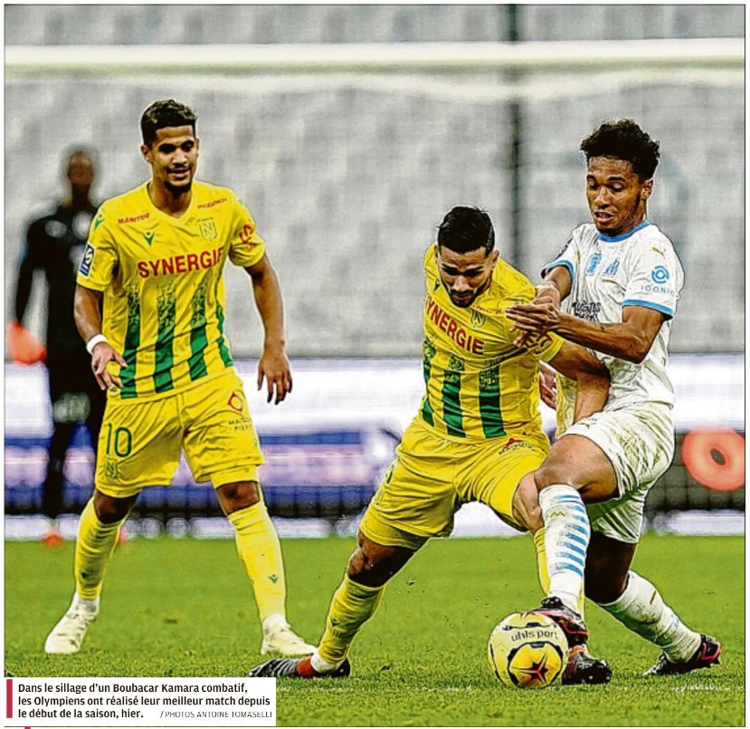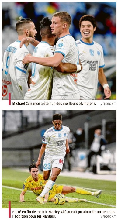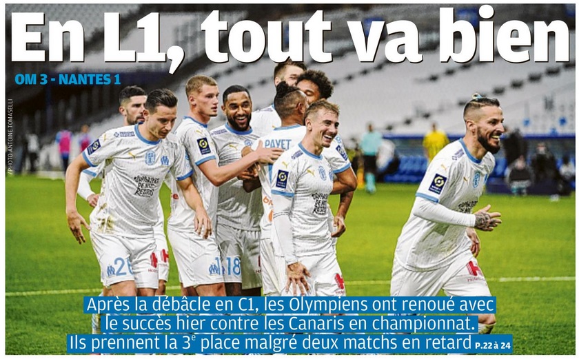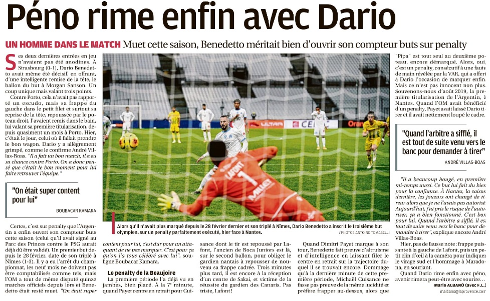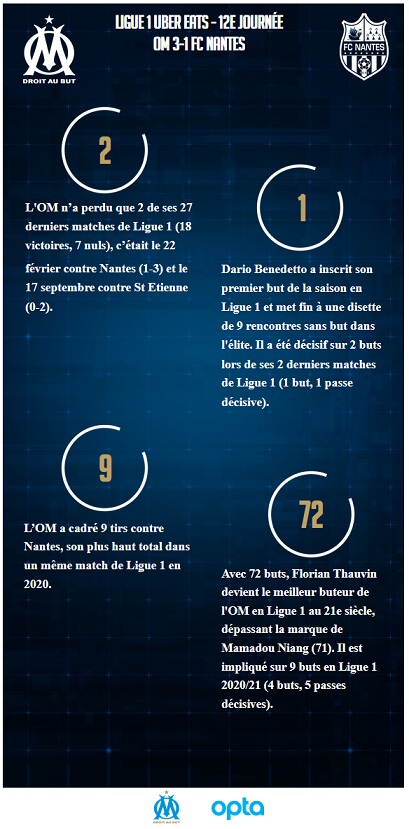 OM - Nantes (3-1) : OM plaisir Dominateurs dans tous les domaines, l'OM s'est imposé face à Nantes (3-1). Dario Benedetto a débloqué son compteur en transformant son penalty. L'hommage à Maradona Une légende du football s'est éteinte ce mercredi 25 novembre. Diego Maradona est décédé à l'âge de 60 ans. Aujourd'hui, c'est le monde entier qui lui rend hommage et cette 12e journée de Ligue 1 Uber Eats lui est dédiée. Pas de Jump pour l'entrée des joueurs face à Nantes, mais une musique en l'honneur du numéro 10 légendaire " La mano de Dios " de Rodrigo. L'ensemble du corps arbitral et des acteurs de la rencontre se sont réunis de manière à former un M durant la vidéo diffusée en mémoire de l'Argentin.Du changement dans le onze de départ Quatre changements sont à noter par rapport à la rencontre de Ligue des Champions face à Porto. Payet, Cuisance et Benedetto et Caleta-Car faisaient leur retour dans le onze de départ. Emmenés par leur capitaine Steve Mandanda, les Marseillais étaient disposés en 4-3-3. Titulaire au poste d'ailier droit, Florian Thauvin a reçu des mains du Président Jacque-Henri Eyraud et de Pablo Longario, directeur du football, un maillot encadré floqué " 200 " célébrant ses 200 matches joués en Ligue 1, cap qu'il a franchi lors de Strasbourg-OM. Le onze de départ olympien : Mandanda (cap) - Sakai, Gonzalez, Caleta-Car, Amavi - Rongier, Kamara, Cuisance - Thauvin, Benedetto, Payet. Début de match parfait Il ne fallait pas rater le coup d'envoi aujourd'hui. À peine deux minutes écoulées et voilà les Olympiens qui ouvraient le score. Sur une ouverture millimétrée de Rongier, Florian Thauvin devançait Lafont, et lobait le portier nantais. La volonté olympienne était claire, il fallait rapidement aggraver le score. Les occasions se succédaient mais les Olympiens tombaient sur un grand Lafont, auteur d'abord d'un double arrêt face à Cuisance, et Benedetto. Deux minutes plus tard, l'attaquant olympien échouait dans son face-à-face avec le portier canari. Un OM offensif Cet OM, c'est celui que l'on aime voir jouer. Un collectif solidaire qui enchaîne les jolis mouvements, qui alterne passes courtes et passes longues, et qui va de l'avant. Alors que les Olympiens avaient buté à plusieurs reprises sur Alban Lafont, ils finissaient par être récompensés de leurs efforts. 35e minute : Cuisance centrait en retrait pour Payet qui trouvait le petit filet. Le numéro dix olympien s'empressait de célébrer son but en le dédiant à sa petite fille venue au monde il y a quelques jours. Largement dominateurs, les Olympiens réussissaient une mi-temps proche de la perfection avec notamment sept tirs cadrées. Peu inquiété par les Canaris, Steve Mandanda faisait le travail lorsqu'il était sollicité sur une frappe de Louza. Benedetto enfin récompensé Il attendait son but avec impatience. Lui qui avait marqué un but valable face au PSG, qu'on lui avait injustement refusé, Dario Benedetto a enfin débloqué son compteur. Avec l'aide du VAR, l'arbitre accordait un penalty à l'OM frappé en force par l'Argentin. La communion entre tous les joueurs étaient belle à voir et le sourire sur le visage de Pipa, également. Les Olympiens largement devant au score n'étaient pas rassasiés et le camp nantais était surpeuplé de maillots bleu et blanc. Mais sur une offensive nantaise, Blas parvenait à réduire la marque d'une frappe imparable pour Mandanda. Après sa contre-performance face à Porto, l'OM a su réagir et s'est imposé avec la manière. Les Olympiens, qui comptent toujours deux matches de retard, signent leur sixième succès de la saison.