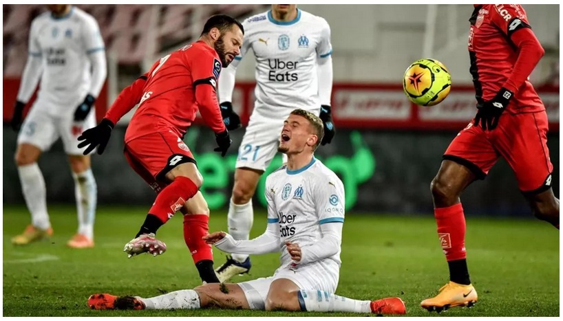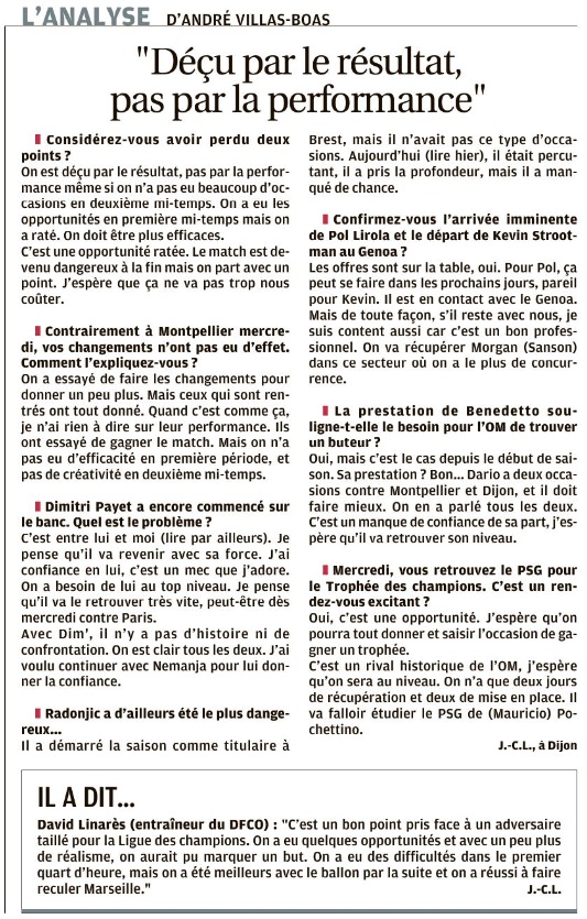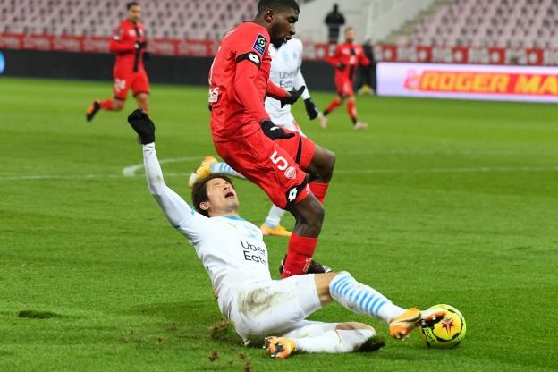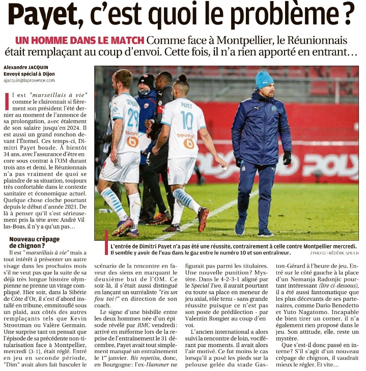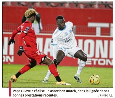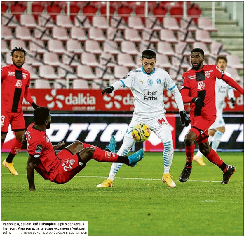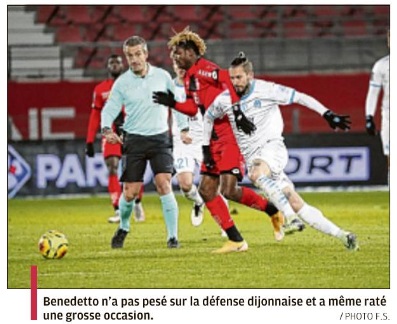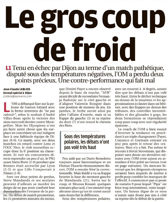Les occasions ratées en première période ont coûté cher à l'OM qui repart de Dijon avec le point du match nul (0-0). Le dernier match de la phase aller Satisfait de la victoire de ses joueurs face à Montpellier, trois jours auparavant, André Villas-Boas reconduit quasiment le même onze de départ avec une seule rotation. Valentin Rongier retrouve une place de titulaire au milieu de terrain à la place de Michaël Cuisance.Buteur face aux Héraultais, Nemanja Radonjic est pour la deuxième fois consécutive aligné au coup d'envoi. Si face à Dijon, il s'agit du dernier match de la phase aller, il reste deux rencontres à disputer en retard pour les Olympiens. La composition de l'OM en 4-3-3 : Mandanda (capitaine) - Sakai, Alvaro, Caleta-Car, Nagatomo - Rongier, Kamara, Gueye - Thauvin, Benedetto, Radonjic. Les occasions de Radonjic Dès le coup d'envoi, les Olympiens mettaient le pied sur le ballon et occupaient le camp dijonnais. Radonjic profitait d'un mauvais contrôle d'Ecuele Manga pour frapper (3e), mais le Serbe voyait son tir repoussé par le portier adverse. Décidés à rapidement ouvrir le score, les Marseillais étaient constamment présents dans la moitié dijonnaise. Sur son côté droit, Sakai prenait son couloir et trouvait Radonjic en retrait. Sa frappe repoussée par Racioppi, revenait dans les pieds de Benedetto, qui ne trouvait pas le cadre gêné par un défenseur. Juste avant la pause, Radonjic, une nouvelle fois, bien servi et seul au point de penalty, ne trouvait pas le cadre, la faute à un faux rebond juste avant de taper le cuir. L'OM sauvé par le poteau Étouffés durant le premier quart d'heure, les Dijonnais se sont peu à peu rebellés dans cette rencontre se procurant une grosse occasion. La frappe de Baldé (22e) côté gauche venait s'écraser sur le poteau de Steve Mandanda. La suite de la première mi-temps était plus équilibrée (51% de possession du ballon pour les Olympiens) mais aucune des deux formations ne parvenait à trouver le chemin des filets. Dans un froid glacial, l'OM et Dijon regagnaient le vestiaire sur un score nul et vierge. Trois changements d'un coup Dès le début de la deuxième période, l'OM avait la possibilité d'ouvrir le score. Superbement servi par Gueye, Radonjic décidait de frapper mais il butait sur le gardien. À l'heure de jeu, André Villas-Boas effectuait trois changements. Payet, Cuisance et Germain faisaient leur entrée en jeu à la place de Radonjic, Gueye et Benedetto. Les Olympiens faisaient face à un bloc adverse très bas. Difficile de trouver des espaces face une défense bien regroupée. Malgré une large possession du ballon, les Olympiens ne se sont procurés que trop peu de situations pour l'emporter Trophée des Champions Le temps de quelques jours, les Olympiens vont laisser le championnat de côté pour laisser place à une autre compétition : le trophée des Champions. Mercredi 13 janvier, les hommes d'André Villas-Boas affronteront le Paris-Saint-Germain à Lens. |