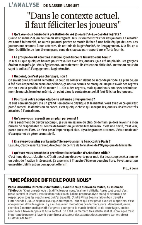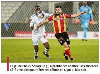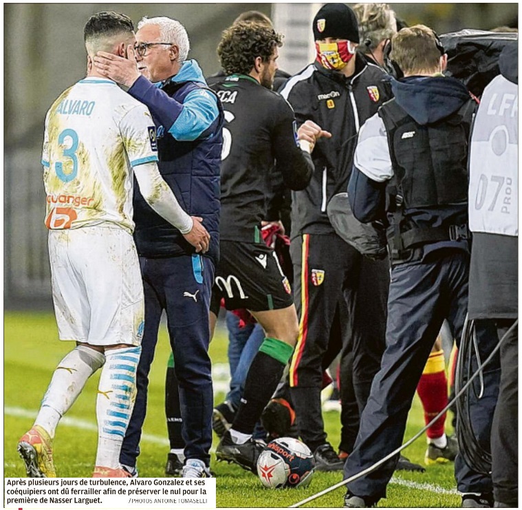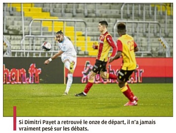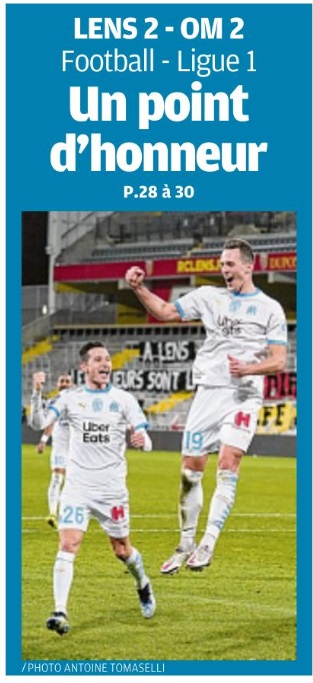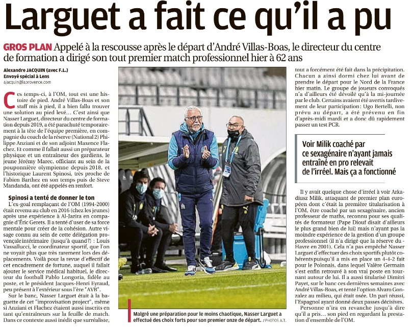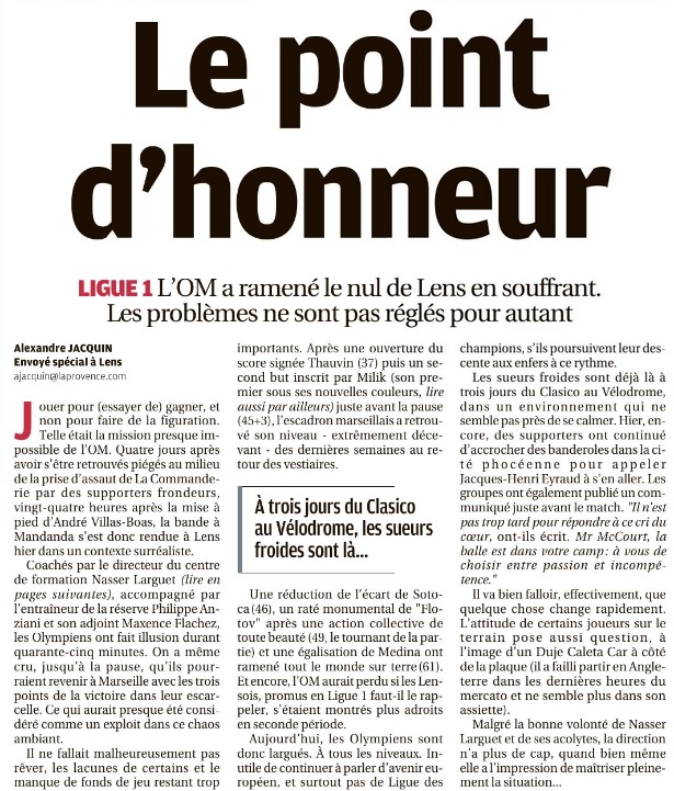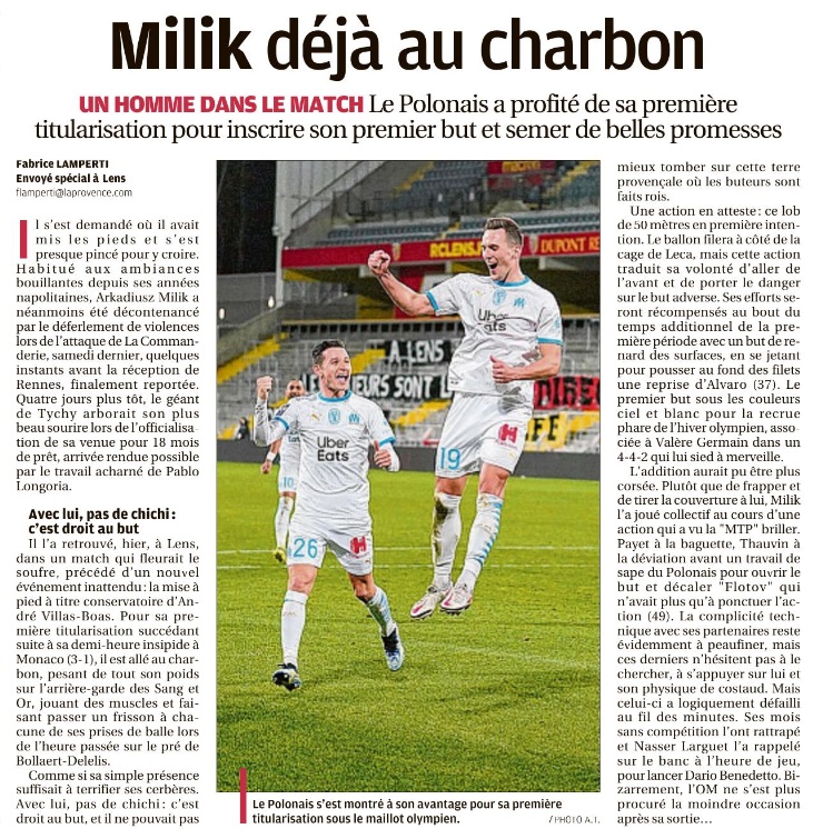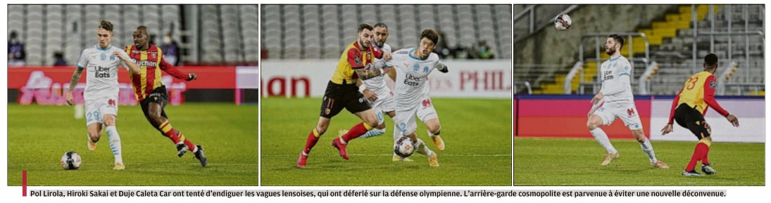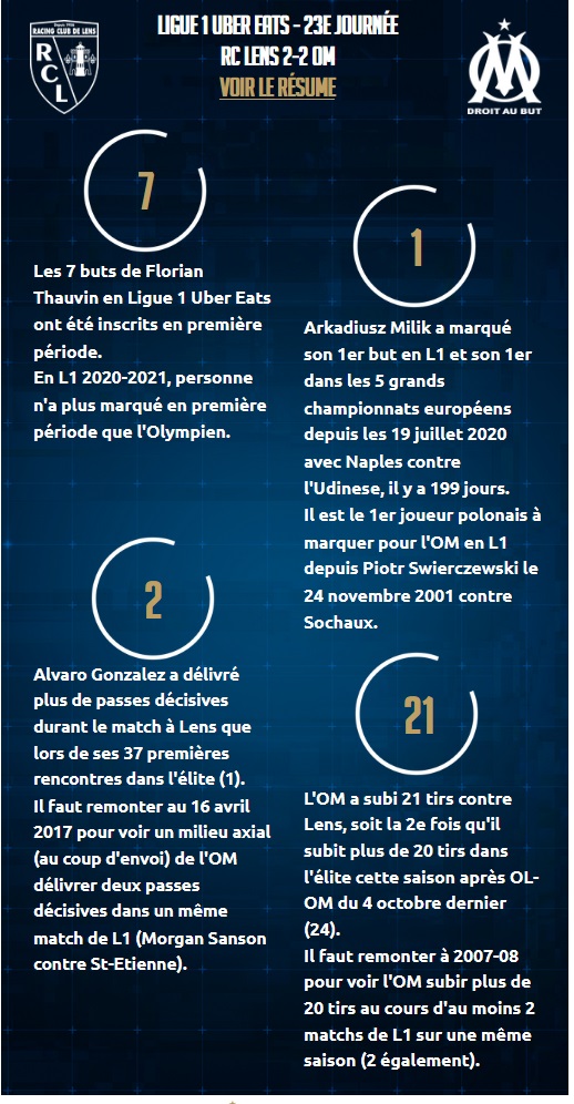 Lens - OM (2-2) : Dos à dos Alors qu'ils menaient 2 à 0 à la pause grâce à des réalisations de Thauvin et Milik, les Olympiens ont été rejoints au score en seconde période et concèdent finalement le match nul à Lens. La compo olympienne André Villas-Boas mis à pied la veille de la rencontre, la direction de l'équipe a été confiée à Nasser Larguet, directeur du centre de formation. Pour sa première composition, il avait de nombreux absents dans ses rangs, des suspendus, Gueye, Balerdi, Cuisance et Khaoui mais également des blessés, Amavi et Rongier. Sakai, Caleta-Car, Perrin et Lirola composaient la défense. Gonzalez et Kamara étaient positionnés devant la défense, Payet et Thauvin occupaient les ailes. Germain et Milik étaient aux avant-postes. Thauvin libère l'OM Les Marseillais ont allumé la première mèche de la partie avec Kamara qui cadrait la première frappe de la rencontre. Comme souvent, les Olympiens réalisaient une bonne entame. Pressing, circulation de la balle et combativité étaient au rendez-vous mais que ce soit Milik ou Perrin, l'OM ne trouvait pas la faille. Lens, dont un but de Sotoca était justement refusé pour un hors-jeu au départ de l'action à la 12e minute, prenait peu à peu le contrôle du match et mettait la pression sur les buts de Mandanda. Pourtant c'est dans ce moment fort des nordistes que les Olympiens ont ouvert la marque. Sur une ouverture d'Alvaro, Thauvin contrôlait du gauche avant de tenter une frappe croisée du droit hors de portée de Leca. La septième réalisation du meilleur buteur marseillais. Milik juste avant la pause On jouait le temps additionnel de la première période quand l'OM a obtenu un coup franc. Payet le tirait pour la tête de Germain qui trouvait en retrait Alvaro dont la reprise était déviée dans les buts de Leca par un opportuniste Milik. Le Polonais marquait, sur la pelouse lensoise, son premier but sous les couleurs marseillaises et permettait à l'OM de rentrer au vestiaire pour la pause avec un avantage de deux buts. Lens se relance Dès l'entame de la seconde période, Lens réduisait l'écart et se remettait sur de bons rails. À la suite d'un centre du nouvel entrant Kalimuendo, déviée par une talonnade de Banza, le buteur du match aller, Sotoca trompait Mandanda. Dans la foulée, l'OM avait une grosse opportunité de reprendre une avance de deux buts, mais Milik ne parvenait pas à frapper et préférait glisser la balle à Thauvin. Le natif d'Orléans ne trouvait pas le cadre. À l'heure de jeu, les Sang et Or revenaient à hauteur de l'OM grâce à un but de Medina qui plaçait une reprise décroisée sur un centre de Clauss. Le classement Les Marseillais restaient sur trois défaites d'affilée en Ligue 1 Uber Eats et quatre en comptant le Trophée des Champions. Avec le point du match nul pris sur la pelouse de Lens, les Olympiens stoppent la spirale des défaites. Avec toujours deux matchs en moins, ils occupent la neuvième place avec 33 unités à quatre longueurs de la cinquième place détenue par l'AS Monaco. |