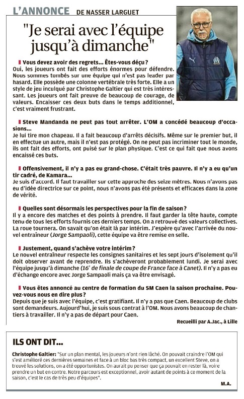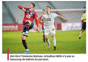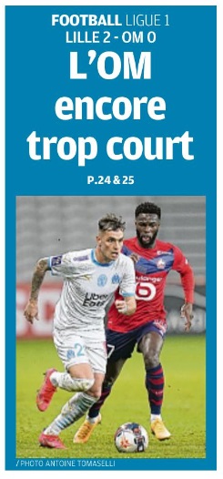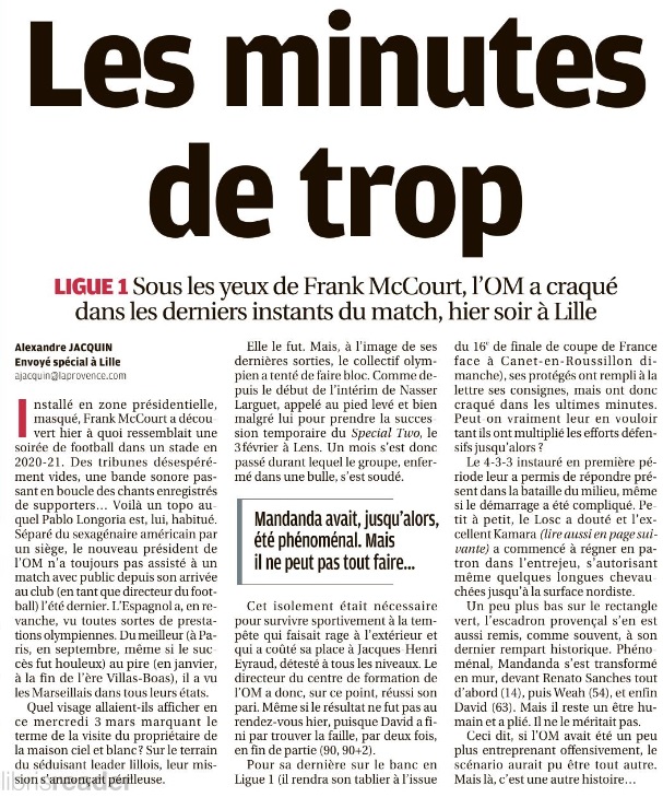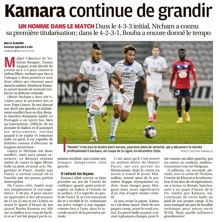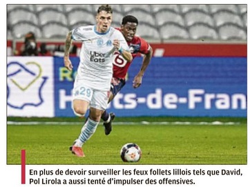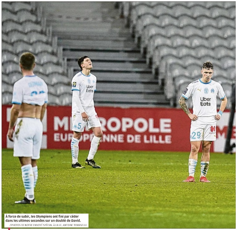 Après un match solide, les Olympiens ont encaissé deux buts de David dans les toutes dernières minutes de jeu. Première pour Ntcham Avec les suspensions de Sakai et Alvaro, c'est en défense que Nasser Larguet a fait des changements. Balerdi était associé à Caleta-Car dans la charnière. Lirola et Nagatomo occupaient les flancs. Au milieu, avec Kamara et Gueye, Ntcham honorait sa première titularisation en Ligue 1 Uber Eats. Devant, Payet et Thauvin entouraient Milik en pointe. Sous les yeux de Frank McCourt Après deux journées marathon à Marseille durant lesquelles il a successivement rencontré les dirigeants des groupes de supporters, des personnalités politiques telles que le Maire de Marseille Benoît Payan ou Martine Vassal, Présidente de la métropole Aix-Marseille-Provence, assisté à des réunions avec le nouveau Président de l'OM, Pablo Longoria, Frank McCourt qui s'est également adressé aux salariés du Club, était mercredi soit au stade Pierre-Mauroy pour suivre la prestation de sa formation. Une première période solide Lille a dominé la première période mais les opportunités des Dogues ont été peu nombreuses. Ils ont tiré 11 fois au but mais seulement 2 ont été cadrés... Et Mandanda a brillé avec de belles parades. Défensivement, l'OM a été solide et bien en place empêchant les hommes de Christophe Galtier de développer leurs assauts. L'OM a débuté en 4-3-3 mais rapidement Nasser Larguet a donné la consigne de passer en 4-2-3-1. Ainsi, le duo Kamara-Gueye est revenu devant la défense, Payet a retrouvé son poste de numéro 10 et Ntcham est passé sur le côté gauche. Le jeu olympien a semblé plus fluide en fin de période. Kamara a eu la plus belle opportunité avec une frappe lointaine à la suite d'une percée de Payet dans la défense lilloise mais Maignan s'est bien couché. L'OM perd sur le fil Pour la seconde période, Ntcham, repositionné sur la gauche en première mi-temps, a laissé sa place à Khaoui. À l'heure de jeu, Germain a remplacé Thauvin. Comme lors des 45 premières minutes, la possession de balle était lilloise mais face à une équipe marseillaise bien organisée et rigoureuse défensivement, les occasions nordistes étaient rares. Quand elles allaient au bout, Mandanda a de nouveau sorti des parades décisives devant Weah ou David. Benedetto est entré à la place de Payet pour les dernières minutes. Des ultimes instants tendus où l'OM s'est finalement incliné sur une frappe de Ikoné repoussée par Mandanda mais David a bien suivi. L'attaquant lillois signait un doublé après un nouveau ballon repoussé par le portier olympien. Le classement Avec cette défaite, l'OM glisse d'une place au championnat. Les Olympiens sont huitièmes avec 39 unités à 2 points de Metz (6e) et 5 de Lens (5e). Dimanche à 21 heures, les Marseillais disputeront le 16e de finale de Coupe de France à Perpignan contre Le Canet. Mercredi prochain, il sera temps de jouer le match en retard face à Rennes. . |