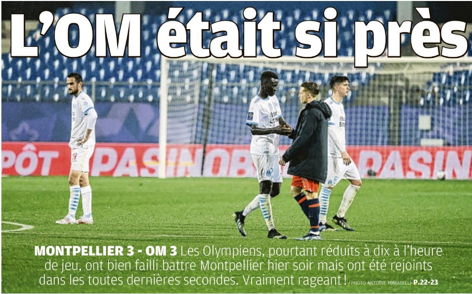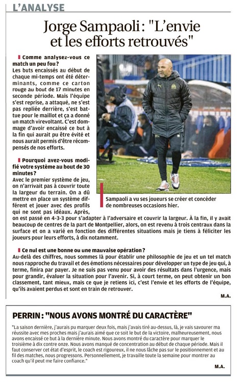 Montpellier - OM (3-3) : un nul et du courage Les Olympiens menaient 3-2 mais ont subi l'égalisation de Montpellier dans les tous derniers instants de la rencontre. Un retour en défense Pour affronter Montpellier, Jorge Sampaoli pouvait compter sur sa charnière centrale habituelle. Absent face à Dijon, Duje Caleta-Car effectuait son retour au coeur de la défense aux côtés des deux derniers buteurs olympiens : Balerdi et Alvaro. Dans le couloir gauche, Luis Henrique gagnait une nouvelle fois la confiance de son coach, tout comme Pol Lirola, à droite. Boubacar Kamara, Pape Gueye, et Florian Thauvin composaient le milieu de terrain. Milik et Payet occupaient l'attaque. En revanche, le technicien argentin comptait encore plusieurs blessés : Valentin Rongier, Jordan Amavi, Yuto Nagatomo, Yohann Pelé, et Hiroki Sakai, qui s'est ajouté à la liste cette semaine. Le onze de départ : Mandanda (cap) - Lirola, Balerdi, Alvaro, Caleta-Car, Henrique - Thauvin, Kamara, Gueye - Payet, Milik. Le début de rencontre Il ne fallait pas être en retard pour assister à la rencontre entre Montpellier et l'OM. Après seulement une vingtaine de secondes de jeu, les Héraultais ouvraient le score par l'intermédiaire de Delort. Sous une pluie battante et face au bloc montpelliérain, il était compliqué de construire des actions. Malgré une large possession du ballon, les Olympiens faisaient face à un bloc montpelliérain bien en place et difficile à contourner. L'OM renverse la vapeur En trois minutes, l'OM a su réagir et a complètement changé la donne dans la rencontre. Une ouverture de Kamara pour Milik a permis à l'OM d'égaliser. L'enchaînement du Polonais était parfait : il s'emmenait le ballon, se défaisait du défenseur avec un petit pont, et concluait du gauche. Galvanisés par ce but, les Olympiens réalisaient le coup parfait en prenant l'avantage au tableau d'affichage. Sur un centre de Lirola, Payet décalait pour Thauvin. Son tir, repoussé par la défense montpelliéraine revenait dans les pieds de Gueye, qui ajustait parfaitement et trompait Omlin. À la pause, l'OM menait 2-1. Perrin entre et marque La deuxième mi-temps ne pouvait pas plus mal commencer pour l'OM qui, comme en première période, encaissait un but d'entrée de jeu sur une frappe de Laborde. Mais dans une rencontre très animée, il était certain qu'il y aurait encore des faits de jeu. Le premier n'était pas à l'avantage des Olympiens : Caleta-Car était exclu après une faute sur Sambia. L'arbitre n'hésitait pas et sortait le rouge. Cette expulsion poussait Jorge Sampaoli à effectuer un changement tactique et Lucas Perrin entrait en jeu. L'histoire ne pouvait pas être plus belle pour le pur marseillais qui d'un coup de crâne imparable redonnait l'avantage à son équipe. Alors que l'OM pensait tenir sa victoire, Montpellier égalisait dans les tous derniers instants de la rencontre malgré de nombreux arrêts de Mandanda. Terrible pour nos Olympiens qui avaient tout donné pour ramener la victoire en infériorité numérique. |