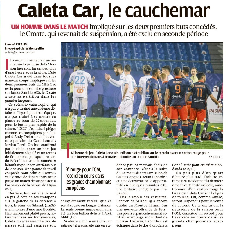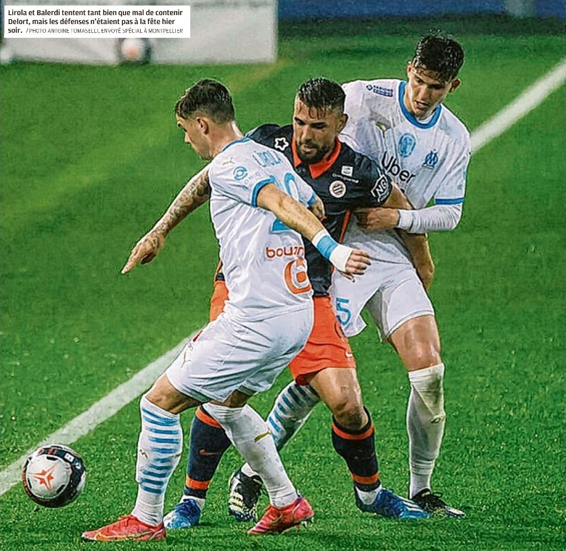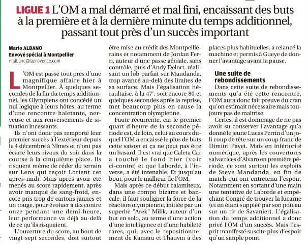 L'OM flirte avec l'exploit à Montpellier Au terme d'un match à rebondissements, Héraultais et Phocéens se séparent sur un score de parité (3 - 3). Dans ce derby capital sur fond de course à l'Europe, l'OM a passé sa soirée en mode Docteur Jeckyll et Mister Hyde. Arek Milik qui passe en revue la défense montpelliéraine et ajuste Jonas Omlin. Puis Pape Gueye, dans le temps additionnel, à la conclusion d'une belle action collective initiée par Pol Lirola, c'est le beau visage d'un collectif phocéen profitant de l'appatie héraultaise. Malheureusement, cette belle séquence de cinq minutes juste avant la pause sera tempérée par de grosses erreurs de placement défensif. Ce côté sombre de l'OM qui a failli plomber la soirée des Phocéens. Avec deux buts concédés à chaque entame de période. Dès la 27ème seconde lors de l'ouverture du score par Andy Delort. A la 68ème seconde de la deuxième, lorsque Gaëtan Laborde se permet un petit pont face à Steve Mandanda. Avec, dans les deux cas, Jordan Ferri à la baguette de chef d'orchestre. C'est finalement l'OM en mode Mister Hyde qui semble alors prendre le dessus. Avec la carton rouge, le neuvième réçu par un Olympien cette saison, brandi sous le nez de Duje Caleta-Car par Jérôme Brisard, après son agression sur Salomon Sambia. Le côté obscur des Phocéens a bien failli coûter cher. Mais le bon Docteur Jeckyll retrouvera la lumière, sous les traits de Lucas Perrin. Tout juste entré en jeu, le Minot claque une tête victorieuse sur un coup franc de Dimitri Payet. L'OM reprend alors la main. Restait cette fois à tenir. Montrer que la leçon est cette fois bien retenue et conserver, ce nouvel avantage. Alors que Montpellier se rue à l'abordage du but de Steve Mandanda, sauvé par son montant (81) et auteur de plusieurs interventions décisives, Florian Thauvin aura la balle du 4 - 2 (87). Mais le mot de la fin revient à Gaëtan Laborde, qui arrache l'égalisation au bout du temps additionnel. |
