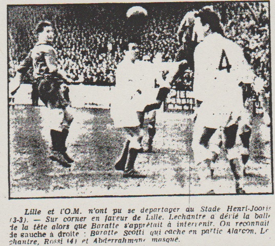 Jusqu'à la mi-temps l'O.M. se contenta d'une bonne tentative d'Alarcon sur un mauvais renvoi de Foix et une échappée dangereuse de Caussemille. Lille au contraire, accentua sa pression, Van Cappelen lui-même monta à l'attaque. Ibrir dut plonger à la 21me minute dans les pieds de Vincent. Et à la 32me minute, Lechantre, rabattant de la tête une balle centrée de la droite par Janssen inscrivait un second but. À deux reprises (33me et 34me) Strappe shootait de peu à côté. Ibrir devait sortir au devant de Baratte (39me). Lille obtient deux corners. Sur l'un d'eux Janssen devant les buts, souleva sa balle (40me). Van Cappelen (pour la seconde fois) et Sommerlynck effectuèrent des montées offensives. Abder ailier gauche Caussemille arrière-droit Lorsqu'on vit au début de la seconde mi-temps, Abder (victime d'une élongation musculaire) s'exila à l'aile gauche, tandis que Caussemille devenait arrière droit on ne donna pas cher des chances marseillaises... Lille eut-il le tort de pécher précisément par excès de confiance ? Quoiqu'il en fut, après qu'Ibrir eut, de nouveau, réussi une intervention difficile sur le très beau tir de Baratte (50me), on vit Scotti passer résolument à l'attaque. Aznar se tenant prudemment derrière lui. A la 60me minute, sur un coup franc sifflé contre Foix, Scotti chercha la tête d'Alarcon. Celui-ci glissa à Andersson dont le tir soudain pénétra dans les buts lillois pour en ressortir, après avoir heurté l'armature métallique des filets. Durant une période où on regretta que l'O.M. ne sollicitât pas plus souvent ses ailiers, Lille réagit. Mais les Olympiens sans céder au découragement, firent front et, à la 76me minute, Abderrahmane servi par Aznar, donna à Andersson en position d'inter gauche qui battit Val pour la seconde fois. Une fin de match mouvementée Lille, piqué au vif, repartit de plus belle à l'attaque et obtint trois corners en quatre minutes. Ibrir eut notamment un grand mérite (70me) à retourner un shoot à bout portant de Strappe. Hélas ! sur ce corner, le même Strappe battit de la tête, Ibrir masqué. Lille reprenait l'avantage par 3 à 2. Strappe se révélait le grand homme, avec Andersson, Salem et Scotti, de cette fin de match. Mais à cinq minutes de la fin, on n'avait pas la certitude que la victoire lilloise fut acquise. De fait, à la 89me minute, Scotti décrochait un tir qui eut battu Val si Baratte ne l'avait arrêté avec la main. Penalty indiscutable que Scotti transforma après avoir méticuleusement essuyé le ballon. Sur une contre-attaque de Van Der Hart et Lechantre, Scotti à terre, dans la surface de réparation, retint le ballon entre ses jambes. Le publique réclame un penalty alors que cette faute eut pu être sanctionnée tout au plus d'un coup franc indirect. L'arbitre siffla la fin au milieu des huées. Un spectateur vint même frapper l'arbitre de touche. Ce match acharné se termina dans la confusion. |