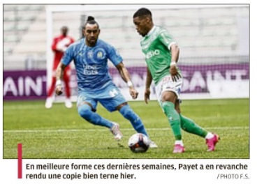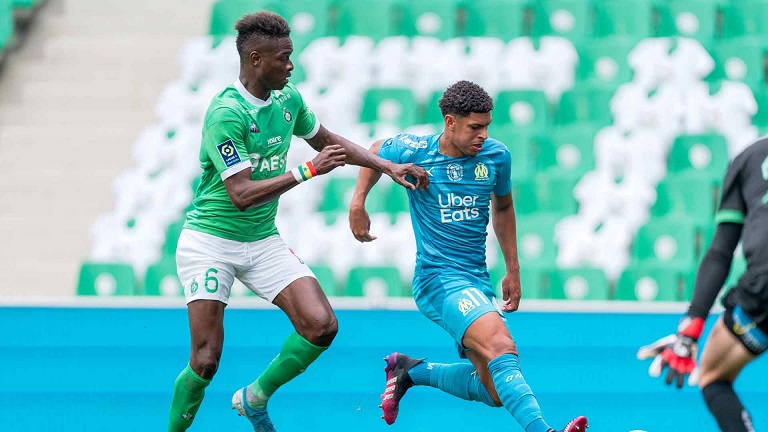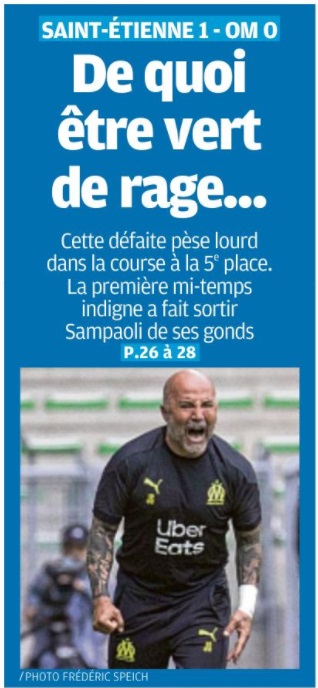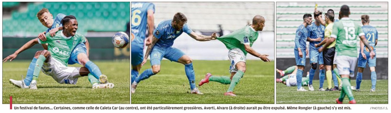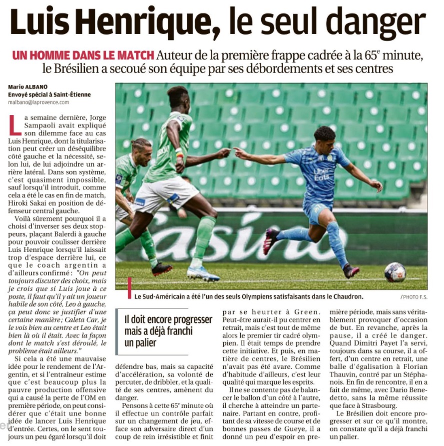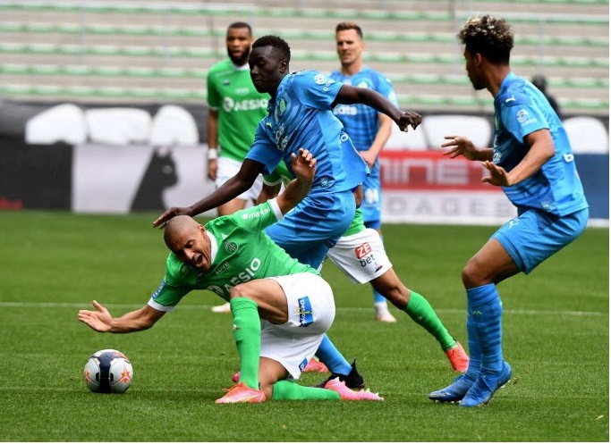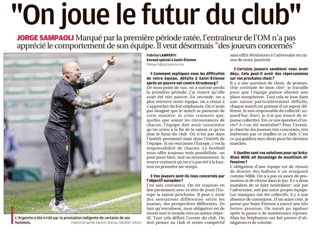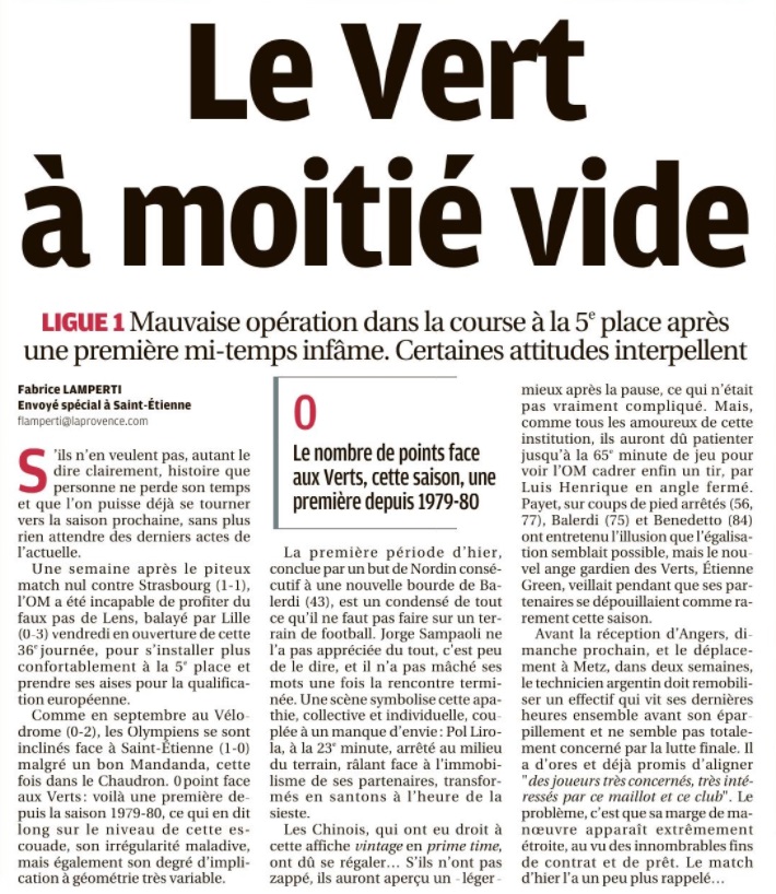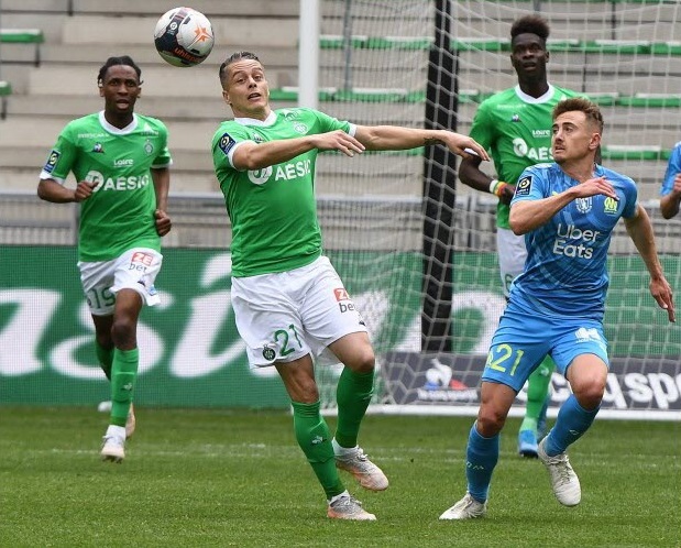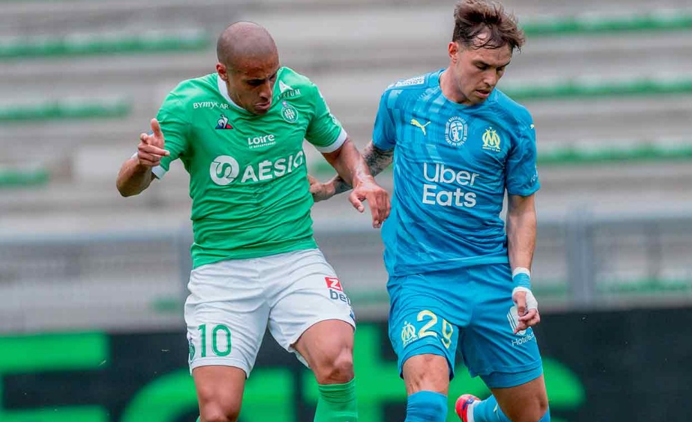 L'OM n'a pas pu profiter du faux-pas de Lens et s'est incliné face à Saint-Étienne 1-0. Le onze de départ Pour affronter Saint-Étienne, Jorge Sampaoli reconduisait son système de jeu en 3-5-2 avec deux changements dans le onze de départ par rapport au match face à Strasbourg. Henrique, décisif lors de ses dernières entrées, remplaçait Nagatomo dans le couloir gauche. Au milieu de terrain, Pape Gueye, aligné aux côtés de Boubacar Kamara et de Florian Thauvin, suppléait Valentin Rongier. Le reste du onze de départ était classique avec une charnière centrale à trois défenseurs (Balerdi, Alvaro, Caleta-Car). Arek Milik et Dimitri Payet occupaient l'attaque. Le onze de départ : Mandanda (cap) - Lirola, Balerdi, Alvaro, Caleta-Car, Henrique - Thauvin, Kamara, Gueye - Payet, Milik. La première mi-temps En jouant contre Saint-Étienne, déjà maintenu, forcément, le match allait être ouvert. Et si Milik était le premier à décocher une frappe lointaine dès la deuxième minute, les Stéphanois ont ensuite effectué un gros pressing dont les Olympiens avaient du mal à se sortir. Très offensifs, les Verts sont tombés sur un grand Steve Mandanda, qui a longtemps repoussé l'échéance en réalisant trois grosses parades, dont deux devant Khazri. Malheureusement, les Olympiens encaissaient un but en fin de période par l'intermédiaire de Nordin qui reprenait un centre de Khazri. À la pause, l'OM était mené 1-0. La deuxième mi-temps Les Olympiens revenaient sur le terrain avec de bonnes intentions. Très actif sur son côté gauche, Henrique délivrait un centre pour Thauvin mais sa frappe du gauche était repoussée par Trauco. Poussés à la faute, les Stéphanois provoquaient deux excellents coup-francs pour Payet. Déterminé, le Réunionnais voyait sa première frappe repoussée par le poteau. Sur le deuxième coup de pied arrêté, Green s'interposait. Le jeune portier stéphanois, en grande forme, donnait du fil à retordre aux Olympiens et à Benedetto, entré en jeu quelques minutes auparavant, qui voyait sa reprise repoussée du bout des doigts par le gardien stéphanois. Les Olympiens s'inclinent sur la pelouse de Geoffroy-Guichard. Les joueurs de Jorge Sampaoli restent cinquièmes (avec une différence de but meilleure que Lens) en attendant le résultat de Rennes contre le PSG ce dimanche soir.