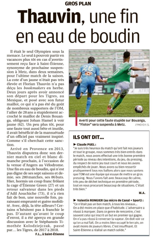 Une victoire de haut vol face à l'OM et le maintien pour l'ASSE Grâce à un succès probant sur Marseille dimanche, au prix d'une belle prestation collective, l'ASSE est officiellement maintenue en Ligue 1 et peut même viser le top 10. L'ASSE a validé son maintien dimanche après-midi et l'a fait avec la manière. Les Verts s'offrent, comme à l'aller, le scalp d'un rival historique, l'Olympique de Marseille, battu pour la deuxième fois dans la même saison. Ce qui n'était plus arrivé depuis la saison 1979-1980, autant dire une éternité. Khazri encore décisif C'est grâce à une première période de haut vol , durant laquelle ils mettent des Marseillais amorphes sous l'entonnoir, que les Stéphanois s'imposent et reviennent à un petit point de la dixième place. " On a fait une super première mi-temps. On les a empêchés de jouer ", confirme Claude Puel, qui peut être fier de sa formation. Après avoir buté sur Mandanda (18e, 19e), le n 10 permet à Nordin de donner l'avantage aux Verts en profitant du raté de Balerdi (1-0, 43e). Aussi dangereux grâce à Kolodziejczak (28e) ou Bouanga (11e, 38e), Saint-Étienne parvient encore à concrétiser sa domination, ce qu'elle n'a pas assez réussi cette saison. " On le fait beaucoup plus en cette fin de saison. Il y a beaucoup plus de maturité de la part de l'équipe, dans la gestion, dans le contenu, dans le métier, félicite Claude Puel. C'est vraiment intéressant. En plus, on le matérialise dans une situation qui n'est jamais évidente en fin de saison : prendre des points pour se maintenir. " Face à un candidat à l'Europe qui n'en a longtemps eu que le sobriquet dans ce match, les coéquipiers de Mathieu Debuchy livrent une prestation d'excellente facture dans le style de celle jouée à Paris ou à Montpellier. Une victoire collective Jusqu'à la fin, les Stéphanois se montrent solides et solidaires sur toutes les lignes et pas avares d'efforts précieux. Ça n'empêche pas l'OM, largement dominateur en seconde période, d'inquiéter un Etienne Green qui sort encore le grand jeu sur sa ligne (64e, 77e) ou dans les pieds de Milik (66e). Et que de dire de ce réflexe sur une reprise de Benedetto (84e) ? Le gardien de 20 ans a même encore la baraka du bizut. Il est sauvé pour la sixième fois en autant de matchs en professionnel par ses montants. Il est battu sur un coup franc de Payet mais le ballon s'écrase sur son poteau droit (55e). La douzième victoire de la saison, vrai succès collectif, est la première de prestige des cinq à domicile. Il ne manquait que les supporters dans un Chaudron terriblement vide, que même le vent strident a eu droit d'occuper ce dimanche. Par Damien NORE |