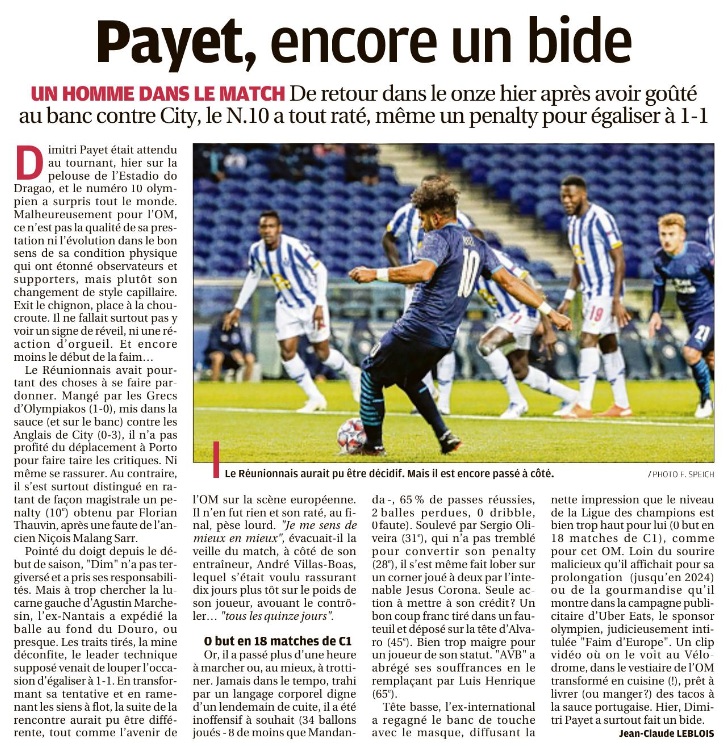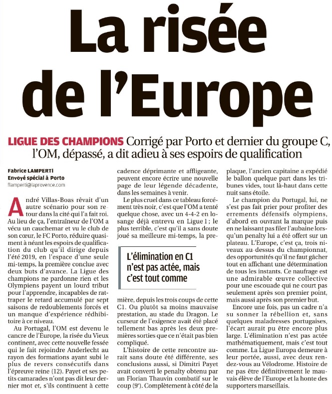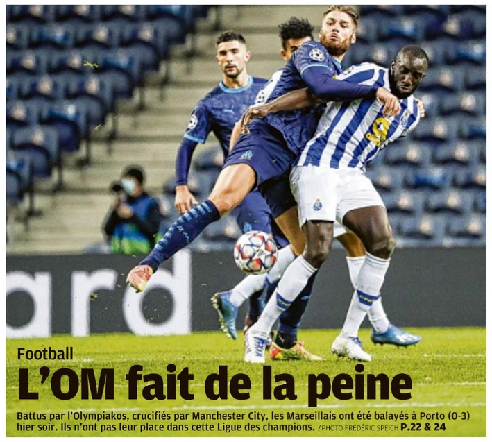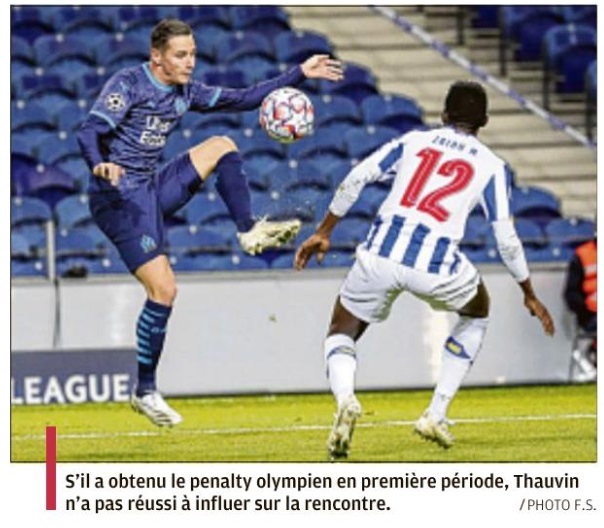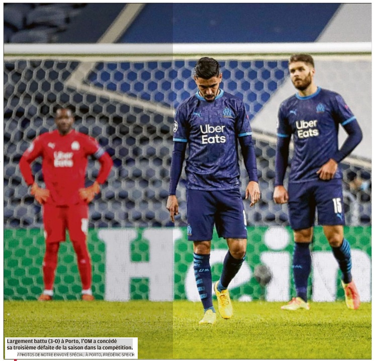 Les Olympiens ont été battus, 3 à 0, par le FC Porto au stade du Dragon. Après trois matchs L'OM compte 0 point dans son groupe de Champions League. En 4-4-2 face à Porto Après un 5-3-2 face à Manchester City il y a une semaine à l'Orange Vélodrome, André Villas-Boas est revenu au classique 4-4-2 en losange pour affronter le FC Porto à l'estadio do Dragao. Payet a retrouvé sa place, il a évolué dans l'axe derrière les deux attaquants, Thauvin et Benedetto, également de retour. Sanson et Rongier étaient au milieu avec Kamara en sentinelle. La défense était classique pour une arrière-garde à quatre éléments avec Sakai, Alvaro, Caleta-Car et Amavi. L'OM cueilli à froid Sur sa première occasion, le FC Porto a ouvert le score alors que les toutes premières minutes semblaient équilibrées. Corona bénéficiait de deux contres favorables avant de s'enfoncer dans la surface et centrer pour Marenga qui marquait de près du plat du pied. Première opportunité et premier but dès l'entame pour les hommes Sergio Conceiçao. Penalty manqué pour l'OM, pas pour Porto Quelques minutes après l'ouverture du score, Thauvin obtenait un penalty à la suite d'une faute de Sarr dans la surface. Le moment était idéal pour revenir dans la partie et égaliser. Payet s'élançait pour tirer, ouvrait son pied mais ratait le cadre… Juste avant la demi-heure de jeu, l'arbitre de la rencontre sifflait à nouveau un penalty, pour Porto cette fois-ci, après une faute d'Amavi sur Corona. Oliveira tirait fort au sol au ras du poteau. Imparable pour Mandanda. Les Portugais doublaient la mise. Un troisième penalty a failli être sifflé, cela aurait été le second pour l'OM, mais après consultation de la VAR, Antonio Mateu Lahoz revenait sur sa décision et le score en restait à 2-0. Timide réaction en seconde période Menés 2-0, les Olympiens sont revenus pour la seconde période mais ils ont eu du mal à avoir la mainmise sur le jeu. André Villas-Boas a tenté de dynamiser son équipe avec les entrées en jeu de Luis Henrique et Cuisance. Mais sur un contre, Corona, encore lui, a perforé la défense marseillaise avant de décaler, d'une astucieuse talonnade, Luis Diaz qui ajustait Mandanda. Germain, Strootman et Aké ont fait leur entrée en jeu. Sans que cela ne change le cours du jeu. L'OM dernier du groupe Après trois matchs de Champions League, l'OM n'a pas marqué de points et n'a pas marqué de but. Au classement, les Marseillais sont derniers du groupe avec zéro point. C'est désormais face à l'Olympiakos que l'OM se bat dans la poule C. Pour espérer accrocher la troisième place et accrocher un ticket pour l'Europa League, il faudra faire la différence à domicile où les hommes d'André Villas-Boas joueront leurs deux prochains matchs de la compétition.