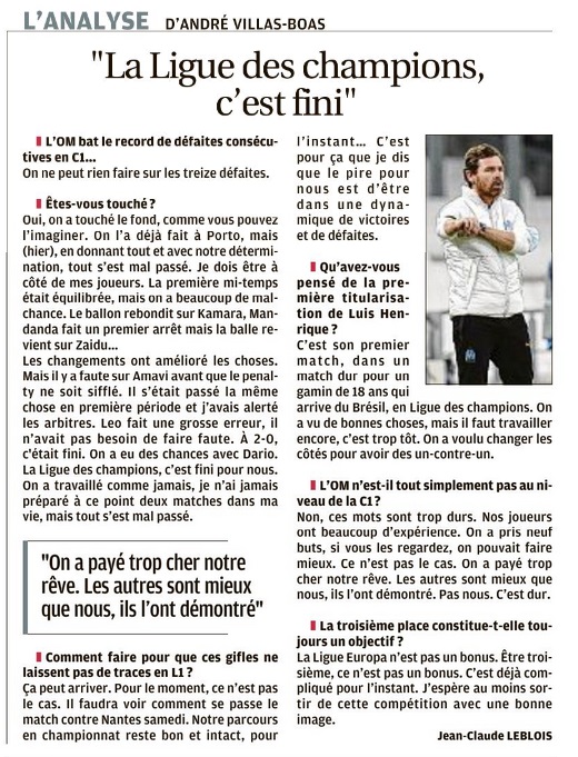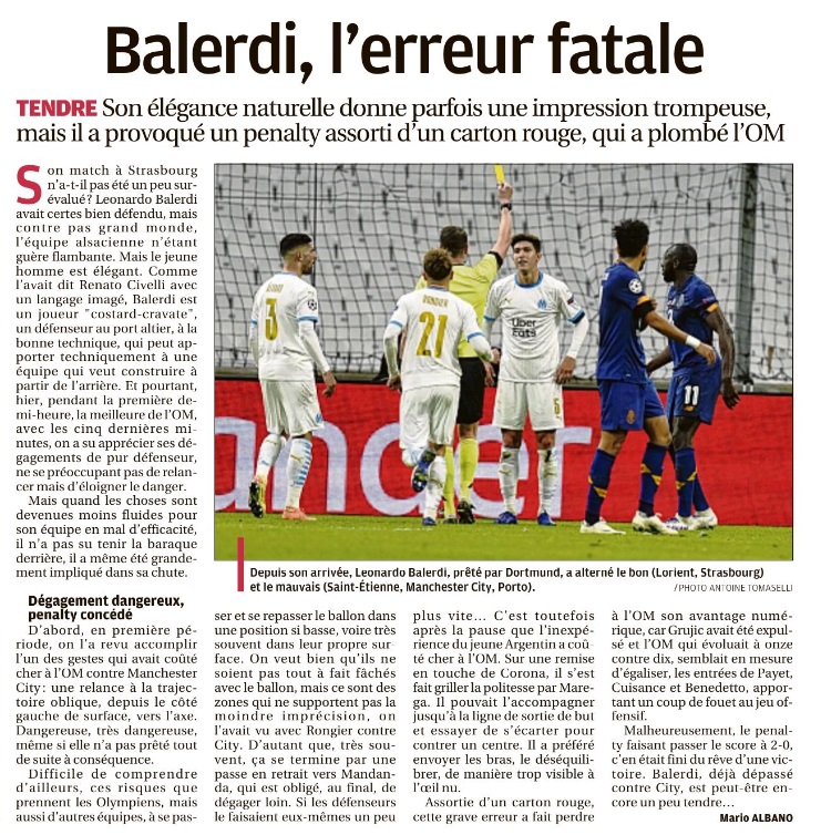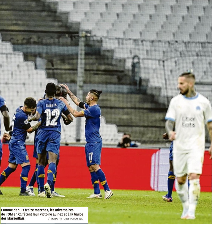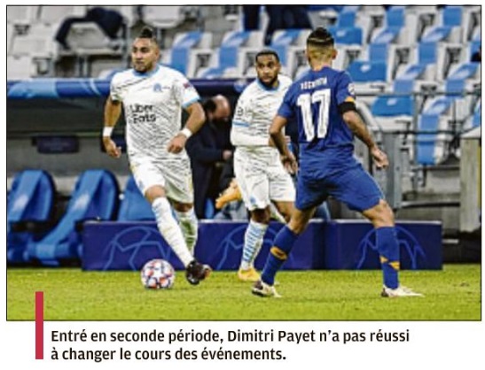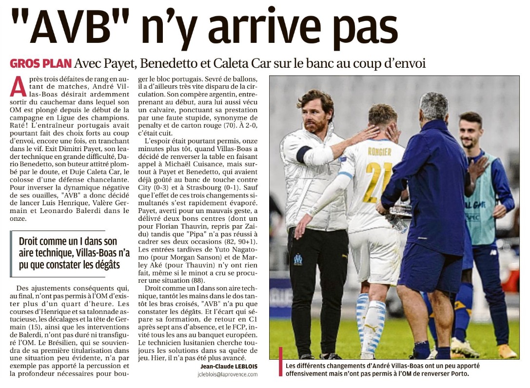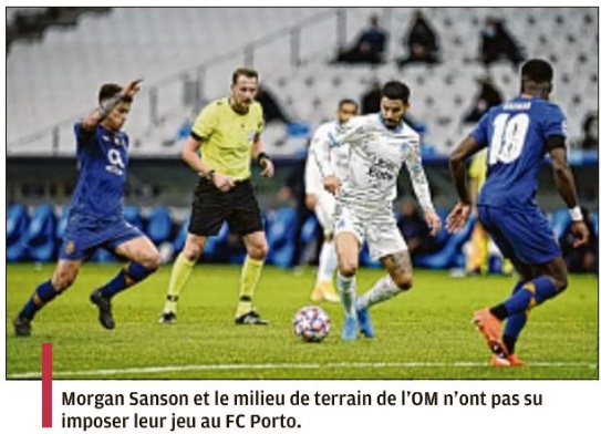 Les Marseillais se sont inclinés à domicile face au FC Porto. Sanusi et Oliveira ont marqué les deux buts portugais. Hommage à Diego Maradona La nouvelle est tombée quelques heures avant le coup d'envoi de la rencontre entre l'OM et le FC Porto. Diego Armando Maradona s'est éteint à l'âge de 60 ans. Les hommages se sont succédé pour honorer la mémoire d'une légende du football, une icône. De l'Argentine à Naples en passant par Barcelone, Maradona est un joueur qui a marqué plusieurs générations de son empreinte. Une minute de silence a été respectée avant le coup d'envoi du match sur la pelouse de l'Orange Vélodrome. EN 4-2-3-1 et première pour Henrique 19 jours. C'est le temps passé par l'OM sans jouer depuis sa dernière sortie, à Strasbourg le 6 novembre dernier, où les Olympiens s'étaient imposés 1 à 0. L'OM aurait dû jouer samedi dernier à domicile face à Nice mais le match a été reporté en raison des cas trop nombreux de joueurs atteints du Covid-19. 19 jours après donc, André Villas-Boas a choisi un 4-2-3-1 alors que l'équipe marseillaise avait débuté en 4-4-2 en Alsace. Très bon à la Meinau, Balerdi a été reconduit mais à côté d'Alvaro, suspendu contre le RCSA, et non Caleta-Car. En attaque également, des changements ont été faits : Germain occupait la pointe et Luis Henrique était titularisé pour la première fois. Du rythme et de l'envie C'est ce qui était reproché aux Olympiens lors de leurs précédentes sorties même lorsqu'ils s'imposaient, comme à Strasbourg par exemple avec un seul tir pendant la partie. Mercredi soir, dès l'entame, les joueurs d'André Villas-Boas ont montré envie et détermination. Ce sont d'ailleurs les Marseillais qui dominent les débats en début de partie. Ils se procurent les premières occasions avec Sanson (4e), Kamara (11e) ou une tête de Germain qui contraint Marchesin à une belle horizontale (15e). Cependant au fil de la première période, Porto a lentement pris le dessus. Après la demi-heure de jeu, les Portugais se montrent plus pressants. Sanusi s'essaie une première mais Mandanda veille. A la 39e minute, un corner va être fatal à l'OM. Une première tête de Corona rebondit sur le dos de Kamara, la balle revient sur Sanusi, son tir est repoussé par la cuisse du portier marseillais mais la balle revient à nouveau sur le Nigérian et sa seconde tentative fait mouche. Des changements pour apporter un plus La seconde période a débuté sur un rythme mois élevé qu'en première mi-temps et Porto avait la mainmise sur la partie. André Villas-Boas a décidé de provoquer un électrochoc dans son équipe avec un triple changement. Payet, Benedetto et Cuisance entraient en jeu à la place de Luis Henrique, Germain et Kamara. Dès le premier ballon, Thauvin n'était pas loin de marquer à la suite d'un centre de Payet, mais Mbemba lui subtilisait la balle du bout du pied. A la 67e minute, Grujic commettait une énorme faute sur Benedetto. Déjà averti en première période, il quittait ses partenaires et l'OM se retrouvait donc en supériorité numérique. Mais deux minutes plus tard, Balerdi commettait une faute dans la surface. Porto obtenait un penalty, que transformait Sergio Oliveira et l'Argentin de l'OM était exclu après un second carton jaune. Nagatomo et Aké sont également entrés en jeu mais c'est bien Benedetto qui a eu trois occasions de marquer, dont la dernière a trouvé le poteau de Marchesin dans le temps additionnel. Objectif Europa League Avec cette quatrième défaite en quatre journées de Champions League, l'OM est donc dernier du groupe C avec 0 point. Le seul objectif, désormais, est la troisième place, occupée par l'Olympiakos battu par Manchester City un peu plus tôt dans la soirée. Les Grecs comptant trois points, il faudra donc s'imposer la semaine prochaine à domicile face au club de Mathieu Valbuena pour espérer accrocher un ticket pour l'Europa League. |