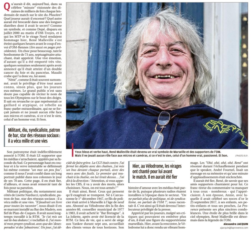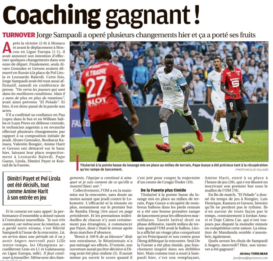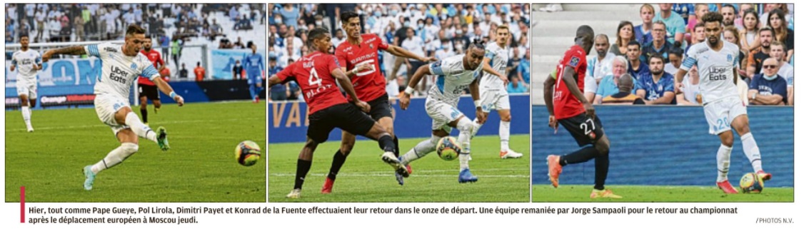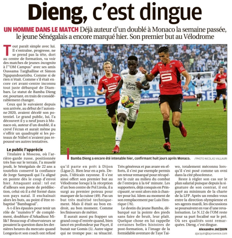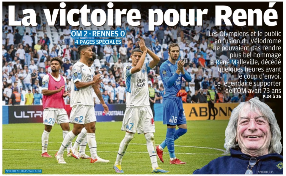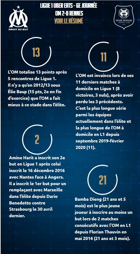 OM - Rennes (2-0) : L'OM enchaîne Dans un match entraînant et rythmé, les Olympiens ont battu Rennes 2 à 0 grâce à des réalisations de Dieng et Harit. L'OM signe un troisième succès de rang en L1. Une pensée pour René René Malleville était plus qu'un supporter. Né le 1er décembre 1947 à Carcassonne, il tombe amoureux de l'Olympique de Marseille dans son enfance, lorsque sa famille pose ses valises à Marseille alors qu'il n'a que 10 ans. Tour à tour chauffeur de bus, militant syndicaliste, patron de bar et chroniqueur, ses billets d'humeur étaient suivis toutes les semaines par des dizaines de milliers de personnes. Il s'est éteint ce 19 septembre, un jour de match, comme Depé. Avant la rencontre l'ensemble de l'Orange Vélodrome lui a rendu hommage. En soutien du personnel soignant La 6e journée de Ligue 1 Uber Eats était dédiée au personnel soignant, en première ligne depuis le début de la pandémie. L'Olympique de Marseille, via OM Fondation, a mis en place de nombreuses actions pour venir en soutien du personnel soignant : don pour la création de Phoceo le fonds de dotation de l'AP-HM, les messages à l'Orange Vélodrome durant le confinement, la bâche "À notre tour d'être supporter", la remise de maillots au personnel soignant des hôpitaux de Marseille... De plus, 500 euros par but marqué lors de la journée de L1 seront versés à la Fédération Hospitalière de France pour améliorer le quotidien des soignants. Plus généralement depuis plus d'un an et demi, les clubs de Ligue 1 Uber Eats et Ligue 2 BKT se sont largement mobilisés et ont fait preuve de solidarité, multipliant les initiatives de manière innovante et répondant de manière concrète aux besoins du terrain. Au total, près 5 millions d'euros ont été collectés sur les saisons 2019-20 et 2020-21, auxquels viennent s'ajouter de multiples dons non valorisés. La rotation continue Engagé dans un marathon de matchs jusqu'à la prochaine trêve internationale en octobre (encore 4 matchs jusqu'au 3 octobre), Jorge Sampaoli a apporté des changements dans son onze de départ par rapport à la rencontre jouée à Moscou jeudi dernier. Ainsi, Alvaro, Gerson, Rongier, Kamara et Harit ont été remplacés par Balerdi, Gueye, Lirola, de la Fuente et Payet. Dieng débloque la situation Après une première période dominée par les Olympiens mais parvenir à trouver la faille, malgré une transversale de Guendouzi, le public de l'Orange Vélodrome attendait la seconde période avec impatience. Les premières secondes de celle-ci semblaient à l'avantage des Bretons. Pourtant, sur un centre de Lirola parfaitement enroulé, Dieng coupait la trajectoire du ballon et le propulsait sous la barre. Un doublé à Monaco, un but contre Rennes, l'attaquant sénégalais de 21 ans est actuellement l'un des hommes en forme du secteur offensif marseillais. Harit met l'OM à l'abri Contre le Lokomotiv Moscou, l'OM avait ouvert le score mais n'avait pas su concrétiser ses opportunités avant de se faire rejoindre à la dernière minute. Contre Rennes, les Marseillais ont marqué les premiers et ils ont réussi à prendre le large pour éviter un éventuel retour des hommes de Bruno Genesio. Entré en juste avant l'heure de jeu, Harit a réalisé un petit festival pour percer à lui tout seul la défense rennaise avant de frapper entre les jambes de Gomis qui ne pouvait que freiner la trajectoire du ballon.