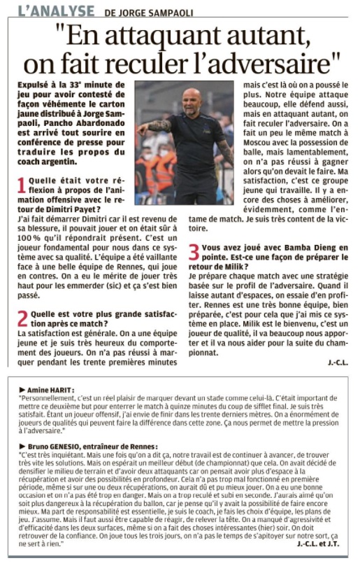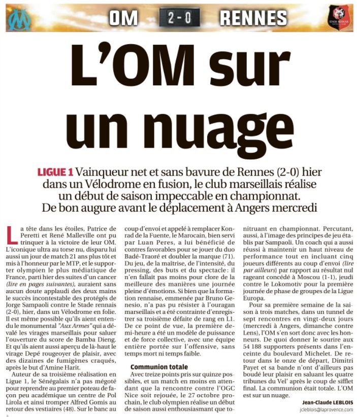 L'OM brise le granit Bamba Dieng et Amine Harit ont encore une fois fait parler la poudre. À Monaco, le premier s'était offert un doublé et le second avait éclaboussé la soirée par son explosivité et ses passes lumineuses. Contre Rennes, le Sénégalais y est encore allé de son but, ouvrant une brèche dans la digue rennaise. Avant que le second n'assoit définitivement la victoire olympienne. " Mon équipe a été vaillante. Et même si nous avions dû marquer plus tôt, ma satisfaction est générale. " Jorge Sampaoli savoure cette nouvelle victoire, la deuxième consécutive sans que son équipe ne concède de but en championnat. Au-delà d'un succès, ce qu'il retient avant tout, " c'est que même avec les rotations, nous avons conservé notre niveau ". Niko Kovac, l'entraîneur monégasque avait reconnu que l'OM qu'il avait rencontré " est injouable. " Bruno Genesio, son homologue breton, lâche : " Je pensais que nous aurions des espaces, mais nous reculons et subissons. Nous avons manqué d'agressivité et d'ambition. " Il avait pourtant densifié son milieu, dans l'espoir de bloquer les vagues marseillaises. Un schéma qui n'a fait que retarder l'échéance. Comme c'est le cas depuis le coup d'envoi de la saison, les Phocéens ont eu la maîtrise technique. Ils ont su aussi faire preuve de patience, après un départ sur les chapeaux de roue durant lequel ils ne sont pas parvenus à trouver la faille. Ce n'est qu'après le repos que Rennes a craqué. " C'était un peu le même match qu'à Moscou " reconnaît Jorge Sampaoli. Sauf que là, ses hommes ont marqué dans le jeu. Et ont su empêcher tout sursaut rennais jusqu'au bout. Avec en plus un second but qui a scellé le sort du match à vingt minutes du coup de sifflet final. " Mon but est important, car il enterre le match ". Amine Harit savoure son bonheur d'avoir fait chavirer le Vélodrome. Tout au long de l'après-midi, l'OM est allé chercher systématiquement les ballons dans le camp adverse, a mis en place un pressing qui a fissuré le bloc rennais. Une démonstration de force dans la continuité de celle faite à Monaco et qui permet d'envisager sereinement le déplacement à Angers, mercredi. Avec en prime un fauteuil de dauphin qui sied plutôt bien aux Olympiens Michel Garoscio |