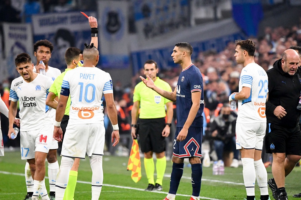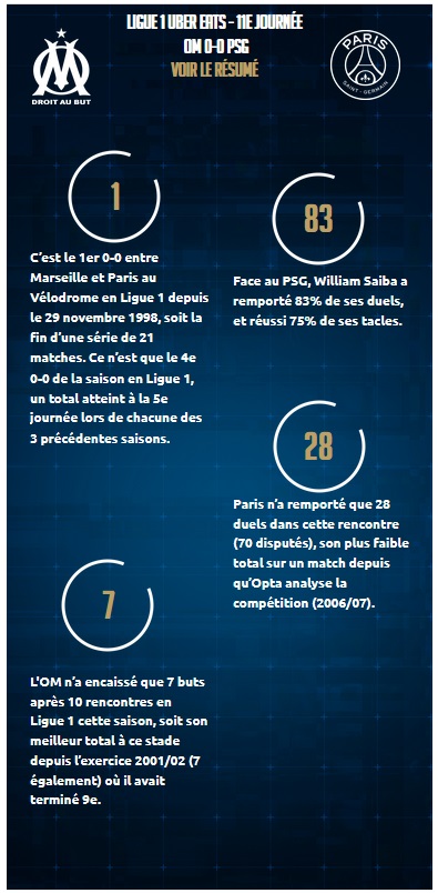 OM - PSG (0-0) : L'OM tient le choc Malgré un but refusé par le VAR pour les deux équipes et un PSG réduit à 10 en seconde période, les Marseillais et les Parisiens n'ont pas pu se départager. Le même onze de départ C'est rare, surtout lorsque l'OM enchaîne les matchs tous les trois jours comme en ce moment. Jorge Sampaoli a reconduit le même onze de départ que lors du dernier match. L'entraîneur argentin du club phocéen a aligné les mêmes joueurs que lors du match à Rome face à la Lazio, jeudi dernier (0-0). Deux buts annulés par le VAR... L'assistance vidéo n'a pas chômé pour cette rencontre entre l'OM et le PSG. Alors que les débats entre les deux formations étaient partis sur un haut niveau d'intensité, les joueurs du PSG ont cru prendre l'avantage sur un centre de Neymar dévié dans ses buts par Peres. Mais la joie des Parisiens a été de courte durée puisque le VAR a annulé le but pour un hors-jeu du Brésilien. Ce sont ensuite les Olympiens qui ont vu leur but refusé. Milik était à la réception d'un centre de Lirola, un contrôle et une frappe plus tard, le Polonais trompait Navas du gauche. Mais le VAR a constaté un hors-jeu de l'Espagnol et le score est resté à 0-0 en première période. ...Et un carton rouge grâce au VAR Sur une contre-attaque olympienne, Hakimi commettait une faute sur Ünder qui filait seul au but. L'arbitre a eu besoin de l'assistance vidéo pour voir la faute qu'il n'avait pas sifflée initialement. Après visionnage des images, il a donné un coup franc pour l'OM et a expulsé le défenseur parisien. Si le coup franc de Payet n'a rien donné, le PSG a joué les 35 dernières minutes à 10 contre 11. L'OM n'en profite pas En supériorité numérique, l'OM a fait le jeu et les Parisiens ont procédé par contre en s'appuyant sur la vitesse de ses joueurs offensifs. Sur un entre de Payet, Rongier de la tête était tout proche d'ouvrir le score. Gueye et de la Fuente sont entrés en jeu pour apporter fraîcheur et rapidité d'exécution pour les 20 dernières minutes. L'Américain s'emmêlait les pinceaux à la réception d'un centre et manquait le cadre juste avant l'entrée en jeu de Dieng et Gerson pour le dernier quart d'heure. Marseillais et Parisiens se quittent dos à dos, les deux formations prennent un point. L'OM descend du podium, doublé par Nice, son prochain adversaire, mercredi, en match à rejouer de la 3e journée de Ligue 1 Uber Eats. |