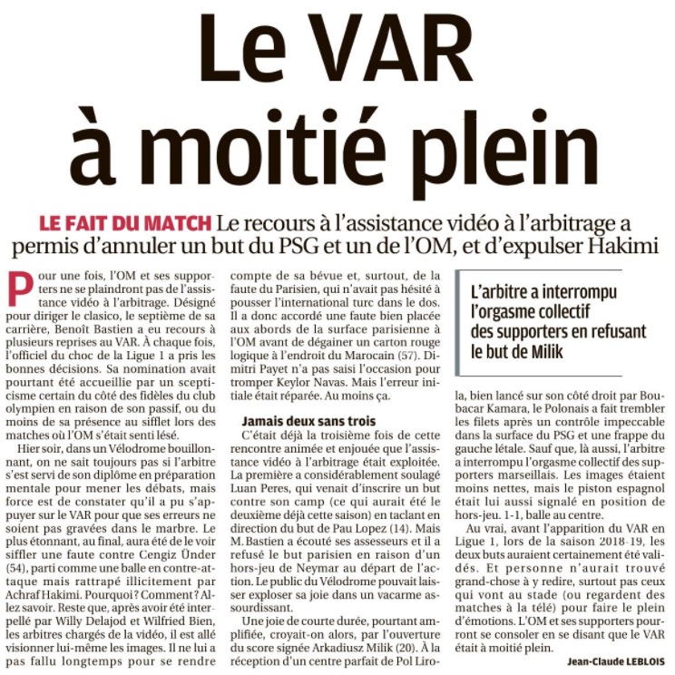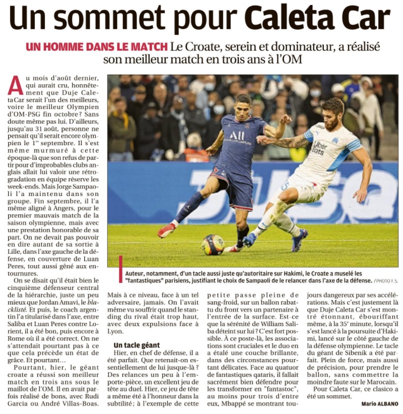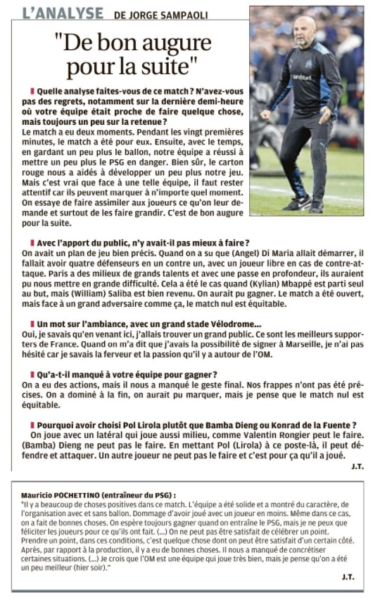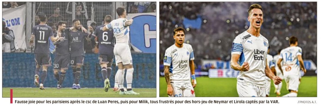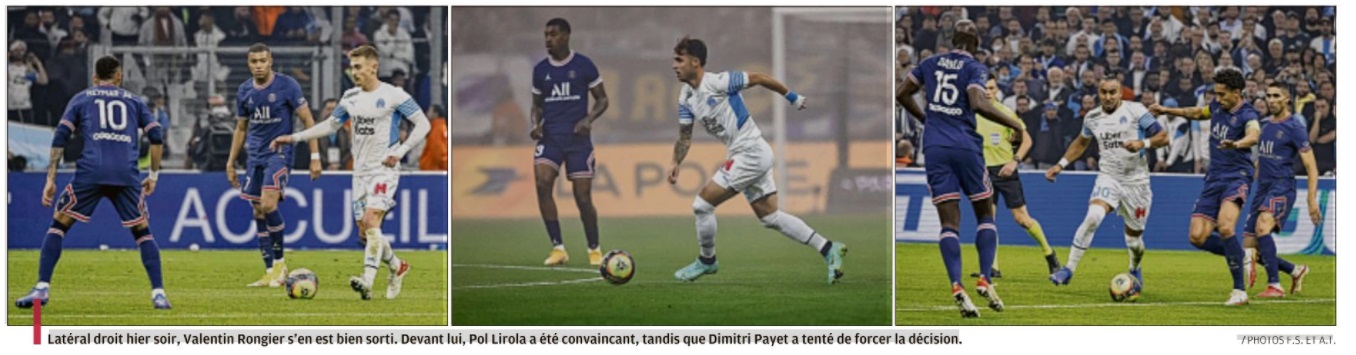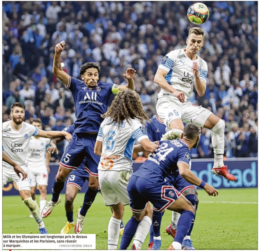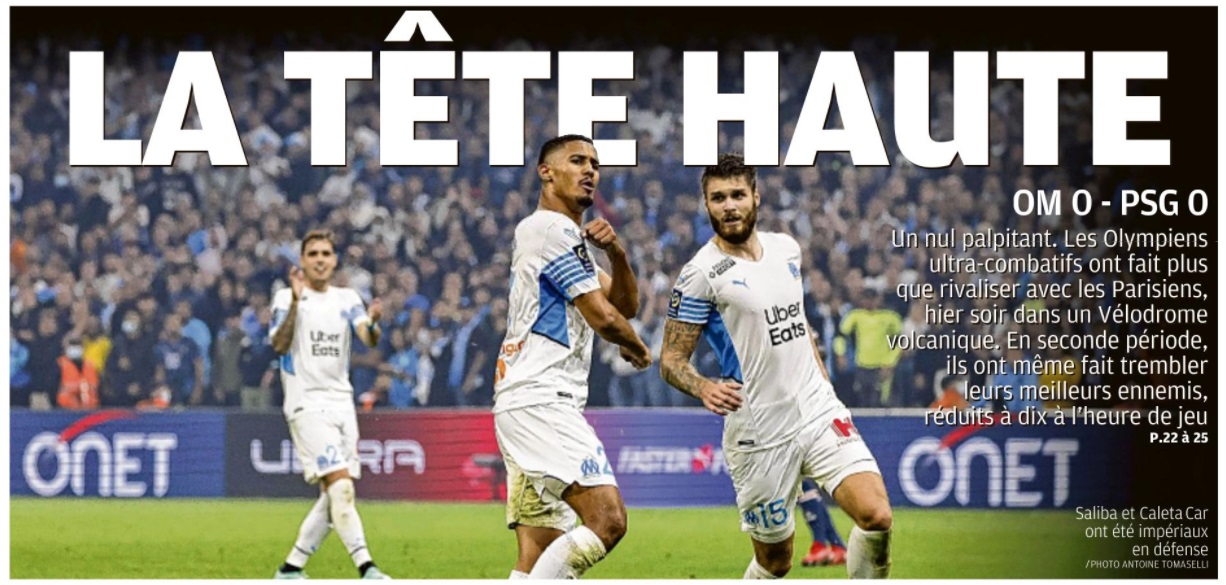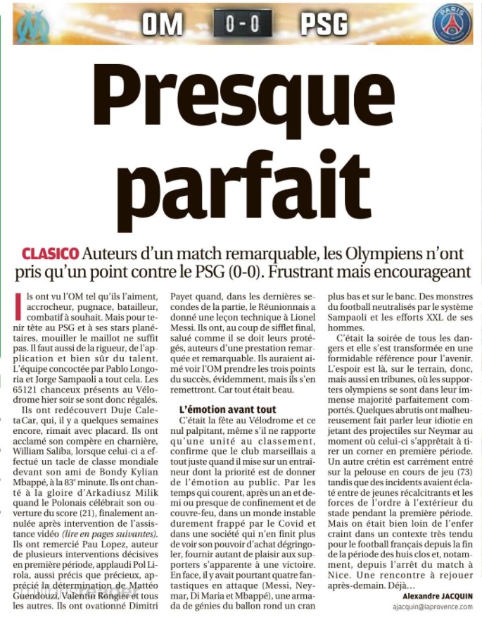 L'OM se lâche et muselle un PSG sans relief L'OM a sorti le grand jeu et obtient un bon partage des points (0 - 0). Comme à Rome, les hommes de Jorge Sampaoli ont su hausser le ton et museler une attaque parisienne parfois nonchalante. Pour ce 101e duel OM - PSG , avec Jorge Sampaoli aux commandes, le peuple marseillais espérait bien que cette fois serait la bonne. Que l'OM s'offrirait une 33e victoire face à son meilleur ennemi, dix ans après sa dernière au Vélodrome. Que le club aux dix sacres et une Ligue des Champions serait plus inspiré que celui aux neuf titres et une coupe des Coupes. Finalement, c'est le statut quo. Dans les faits, les Olympiens auront eu le mérite d'appliquer les consignes de leur entraîneur. En allant chercher haut les Parisiens. En essayant de priver de ballon leur rampe de lancement Marco Verratti, ils démontraient leur capacité à tenir tête à un PSG étoilé. La présence de Lionel Messi, Kylian Mbappé et Neymar n'impressionnait pas le trio défensif provençal. Quant à Pau Lopez, dans la continuité de sa prestation romaine, il s'offrait un petit plaisir, en claquant en corner une tête à bout portant de Lionel Messi (26). Le Vélodrome, bouillonnant à souhaits, proche parfois de la surchauffe, se régalait, dans une première période intense. Dans laquelle les vingt-deux acteurs se donnaient à fond. Lorsque Benoît Bastien renvoyait les acteurs aux vestiaires, il ne manquait que les buts pour lancer définitivement ce match. Deux avaient pourtant été inscrits, Neymar provoquant un but contre son camp de Luan Pere (14). En réponse, Arek Milik, mis sur orbite par un Pol Lirola retrouvé, scotchait Keylor Navas sur sa ligne (21). Dans les deux cas, l'assistance vidéo annulait les deux actions. Le VAR allait à nouveau jouer un rôle en seconde période. Il entraînait l'expulsion d'Achraf Hakimi qui laissait le PSG terminer à dix. Dans un match qui perdait quelque peu en intensité. Notamment du fait que les Parisiens avaient visiblement levé le pied. La perte de Marco Verratti juste avant la pause, plus l'infériorité numérique après la 55e minute de jeu, n'arrangeait pas une situation qu'ils sentaient leur filer entre les mains. Lionel Messi totalement absent. Kylian Mbappé en mode cabotin, les Parisiens en arrivaient à gérer un match sur lequel ils n'avaient plus aucune prise. Dommage que l'OM n'ait pas su, ou pu en profiter. Car dans la dernière demi-heure, il y avait plus d'espaces dans lesquels Dimitri Payet ou Mattéo Guendouzi n'ont pas su aller jusqu'au bout de leurs (bonnes intentions). Le Réunionnais ne montrant même un peu trop gourmand, en cherchant le penalty face à Presnel Kimpembé, alors qu'il aurait pu mieux évaluer la situation. Quant à Valentin Rongier, à l'image de Lionel Messi en première période, il claquait une tête. Qui filait à quelques centimètres sur la gauche du but de Keylor Navas, alors que le gardien du PSG semblait battu (66). L'OM sentait l'exploit à portée de main. Mais après les sorties de Cengiz Ünder et Arek Milik, sa force de frappe perdait un peu de puissance. Ce qui permettait à la défense parisienne de souffler un peu et s'accrocher à un 0 - 0 qui lui permet de sauver les apparences. Rongier a eu la balle de match à la 66e , mais il ne cadre pas sa tête Auteur : Michel Garoscio |