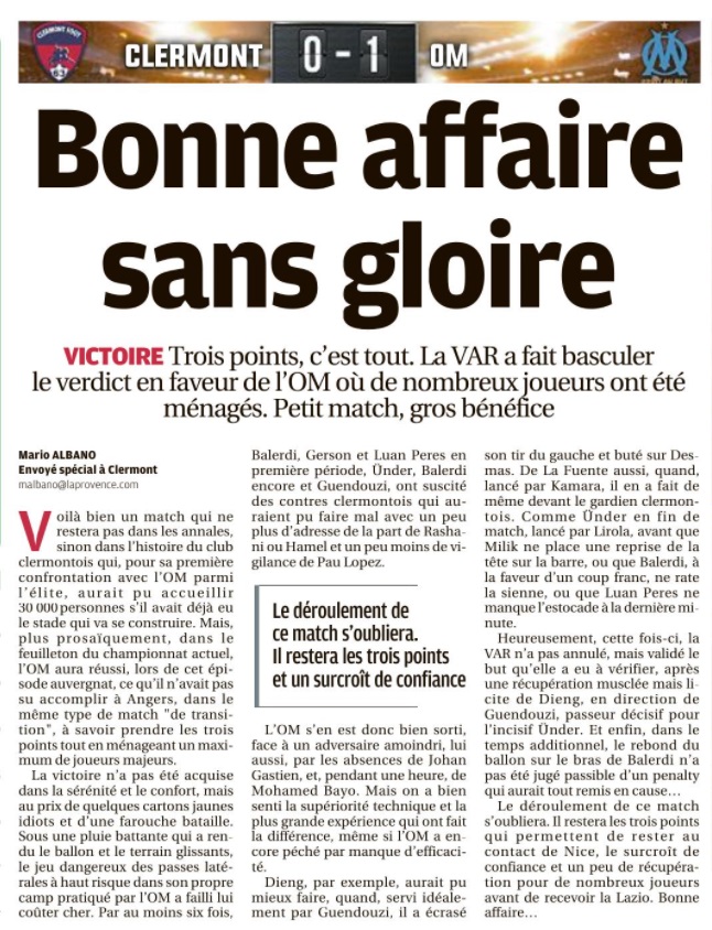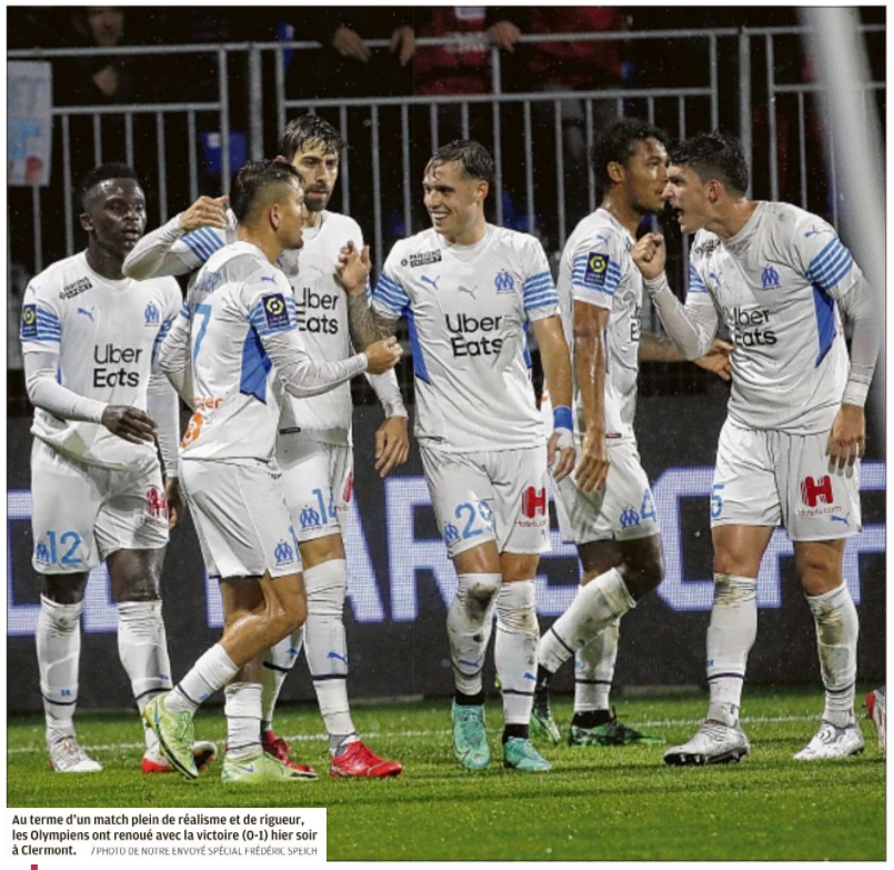 Le onze de départ olympien : Saliba, Balerdi, Peres - Lirola, Kamara (cap), Guendouzi, Gerson, De la Fuente, Dieng. Under ouvre le score Sous une pluie battante, les Olympiens ont d'abord observé les Clermontois pendant les dix premières minutes. Une fois l'orage passé, les Olympiens ont mis le pied sur le ballon et Dieng était tout proche d'ouvrir le score. Sur une talonnade de Guendouzi, l'attaquant olympien perdait son duel face à Desmas. Dix minutes plus tard, Under ne laissait aucune chance au portier clermontois. Dieng récupérait le cuir au milieu de terrain, lançait Guendouzi qui libérait pour Under. Le Turc enroulait du gauche et trompait Desmas pour l'ouverture du score. Sampaoli lance ses cadres Au retour de la pause, les Olympiens étaient tout proche d'aggraver le score par De la Fuente mais l'Américain butait sur Desmas. À l'heure de jeu, Jorge Sampaoli lançait ses cadres Payet et Milik. Le numéro 9 olympien s'offrait une énorme occasion mais sa tête était claquée magnifiquement par Desmas, auteur d'un grand match. L'arrêt de Pau Lopez Après 69 minutes de jeu, Pau Lopez effectuait un arrêt déterminant devant Allevinah. En deux temps, le portier marseillais empêchait Clermont de recoller au score. Les Olympiens dominaient la fin du match mais ne parvenaient pas à marquer un deuxième but. La réalisation d'Ünder en première mi-temps a suffi pour empocher les trois points de la victoire. L'OM sur le podium Cette victoire à Clermont permet aux Olympiens de monter sur le podium. Avec 22 points, ils profitent du faux-pas de Lens pour passer devant les Nordistes au classement. Les hommes de Jorge Sampaoli retrouvent le goût de la victoire à l'extérieur. Place désormais à l'Europa League et la réception de la Lazio Rome dans quatre jours, avant d'affronter Metz à l'Orange Vélodrome, dimanche 7 novembre à 13 heures.