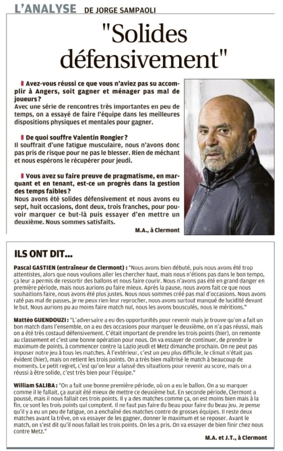OM : la victoire du pragmatisme à Clermont Même si elle est obtenue par le strict minimum, les Olympiens ont fait le boulot en allant s'imposer à Clermont-Ferrand, dimanche. Un succès qui leur permet de remonter sur le podium provisoire. Un classement loin d'être anecdotique pour les joueurs. Après douze journées de championnat et une victoire arrachée à Clermont-Ferrand, l'OM est remonté sur la troisième marche du podium de la Ligue 1. Pour William Saliba, cette position n'est pas un simple symbole. " Il y avait une bonne opération à faire ce soir [dimanche] et oui, c'est important d'être troisième, pour rester au contact de Nice. " Nice qui est allé s'imposer à Angers (2-1) et s'est emparé de la deuxième place. L'OM est désormais en embuscade, derrière les Aiglons. La victoire ramenée de Clermont-Ferrand arrive au bon moment. Car non seulement les Niçois ne baissent pas le pied, ce qui fait du point ramené par les Phocéens face à eux lors de la mise à jour du calendrier un très bon point. Alors que, dans le sillage des Azuréens, d'autres rivaux maintiennent la pression dans la quête du podium. Si Lens et Rennes ont été freinés, ils restent au contact, juste derrière les Olympiens. Il y a également Lyon, le " diesel " de la Ligue 1, qui trouve petit à petit ses repères et s'est invité dans la course. Pour l'OM, il ne fallait donc pas rater le train. Et la victoire à Gabriel-Montpied arrive au bon moment. Un résultat que les Phocéens ont dû aller chercher en faisant preuve de pragmatisme, en marquant par Cengiz Ünder sur la première occasion franche. Un pragmatisme allié à une solidité défensive que souligne Jorge Sampaoli. " Nous avons été solides défensivement... Je ne peux qu'en être satisfait car c'est ce que je voulais. " Son équipe aurait toutefois dû se mettre à l'abri pour s'éviter une fin de match compliquée, lorsque Pascal Gastien a joué son va-tout offensif pour tenter d'arracher un point. " À l'extérieur, si tu tues pas le match, tu prends le risque de laisser la possibilité à l'adversaire de revenir ", reconnaissait Mattéo Guendouzi en zone mixte. C'est lorsque Dimitri Payet et Arek Milik sont entrés en jeu que l'OM a eu les munitions pour se mettre à l'abri. Malheureusement, le sort ne leur a pas été favorable. Notamment pour le Polonais, qui a trouvé la transversale d'Arthur Desmas. " Nous avons quand même gagné avec la manière en maîtrisant le match à plusieurs moments... Nous avons été solides en défense avec un " clean sheet " et c'est très bien pour l'équipe ", termine Mattéo Guendouzi. Les Olympiens ont su cette fois mieux s'adapter aux rotations de Jorge Sampaoli. L'Argentin a effectué sept changements par rapport au match face à Nice. " En français, on dit " comme d'habitude ! " " a plaisanté, en anglais, Luan Peres. " Il le fait tout le temps, il change toujours les joueurs parce qu'il en a beaucoup de bons, pas seulement onze. Il change et l'équipe continue à être bien, à progresser. " Dans l'optique de la réception de la Lazio, jeudi en Ligue Europa, ce résultat est encourageant. Sachant que l'OM devra impérativement gagner. Auteur : Michel Garoscio |